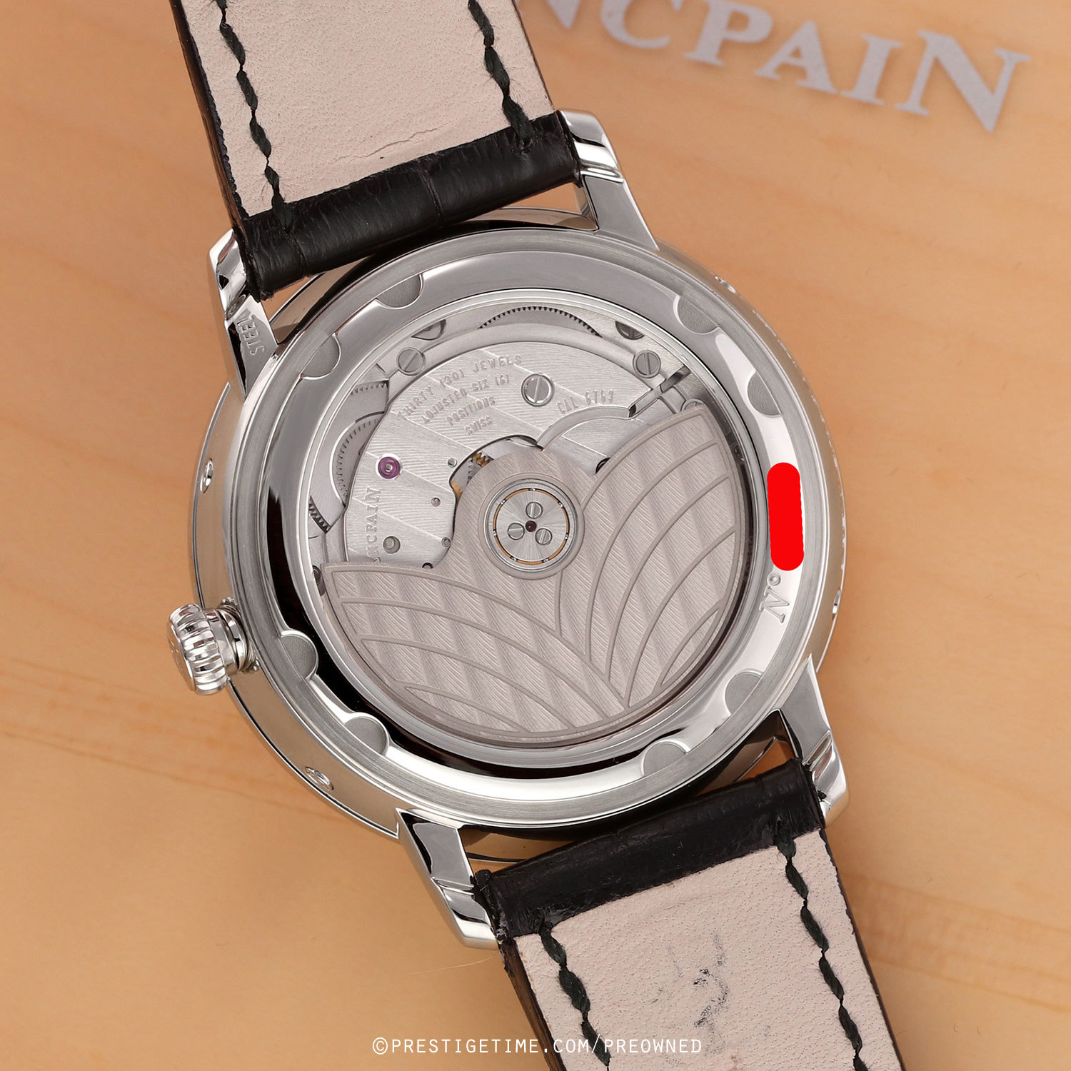 Movement: Powered by a Blancpain caliber 6763, beats at 21,600 vph (3Hz), contains 30 jewels & has an impressive power reserve of 100 hours (4+ days).