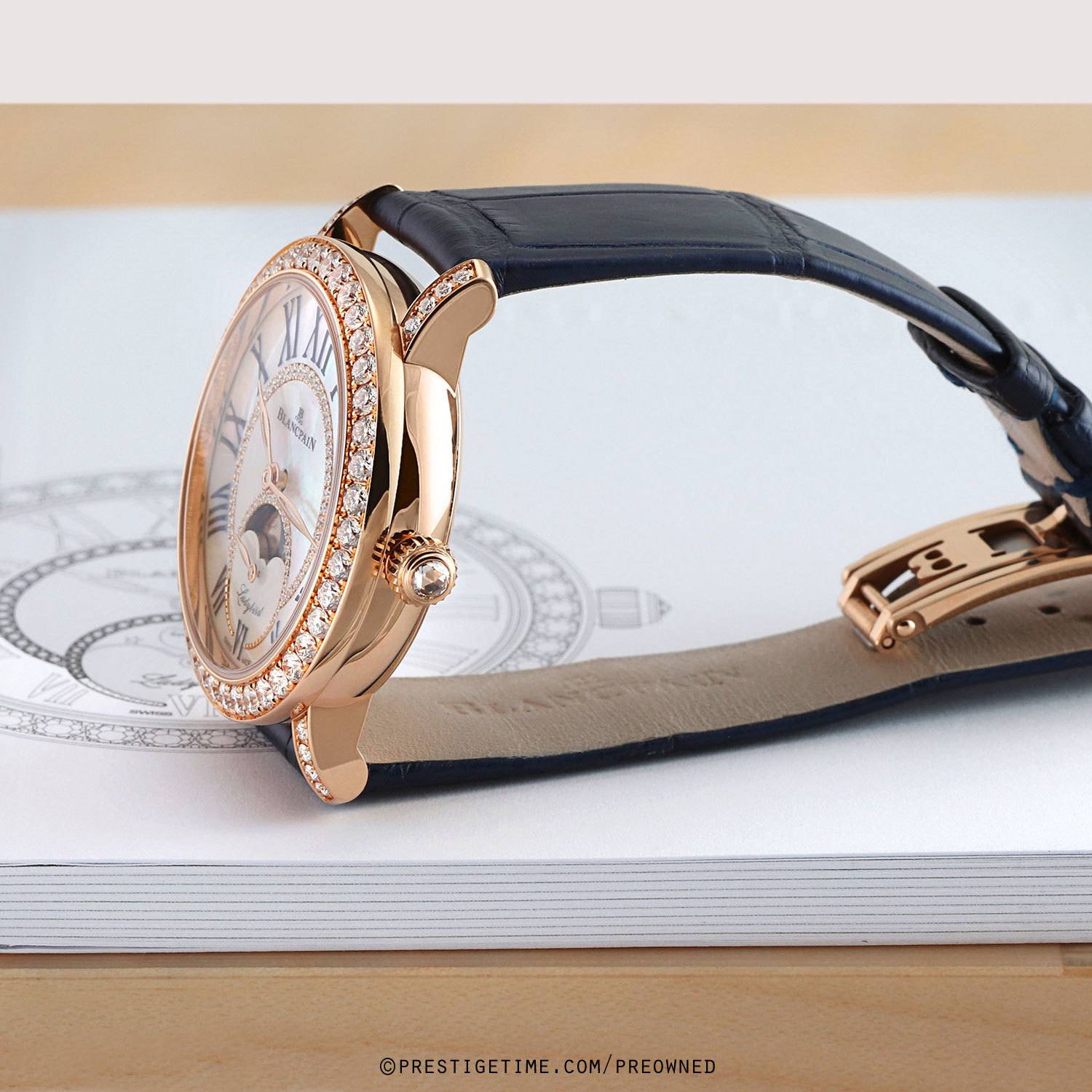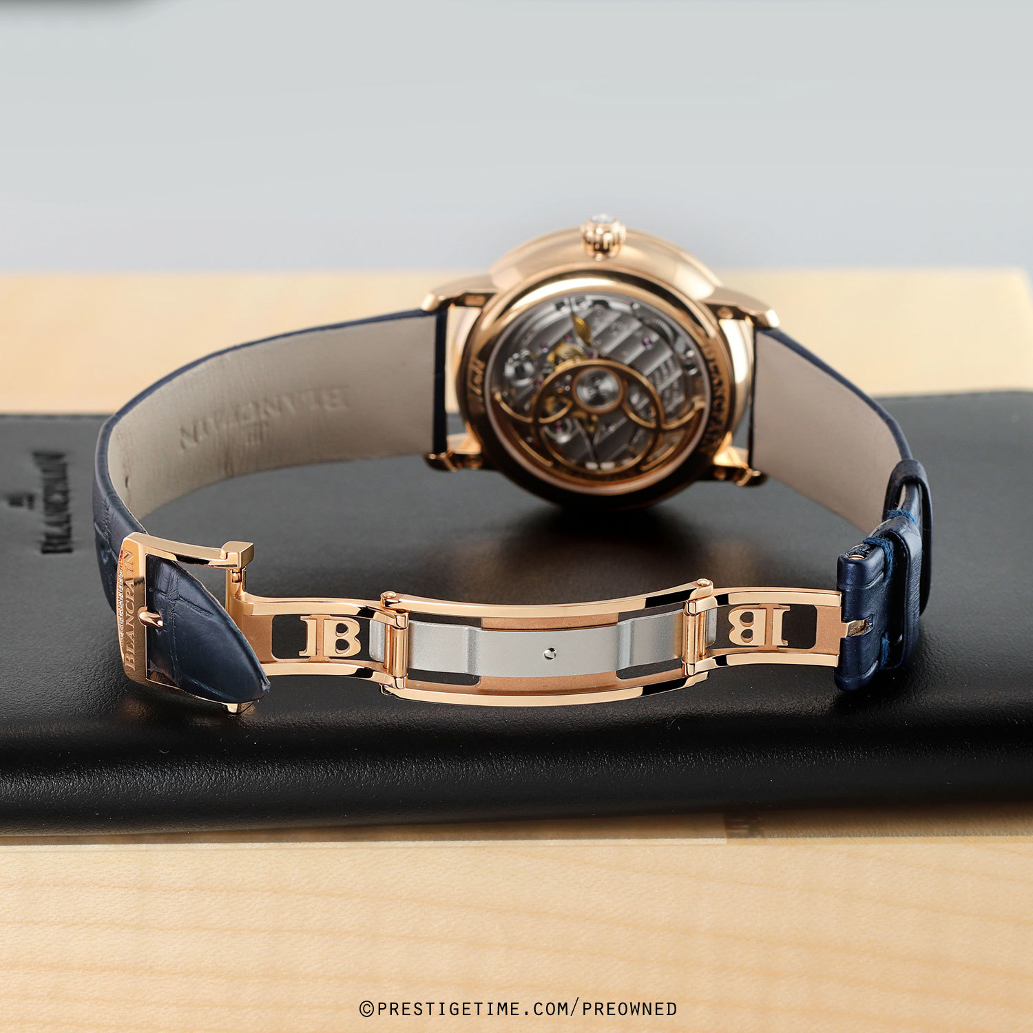 - Fitted on its original Blancpain midnight blue alligator leather strap with a solid 18kt rose gold butterfly style deployant buckle set with 9 diamonds. The strap is in excellent, near new condition with the vast majority of it wear lifespan remaining. We would be comfortable rating the strap as in 98% overall condition.