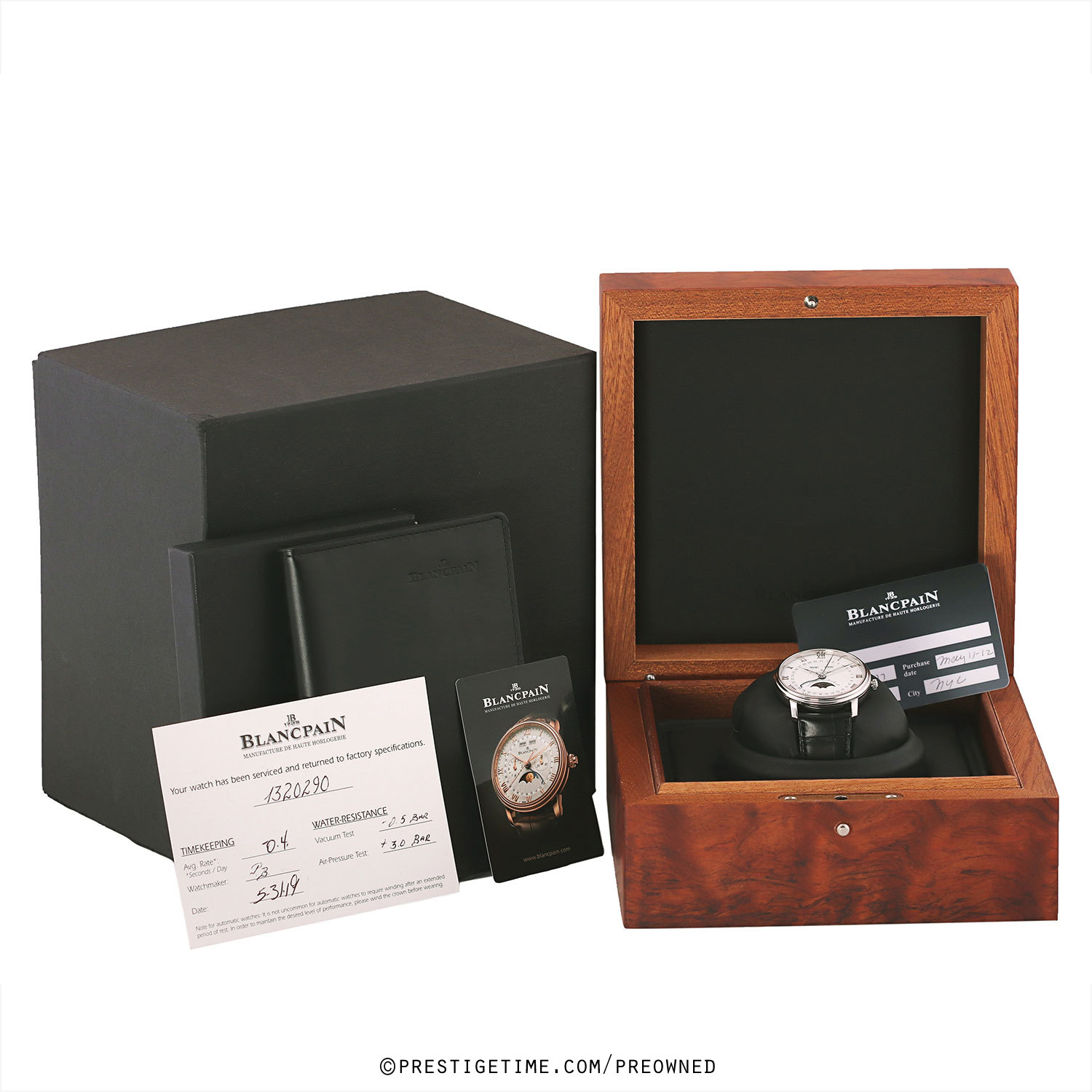 Condition: In excellent near new condition. The watch was last factory serviced May 2019. It has been worn seldom & carefully since its last service. The watch beats strong & keeps accurate time. We have had the watch lightly polished to remove most signs of wear. Delivered an original Blancpain parquet wood box, with all papers & the 2019 service card.