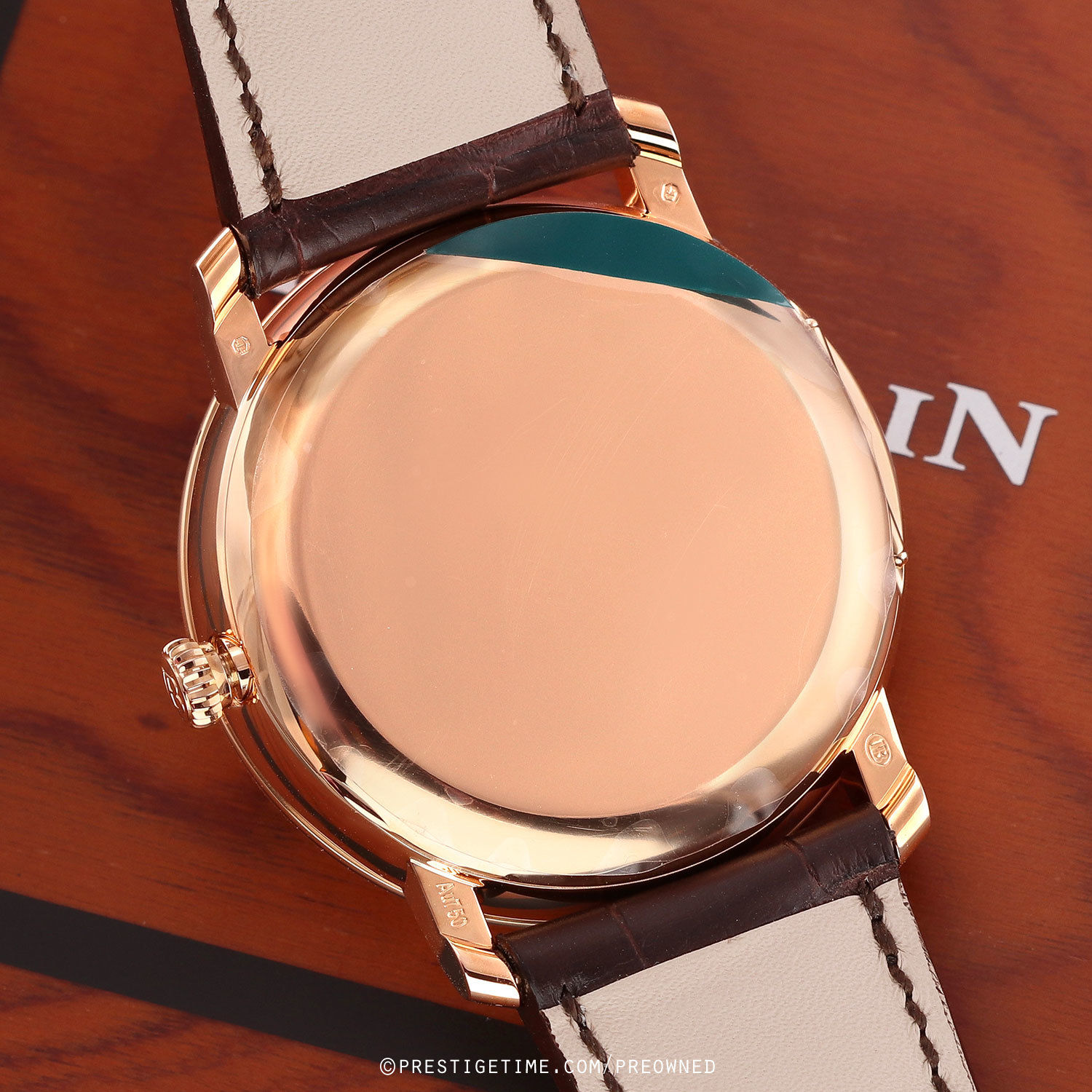 Villeret Quantieme Complete Calendaer "Demi-Savonnette", half hunter case back: featuring a solid 18kt rose gold hinged case back, which opens to a transparent case back.