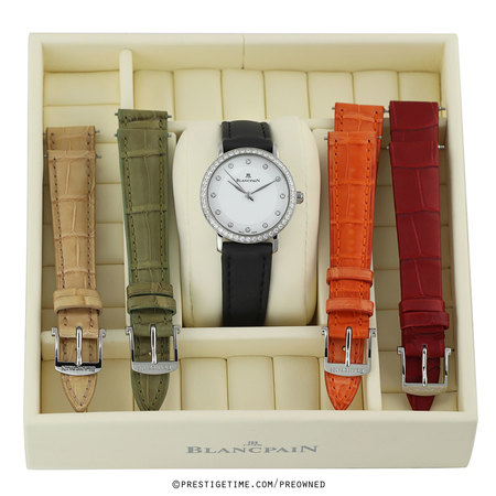 Case: Polished stainless steel case. Bezel is factory set with a single row of 48 diamonds. White dial set with 12 diamond hour markers. Polished hands.