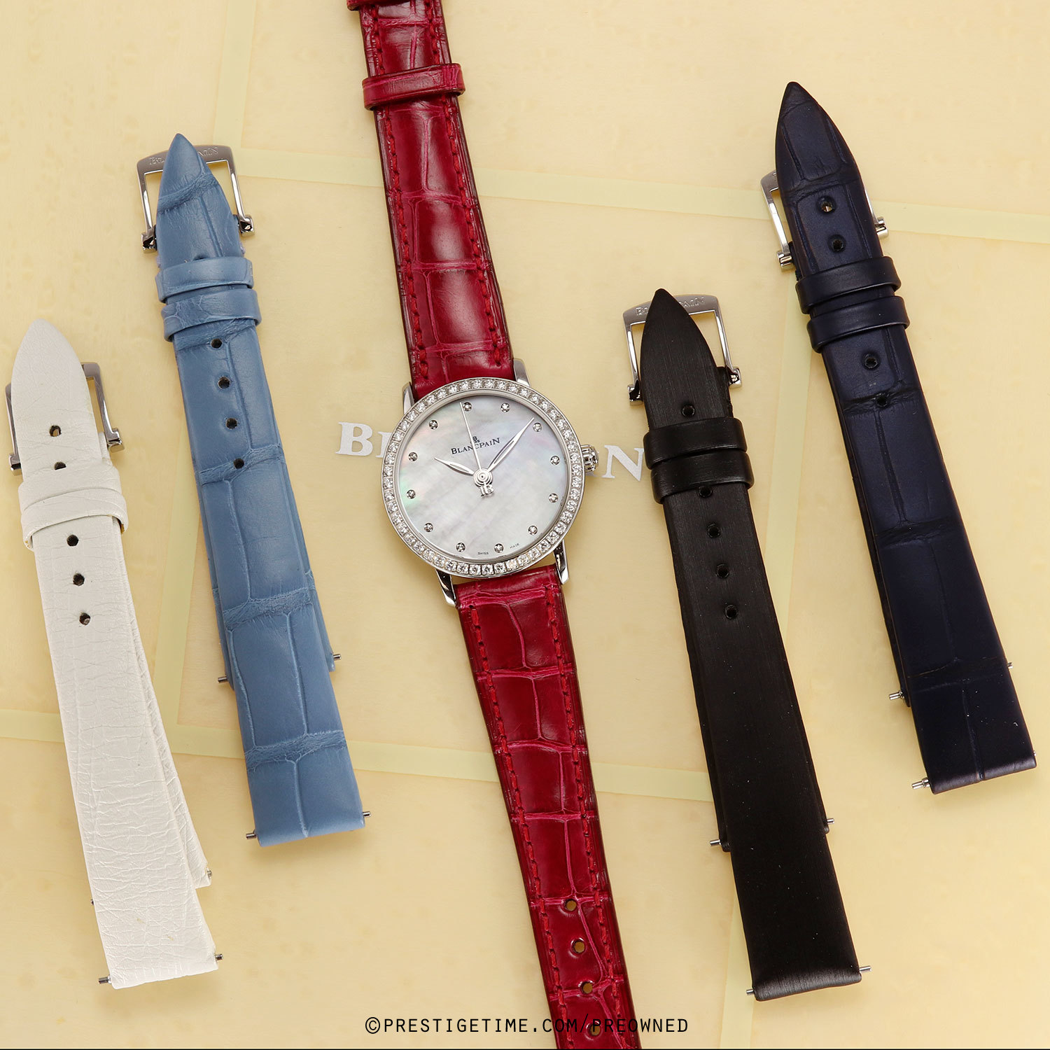 Strap: Deliver with a set of 5 straps. Each strap is fitted with quick release pins for easy changing and with a polished branded tang buckle: