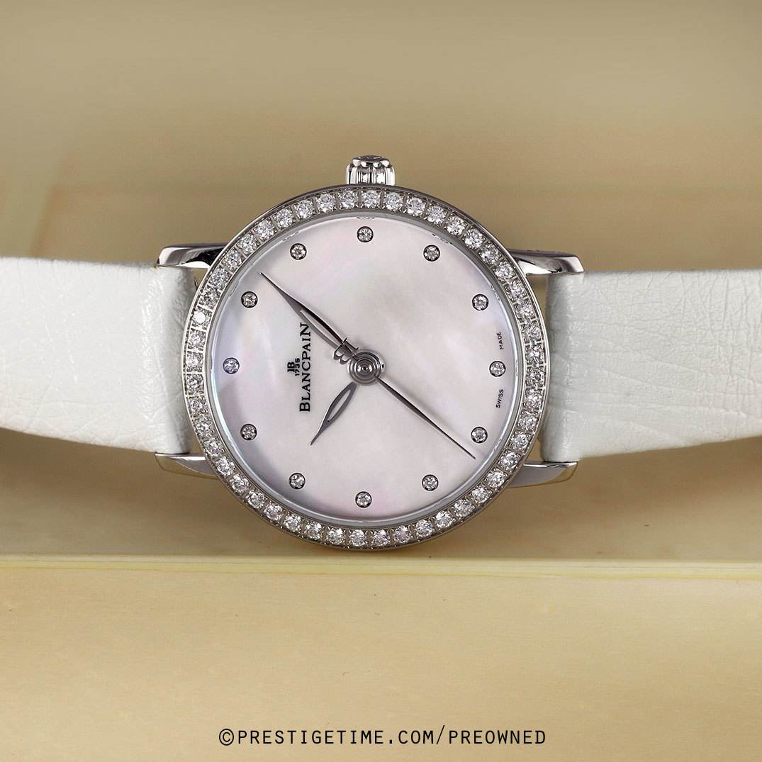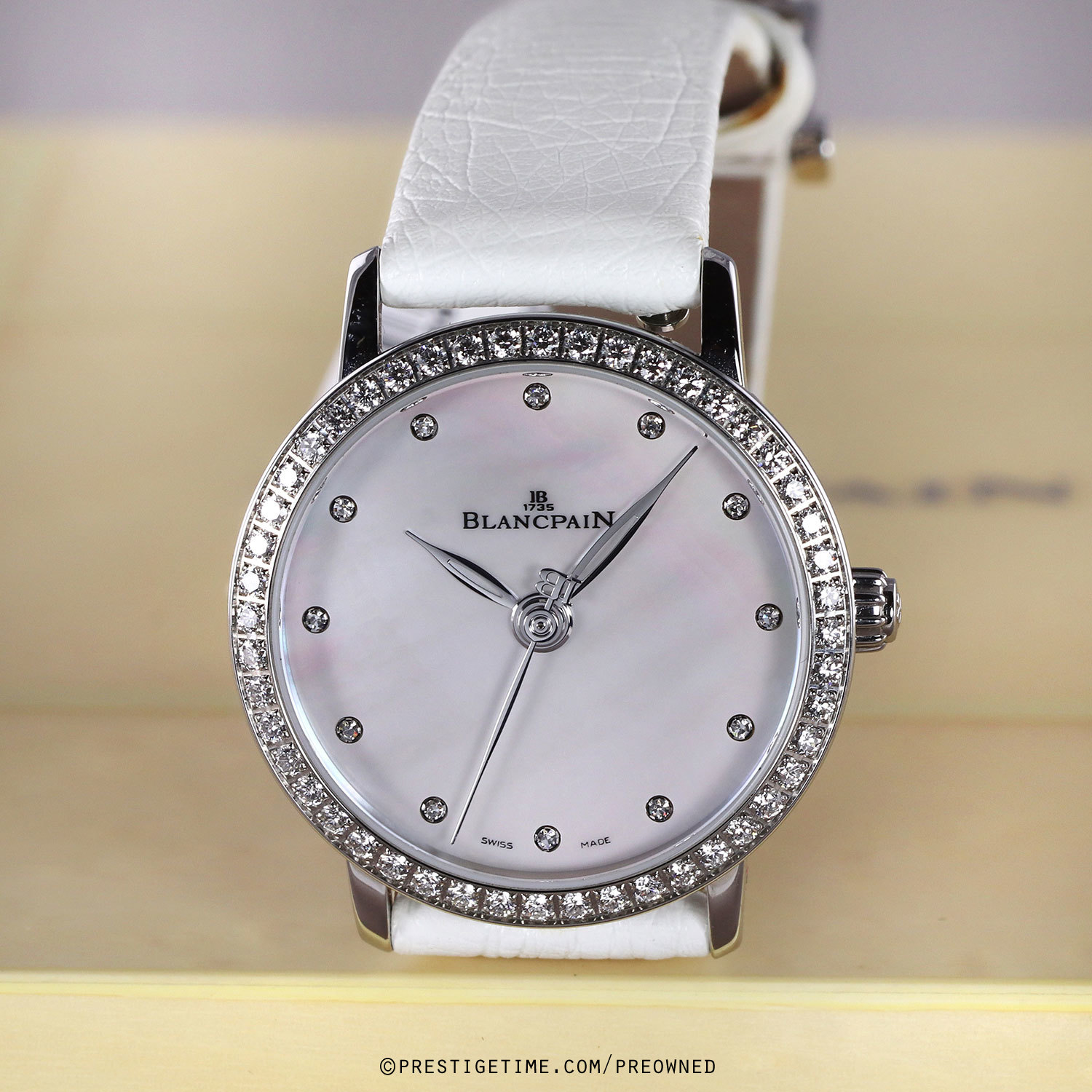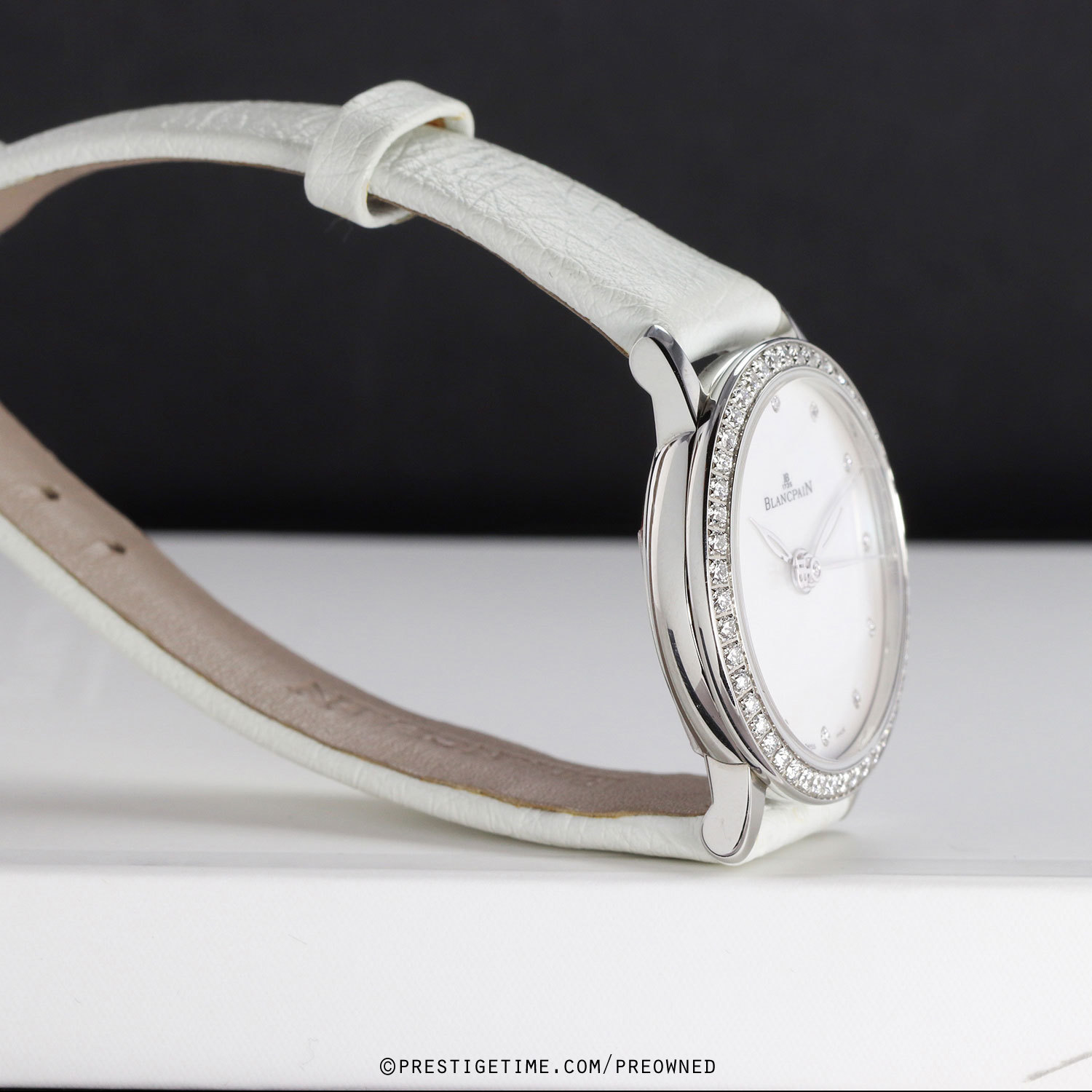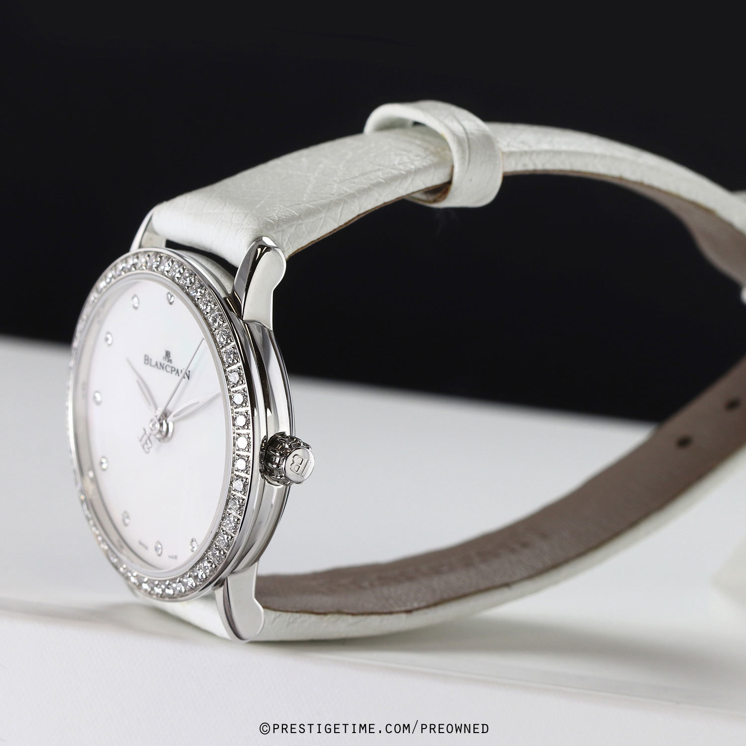 Case: Polished stainless steel case. Bezel is factory set with a single row of diamonds. Mother of pearl dial with 12 diamond hour markers. Polished hands.