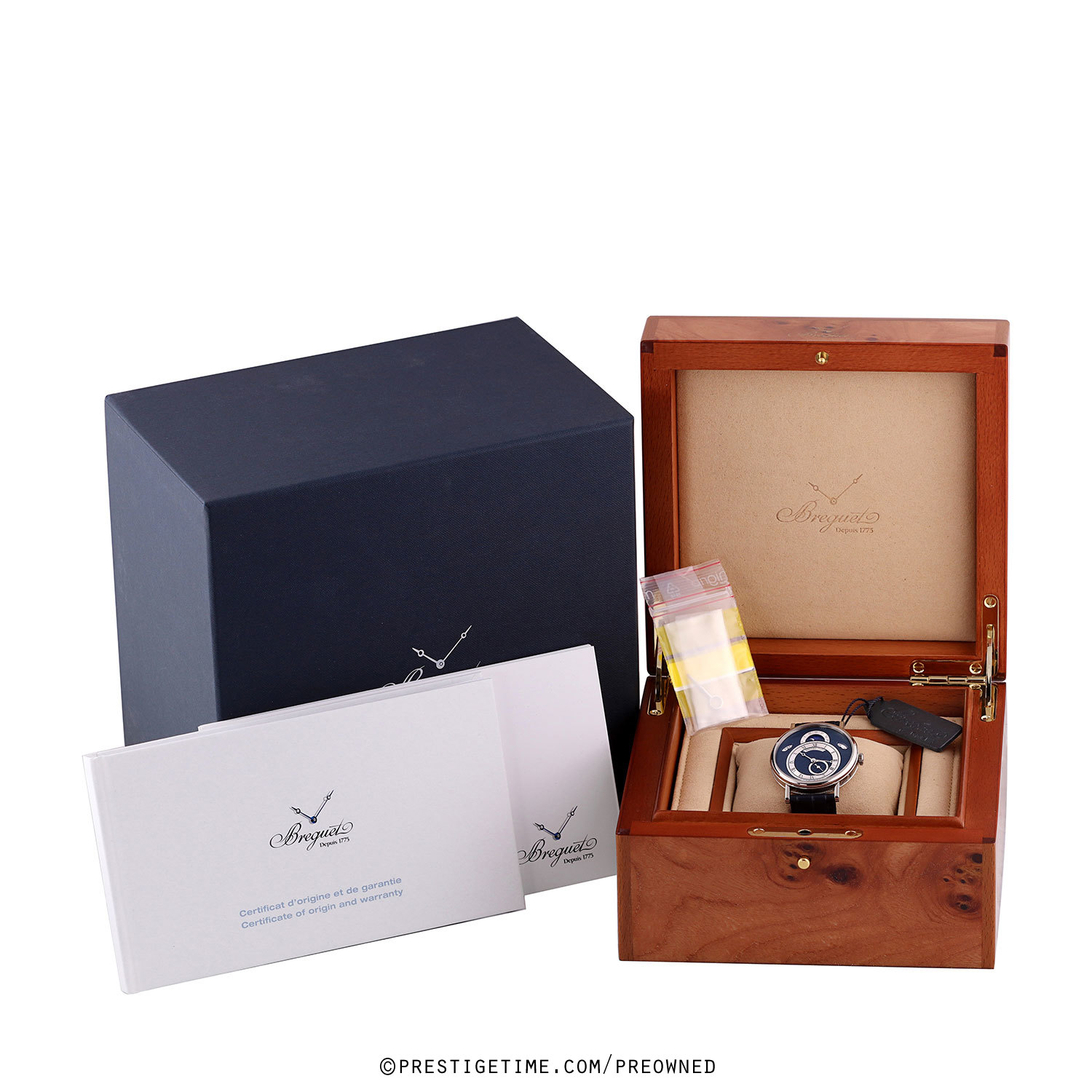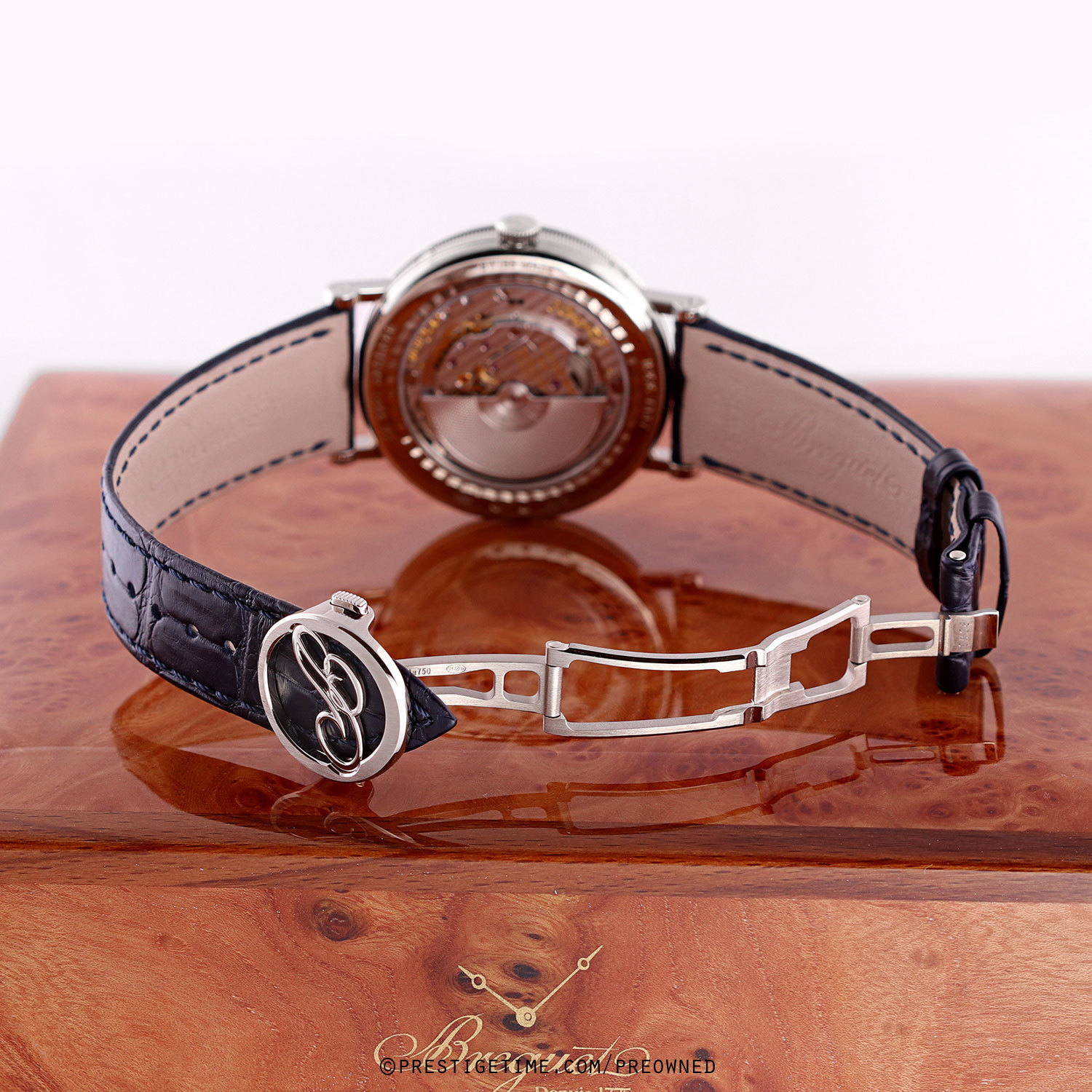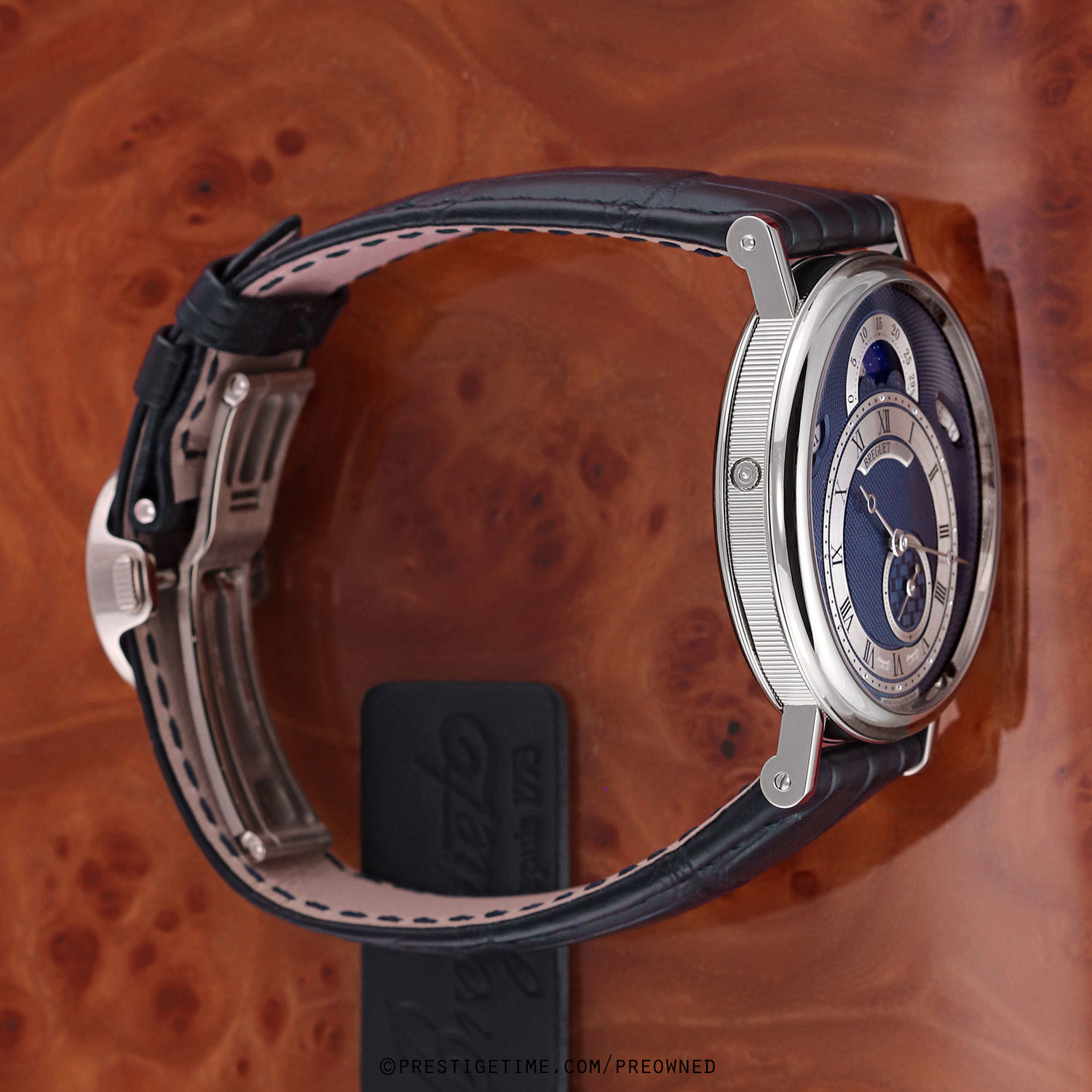 Case: Polished 18kt white gold case with Breguet's signature coined case-edge. Blue dial, hand engraved with three different guilloche patterns. Offset time dial & small seconds sub-dial with fine black painted markers on a flat silvered chapter ring. Polished Breguet style hands.