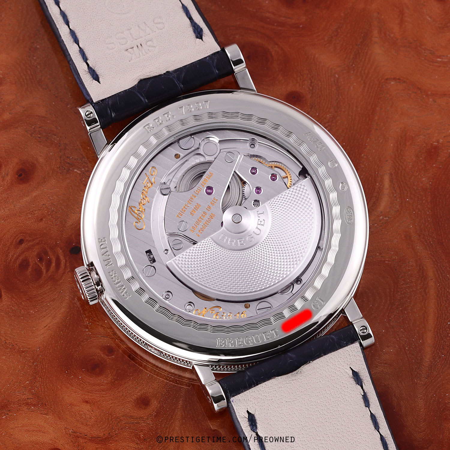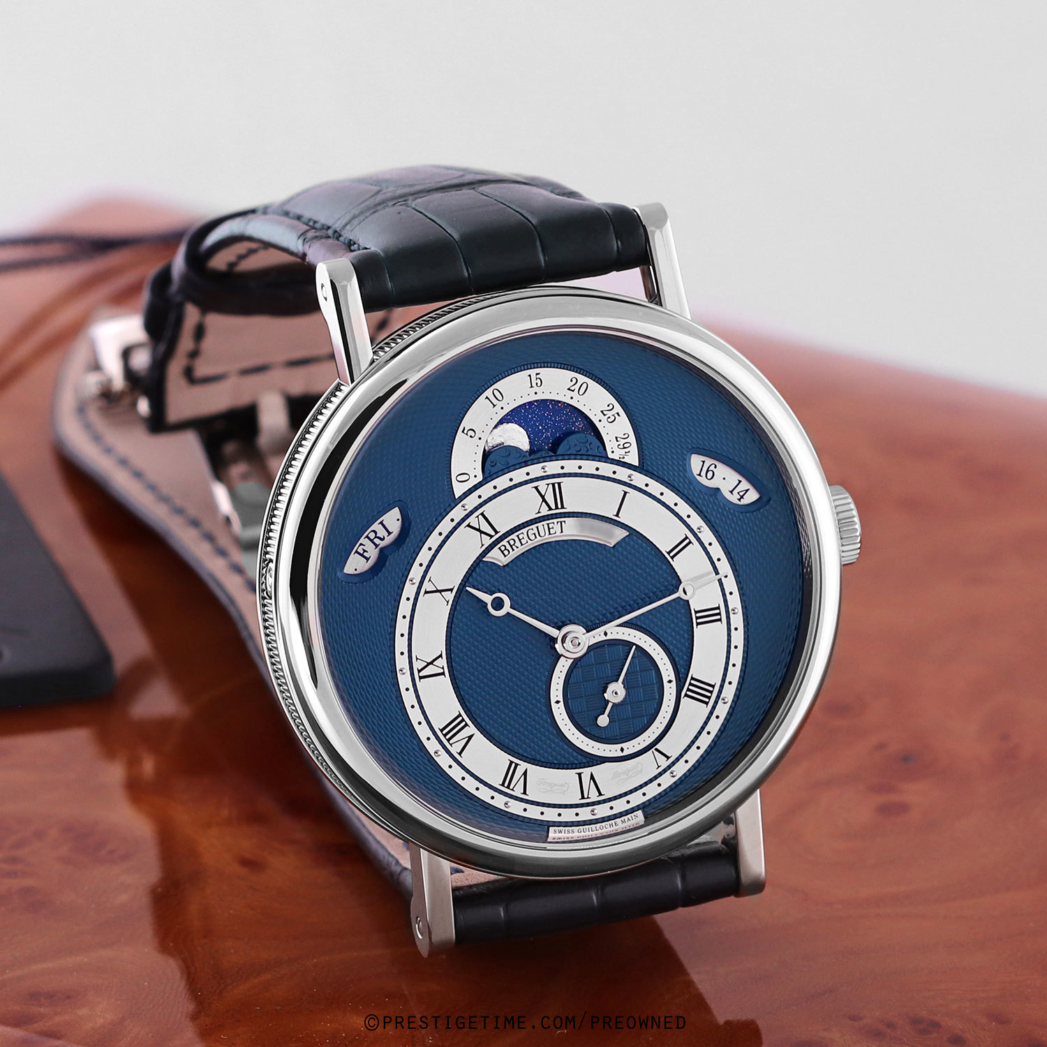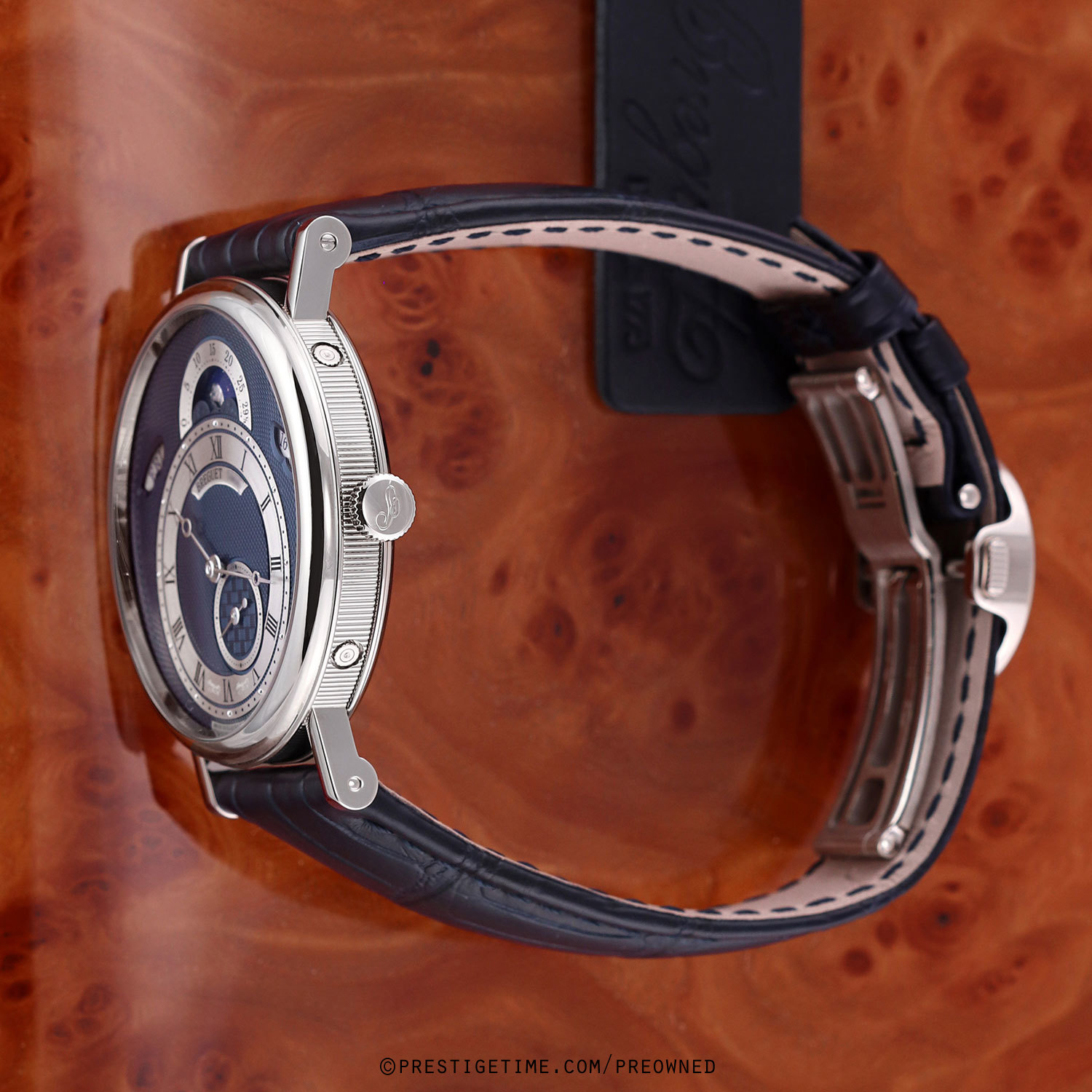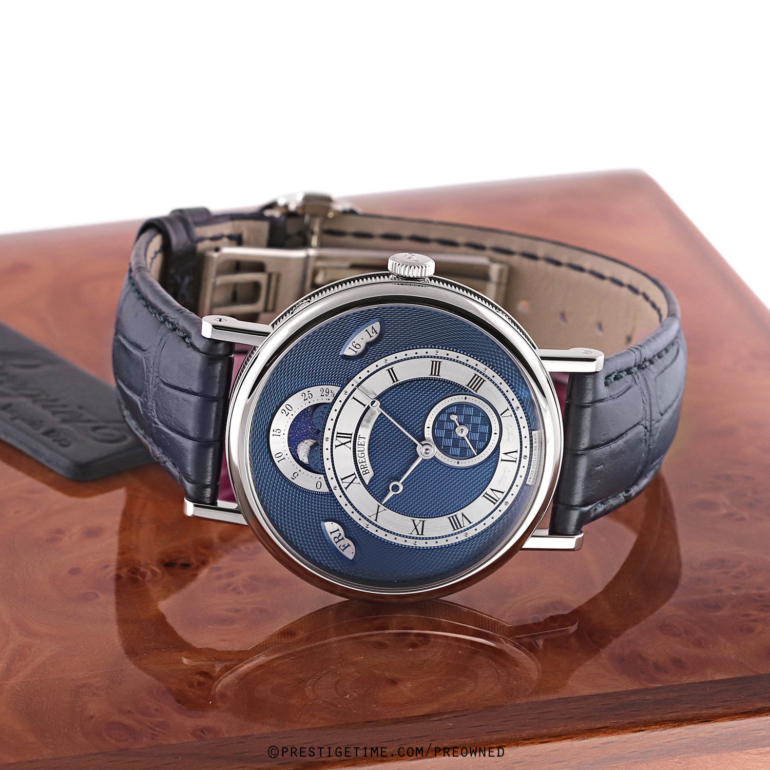 Case: Polished 18kt white gold case with Breguet's signature coined case-edge. Blue dial, hand engraved with three different guilloche patterns. Offset time dial & small seconds sub-dial with fine black painted markers on a flat silvered chapter ring. Polished Breguet style hands.