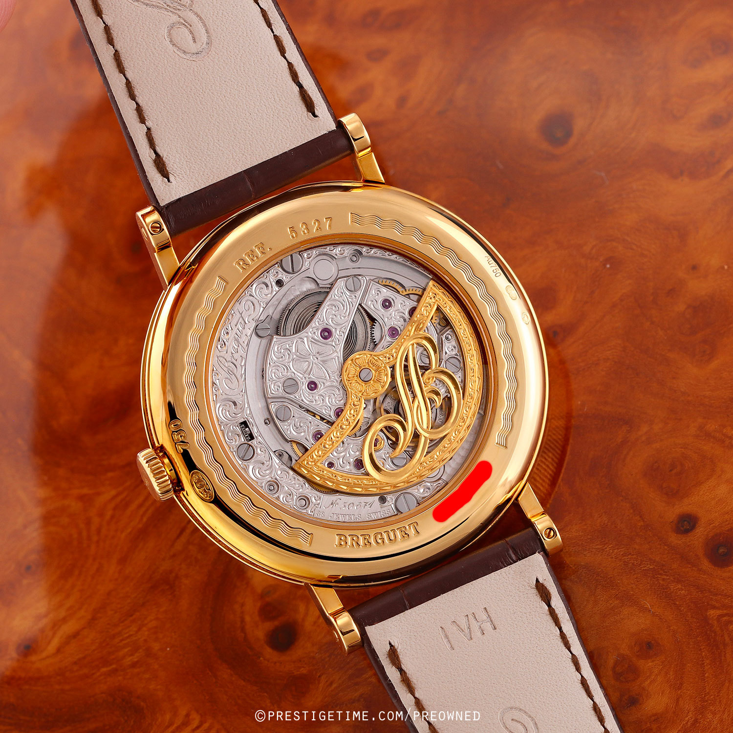 502.3 DRP1, beats at 21,600 vph (3Hz), contains 38 jewels & has a power reserve of 45 hours. The movement plates & solid 22kt rose gold rotor are exquisitely decorated with hand-engraved elaborate designs.
