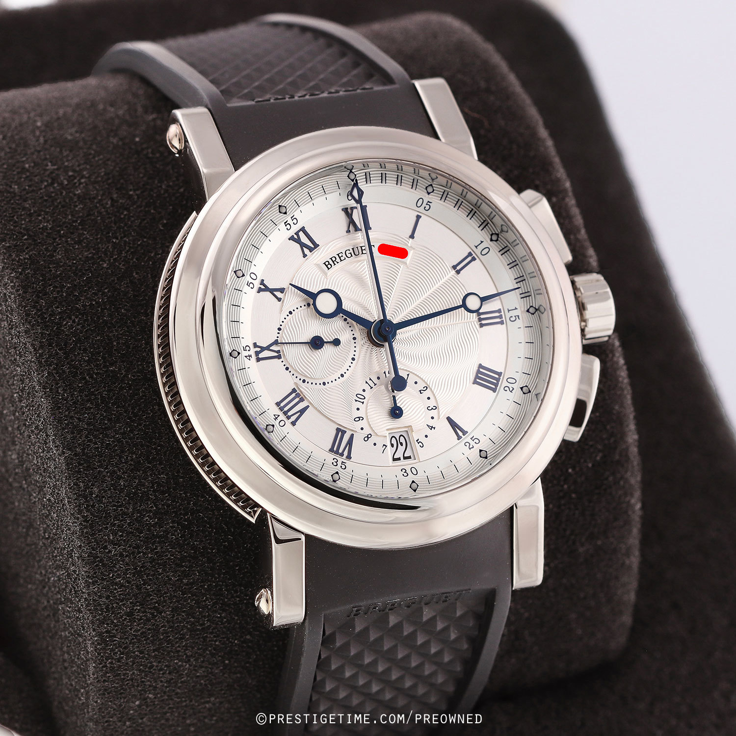 Condition: In excellent near-new condition. The watch completed a full factory service in mid October 2023 and has not be worn since the service was completed. As part of the service Breguet has polished the watch & fitted it with a brand new rubber strap. We would now be comfortable rating this watch in an 95% overall condition. Delivered in its original box with all original papers. A copy of the factory service letter & a branded Breguet service pouch is included.