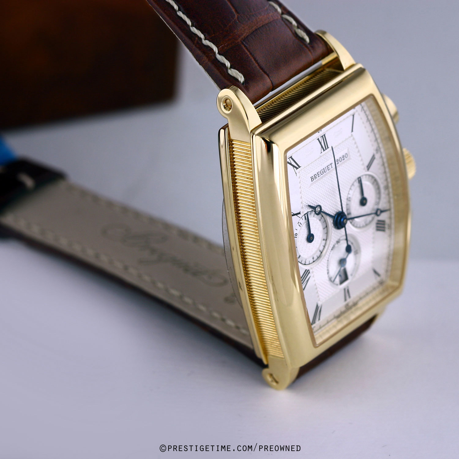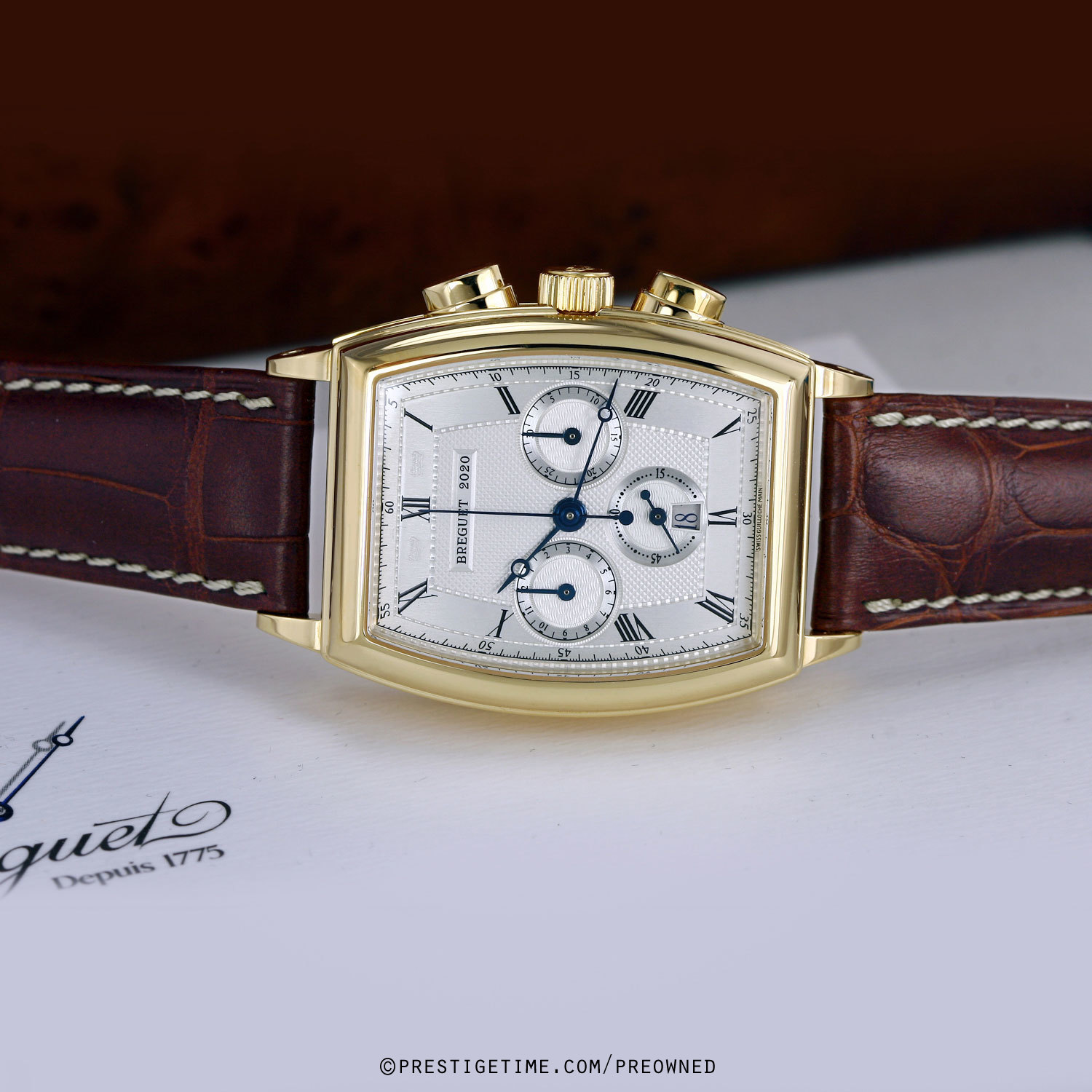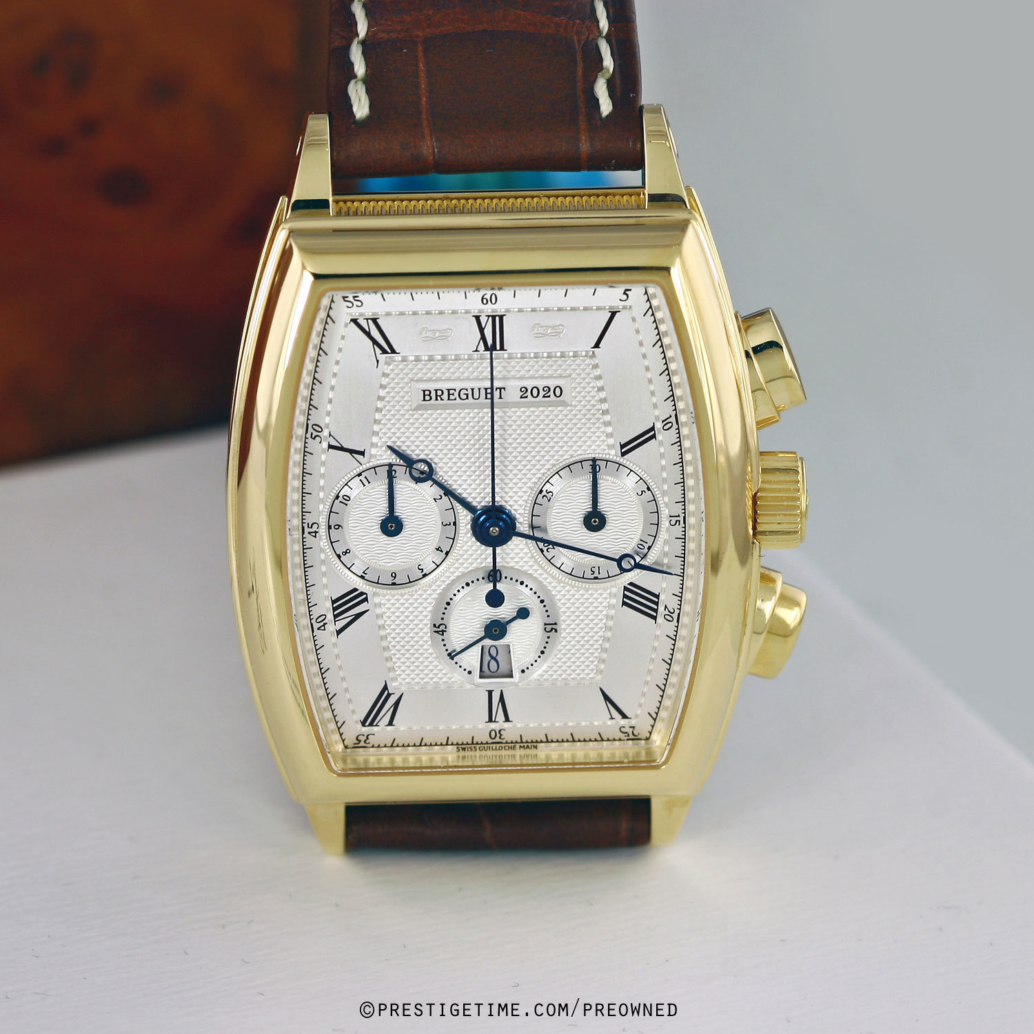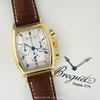 Case: Solid 18kt yellow gold case with Breguets signature coined case-edge. Silver dial with a variety of beautiful guilloche pattern finishes. Black printed Roman Numeral hour markers. Fine printed minute/seconds & fractions of a second track. Blued steel Breguet style hands. Small seconds sub-dial & date window at 6 o'clock. Chronograph: Column wheel mechanism. Central seconds counter hand, 30 minute counter sub-dial at 3 o'clock, 12 hour counter sub-dial at 9 o'clock.