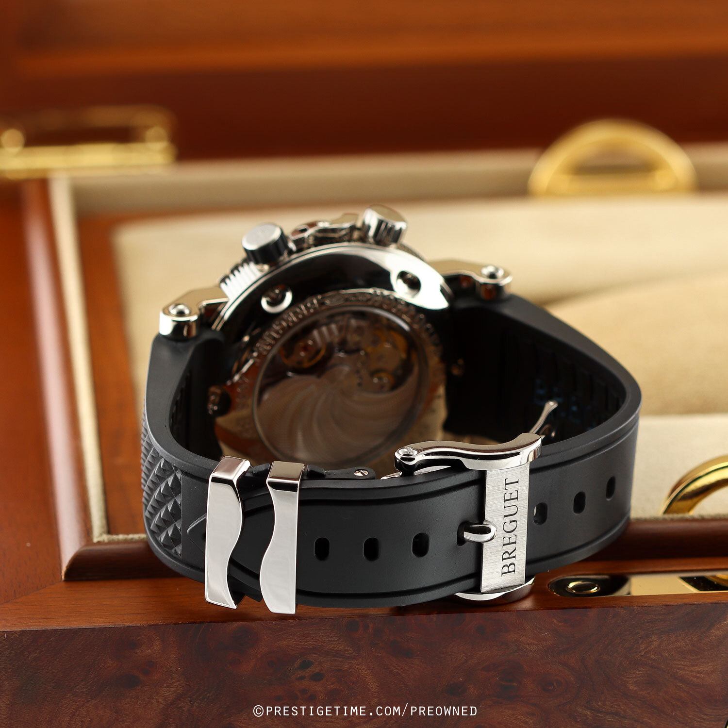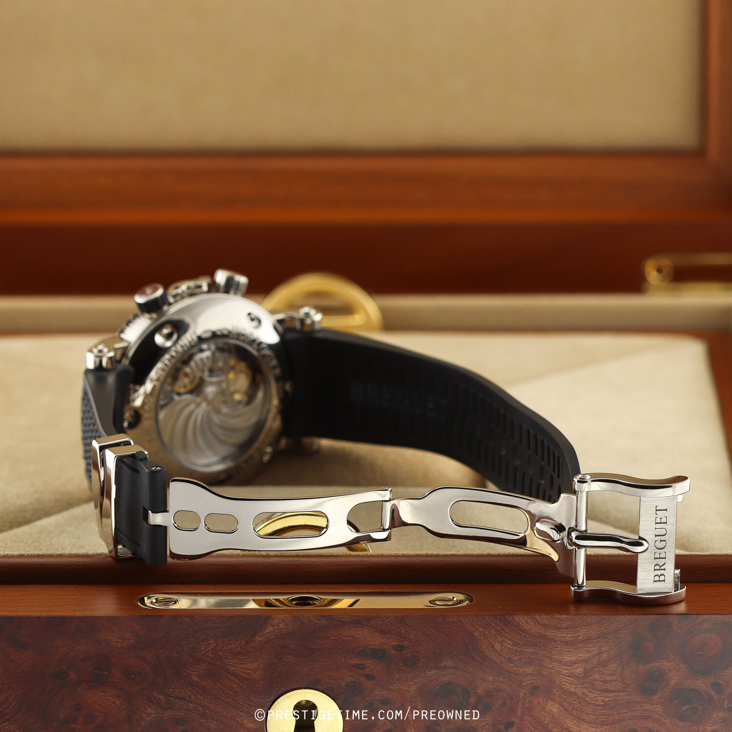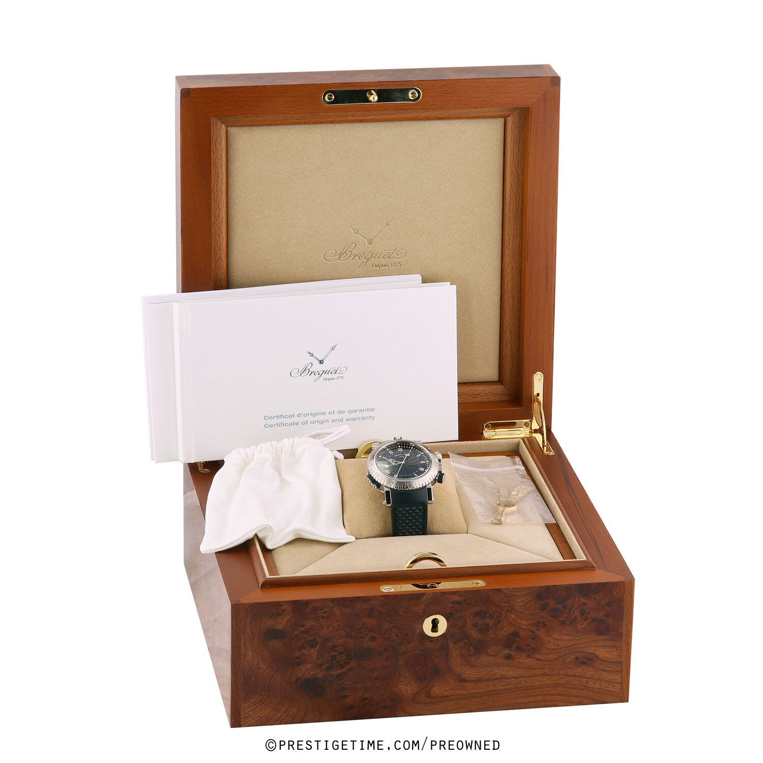 Case: Polished 18kt white gold case with Breguet's signature coined case edge. Brushed & polished 18kt white gold bezel with engraved & notched diving scale, and bold luminous filled triangle starting point. Black dial with a guilloche texture & a flat brushed chapter ring. Applied polished white gold roman numeral & luminous filled diamond shaped hour markers. Luminous dot minute/seconds track. Fine printed fractions of a second track on the dial perimeter. Polished hands, the hour & minute hands with luminous tips. Date window at 6 o'clock.