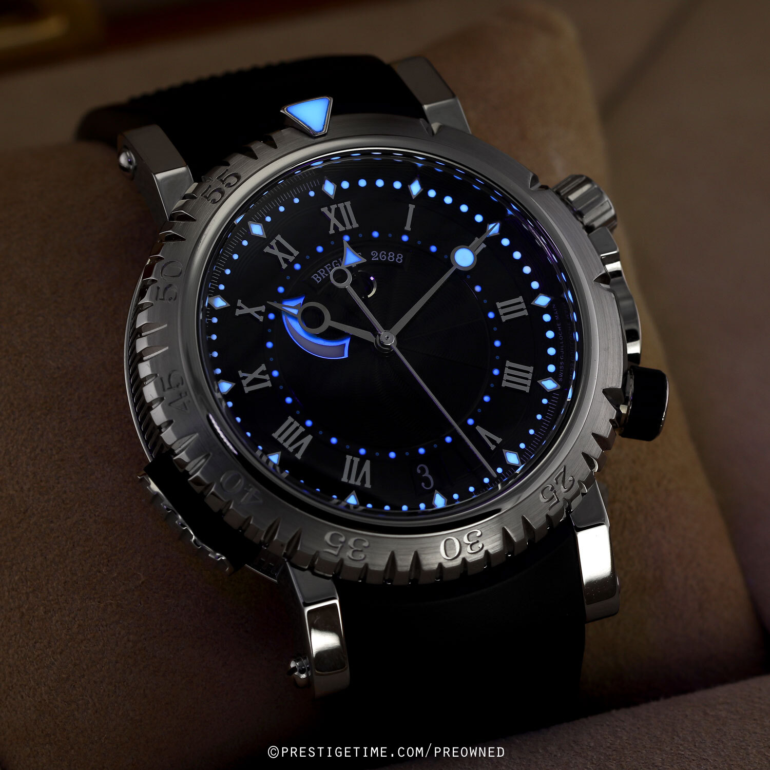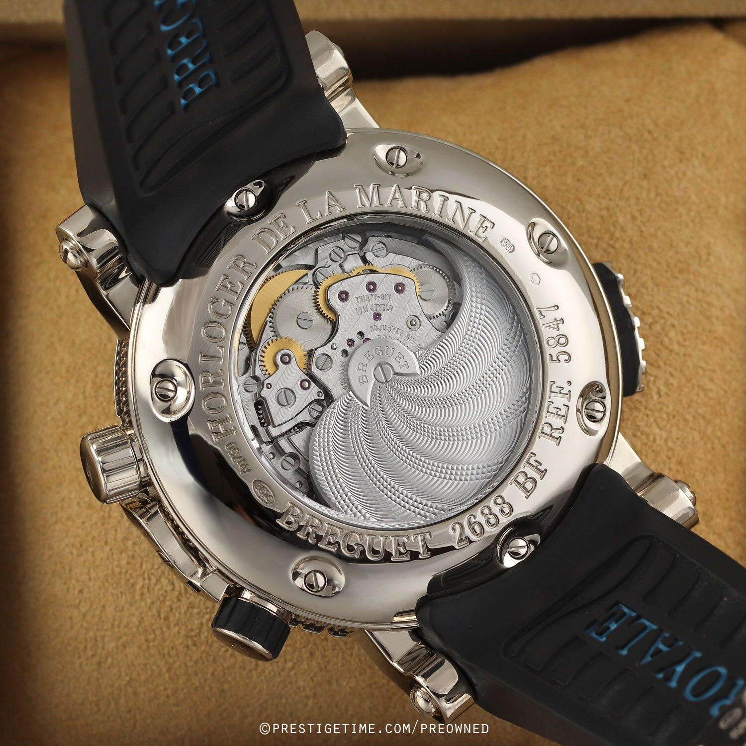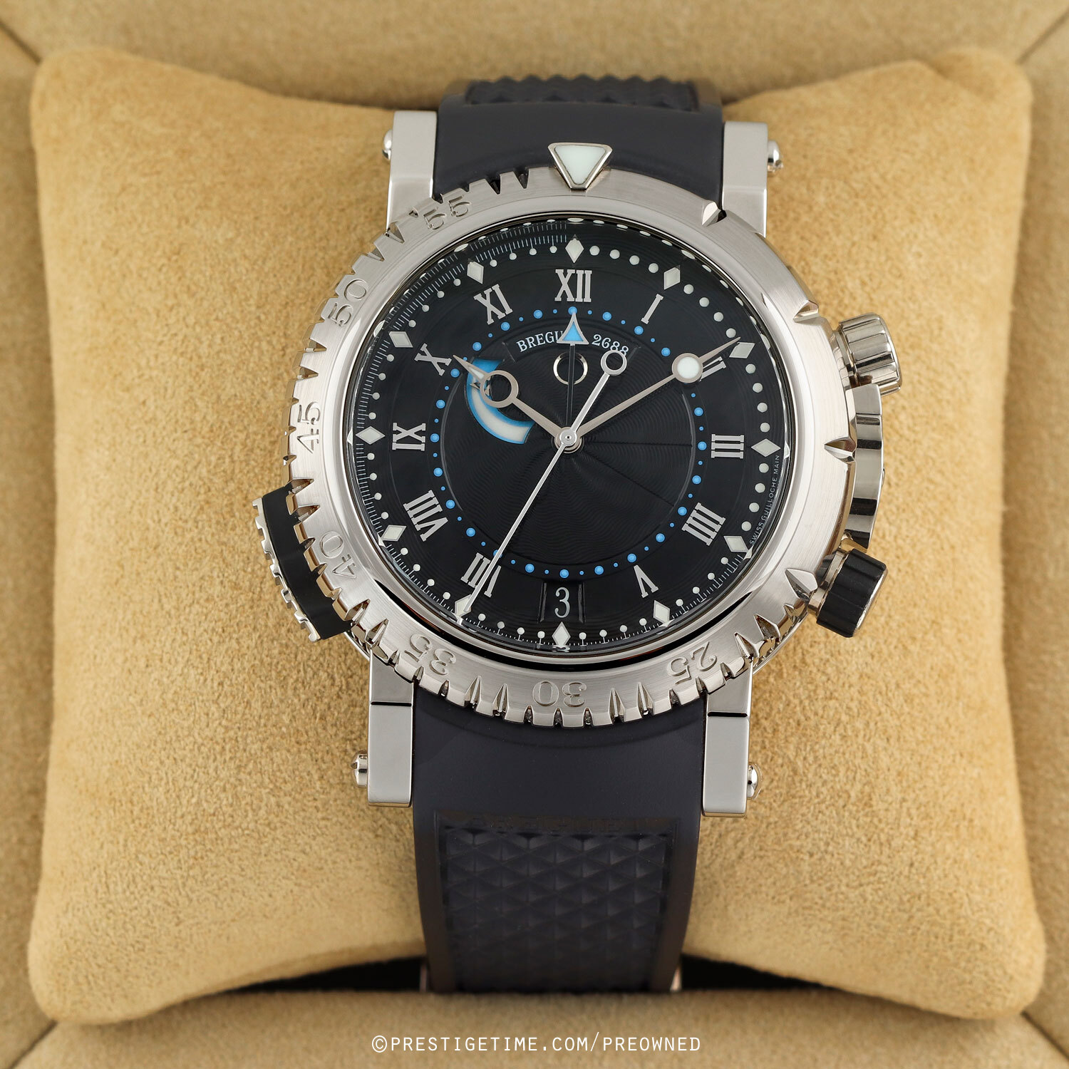 Case: Polished 18kt white gold case with Breguet's signature coined case edge. Brushed & polished 18kt white gold bezel with engraved & notched diving scale, and bold luminous filled triangle starting point. Black dial with a guilloche texture & a flat brushed chapter ring. Applied polished white gold roman numeral & luminous filled diamond shaped hour markers. Luminous dot minute/seconds track. Fine printed fractions of a second track on the dial perimeter. Polished hands, the hour & minute hands with luminous tips. Date window at 6 o'clock.