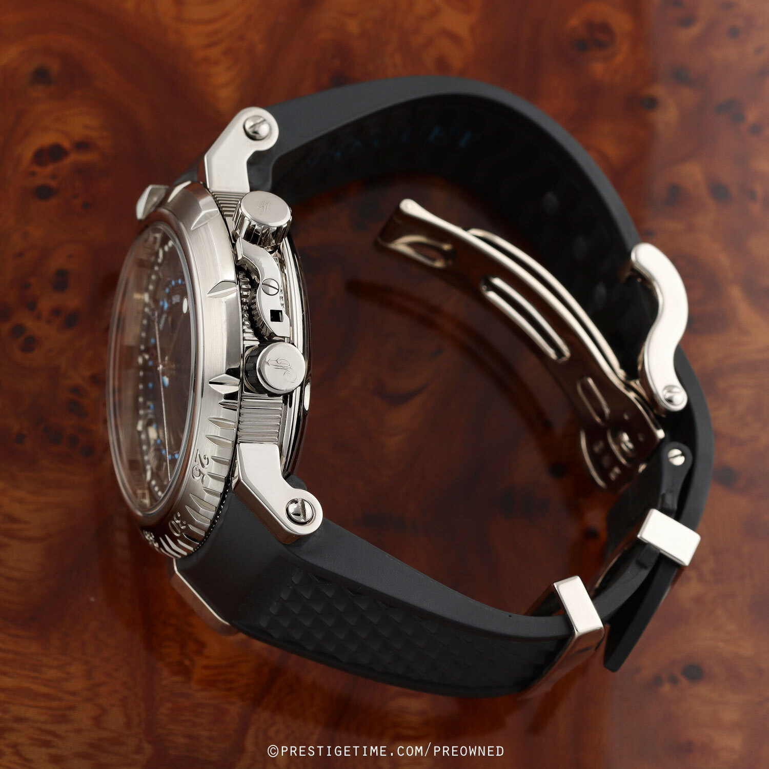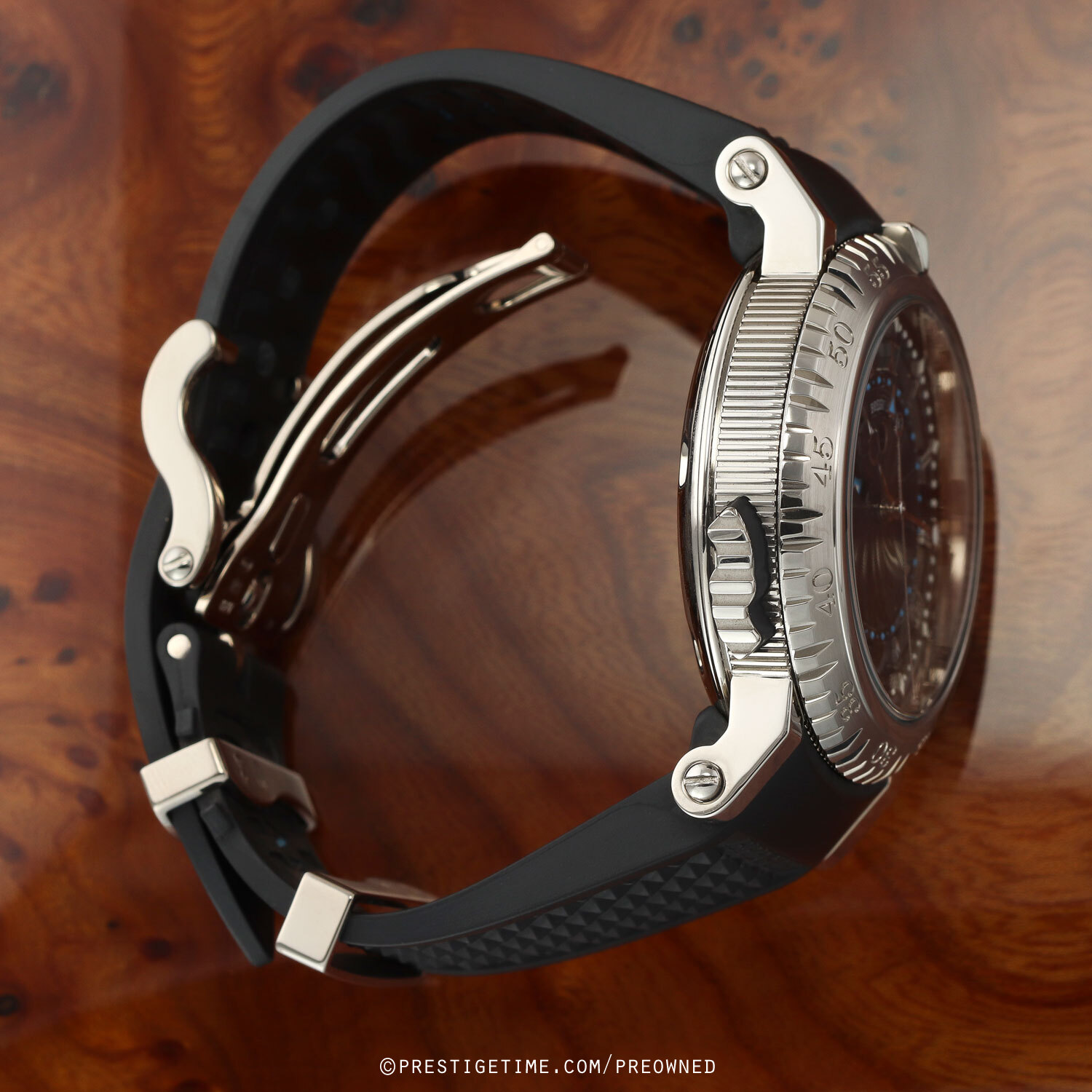 Strap: Fitted on its original black rubber strap & with a solid 18kt white gold deployant buckle & strap-keeps. The rubber strap is unworn & in perfect condition.