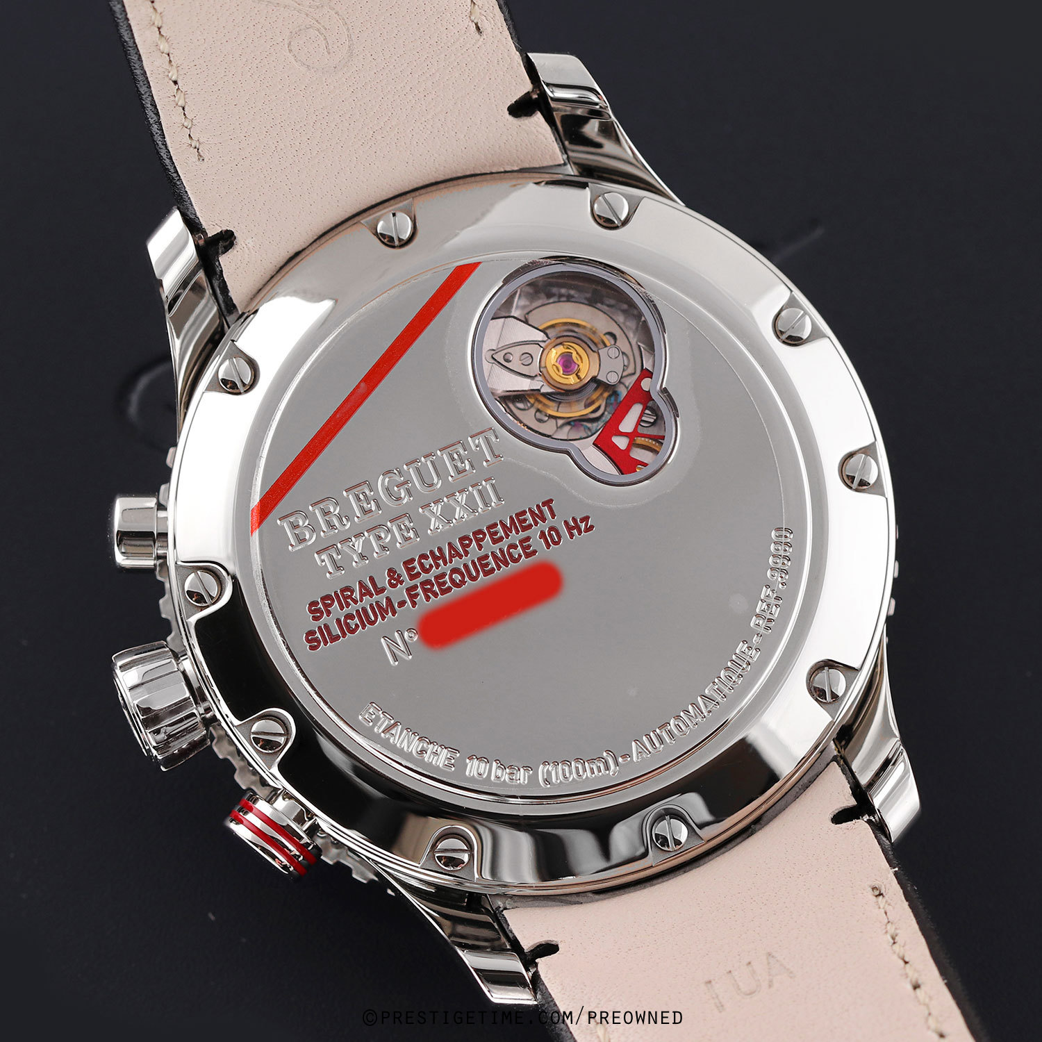 Movement: Powered by a Breguet in-house caliber 589 F, with a High Frequency Escapement which beats at 10Hz (72,000 vph), contains 28 jewels & has a power reserve of +/- 40 hours. The movement features a Swiss straight-line lever escapement & a flat balance spring in silicon.