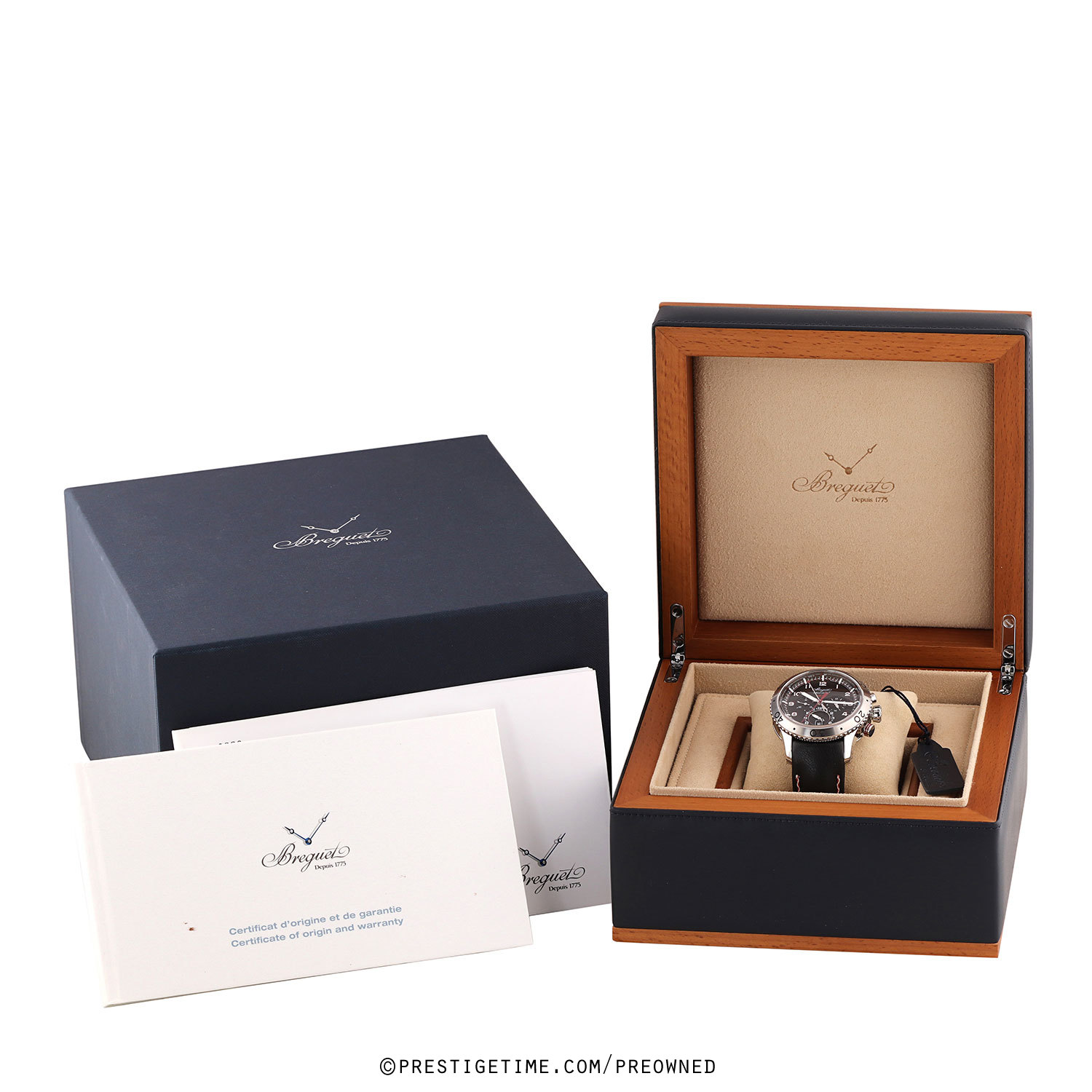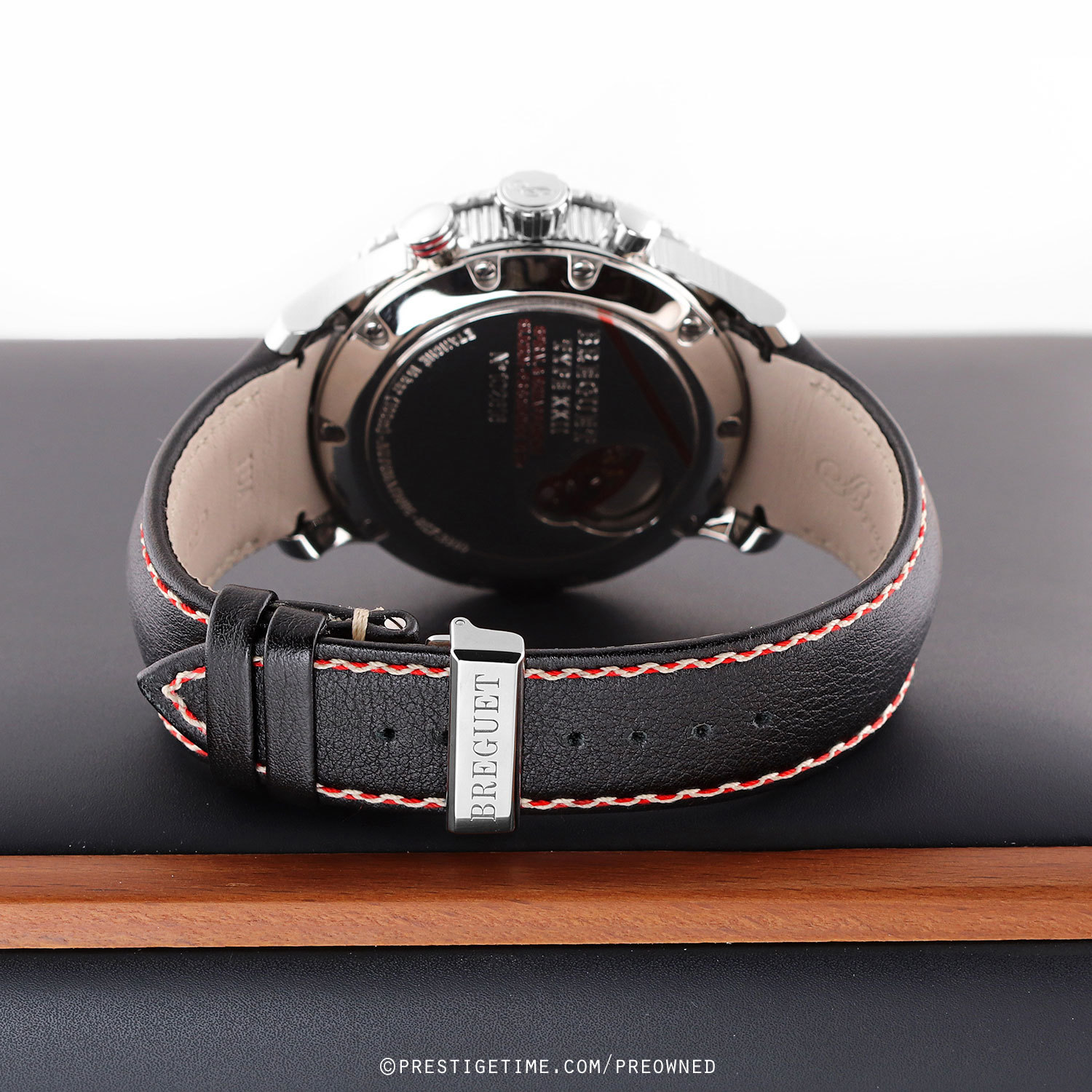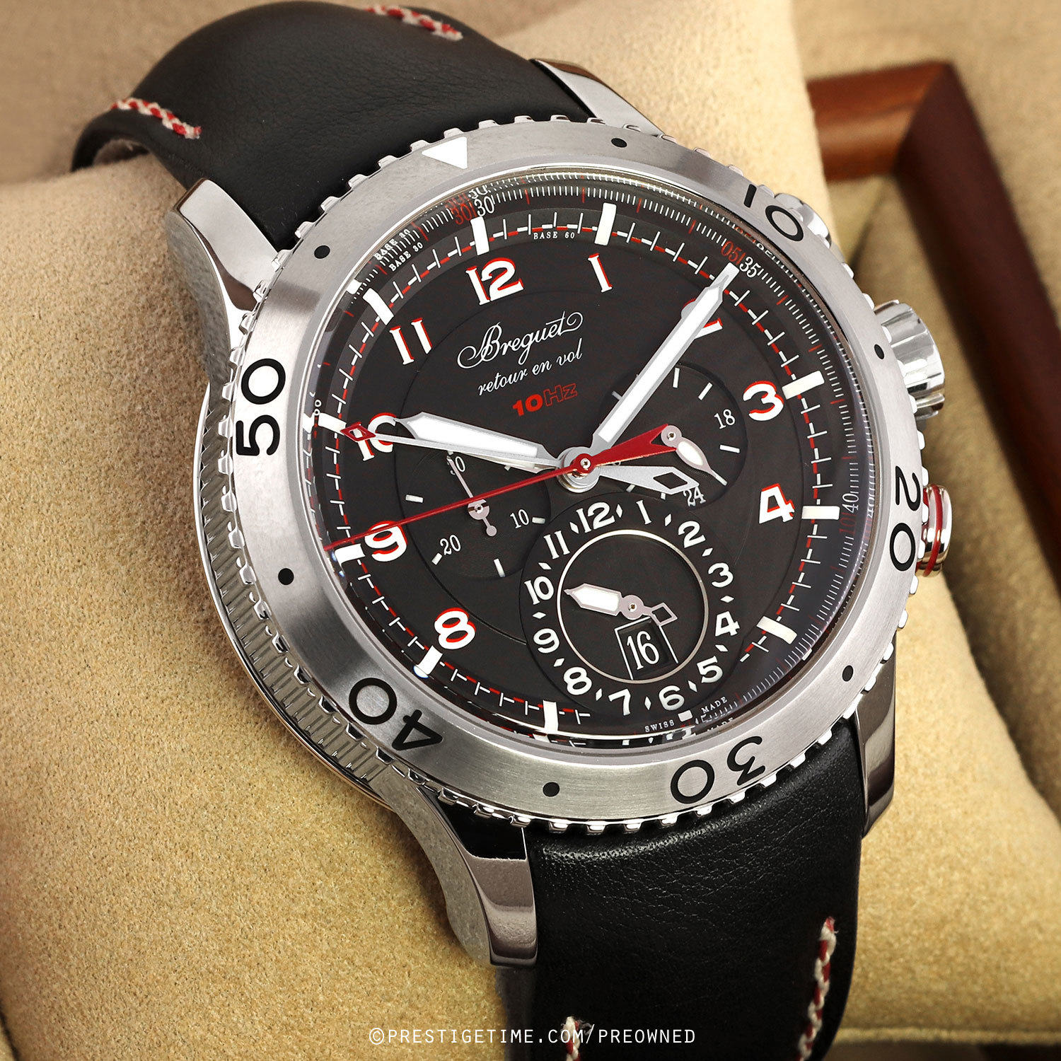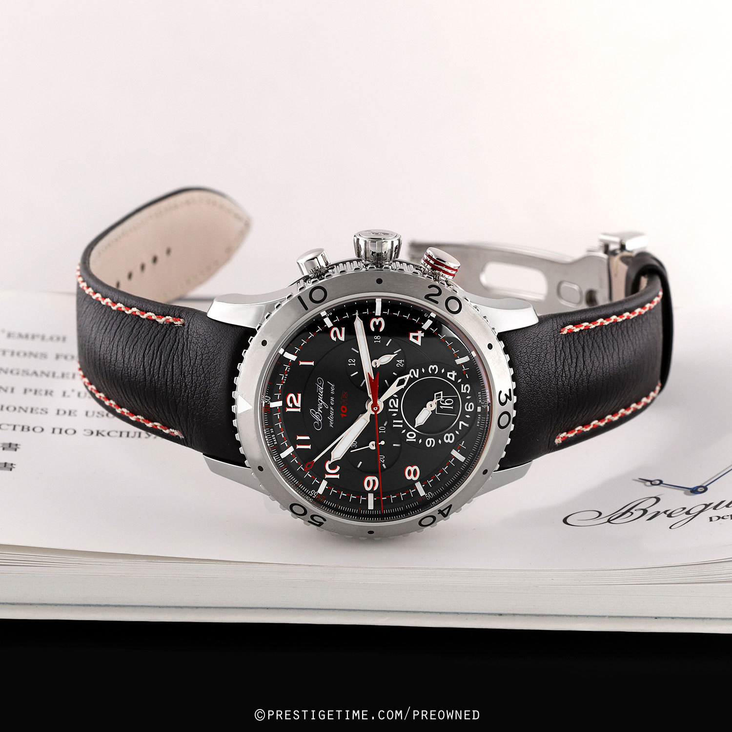 Case: Polished stainless steel case with Breguets signature coined edge. Brushed & polished stainless steel bi-directional rotating bezel with 5 minute scale. Matte black dial. Matte finished hands, the time related hands with luminous fill. Painted white Arabic Numeral hour markers in with a red shadow. Dial flange with luminous painted hour markings & with minutes/seconds & fractions of a second markings printed in white & red. Date window at 6 o'clock. Small 30 seconds sub-dial at 9 o'clock.