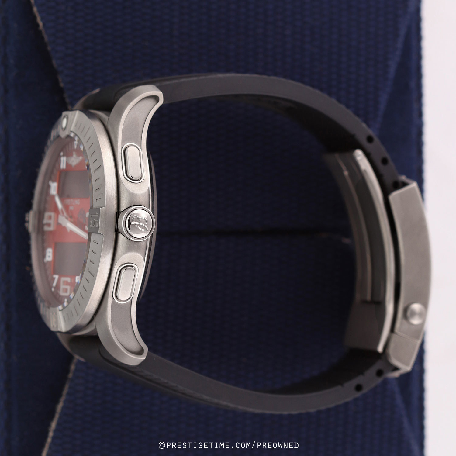 1. Fitted on its original Breitling black rubber strap with a titanium push-button deployant buckle featuring a micro-adjustment sliding mechanism. The strap is in excellent, near new condition with its full wear lifespan remaining. We would be comfortable rating the strap as in 99% condition. The strap has been cut and will fit up to a 7-1/8" wrist. A new rubber strap can be ordered from Breitling for roughly $120 (rubber strap part # 315s).