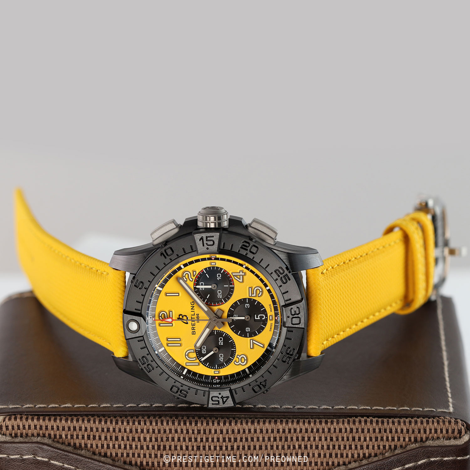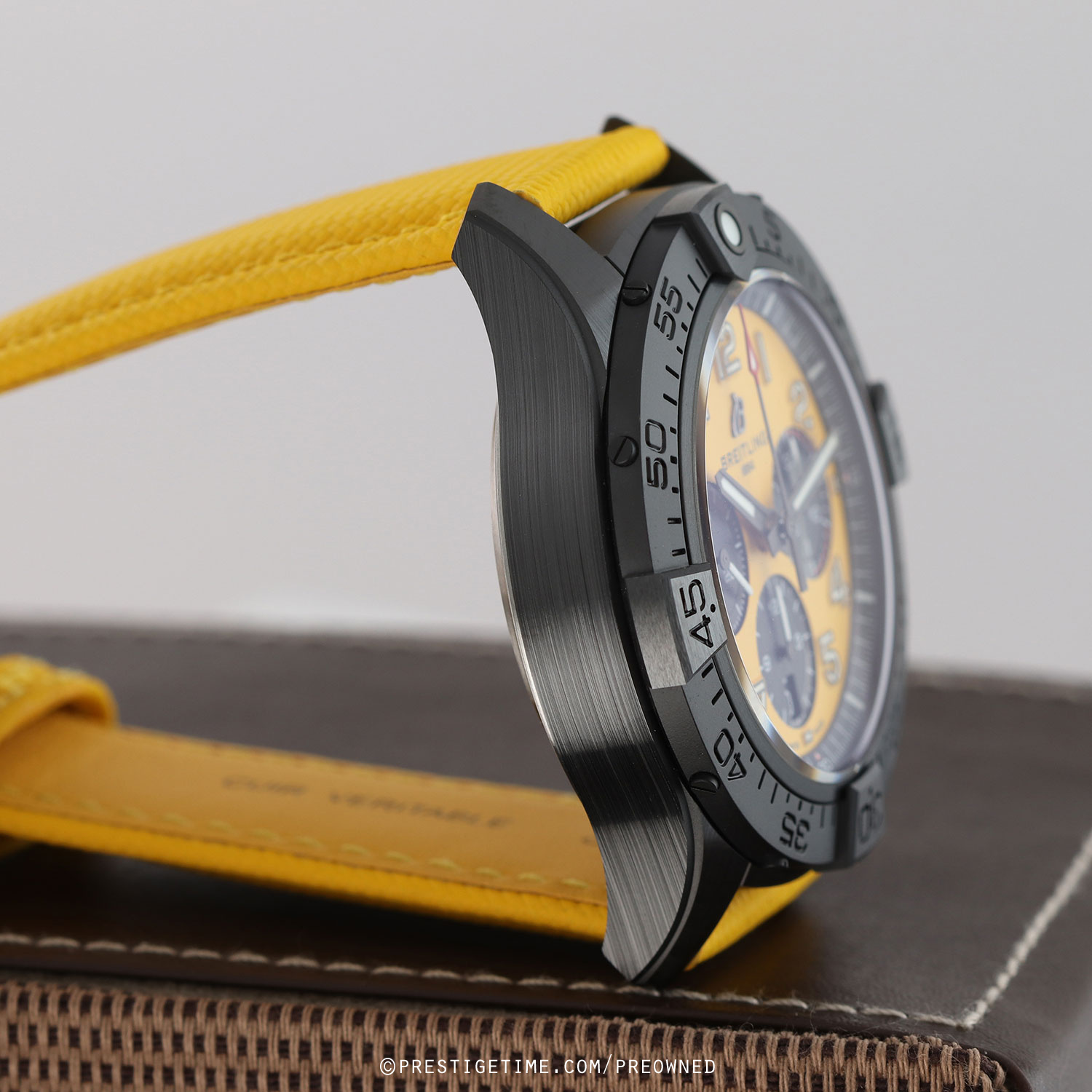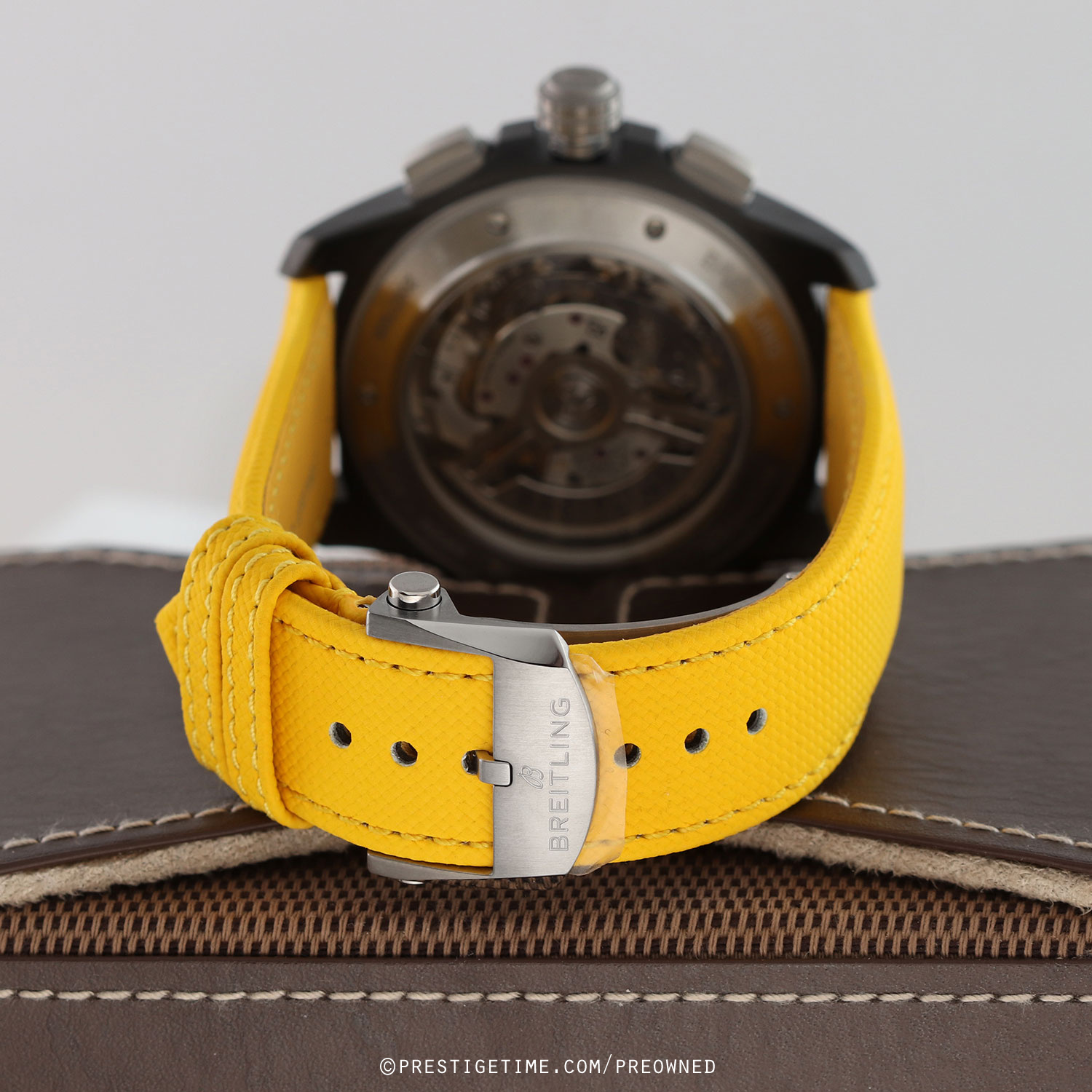 Strap: Fitted on its original Breitling yellow calfskin leather strap with a titanium push-button deployant buckle. The strap is brand new, crisp & unworn with its full wear lifespan remaining.