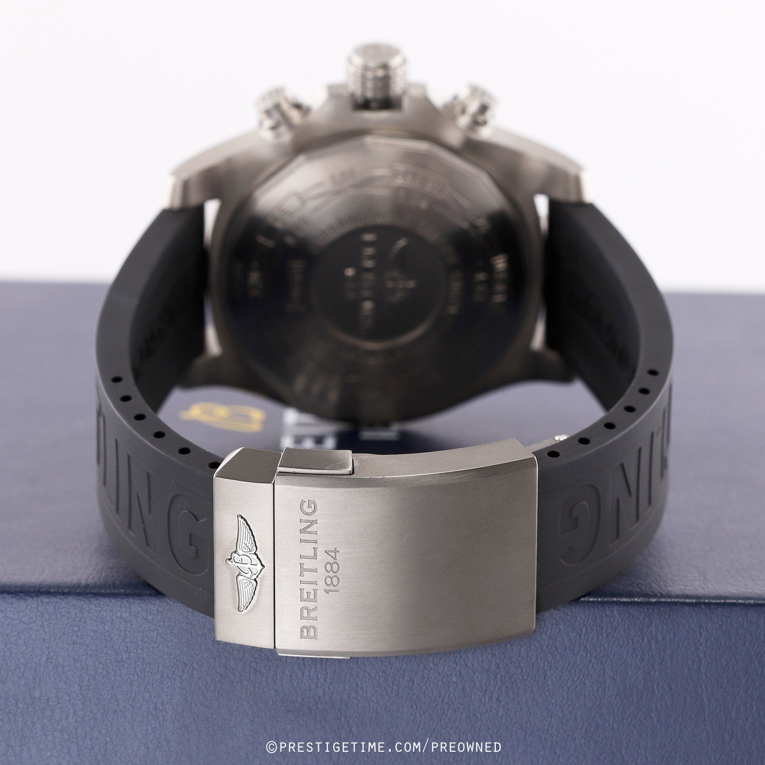Strap: Fitted on a brand new, unworn original Breitling Diver Pro III rubber strap with a titanium push-button deployant clasp with a convenient push-button micro-adjusting system. The strap is uncut at its original full length, it will fit up to a 9" wrist, and will need to be cut down to size.
