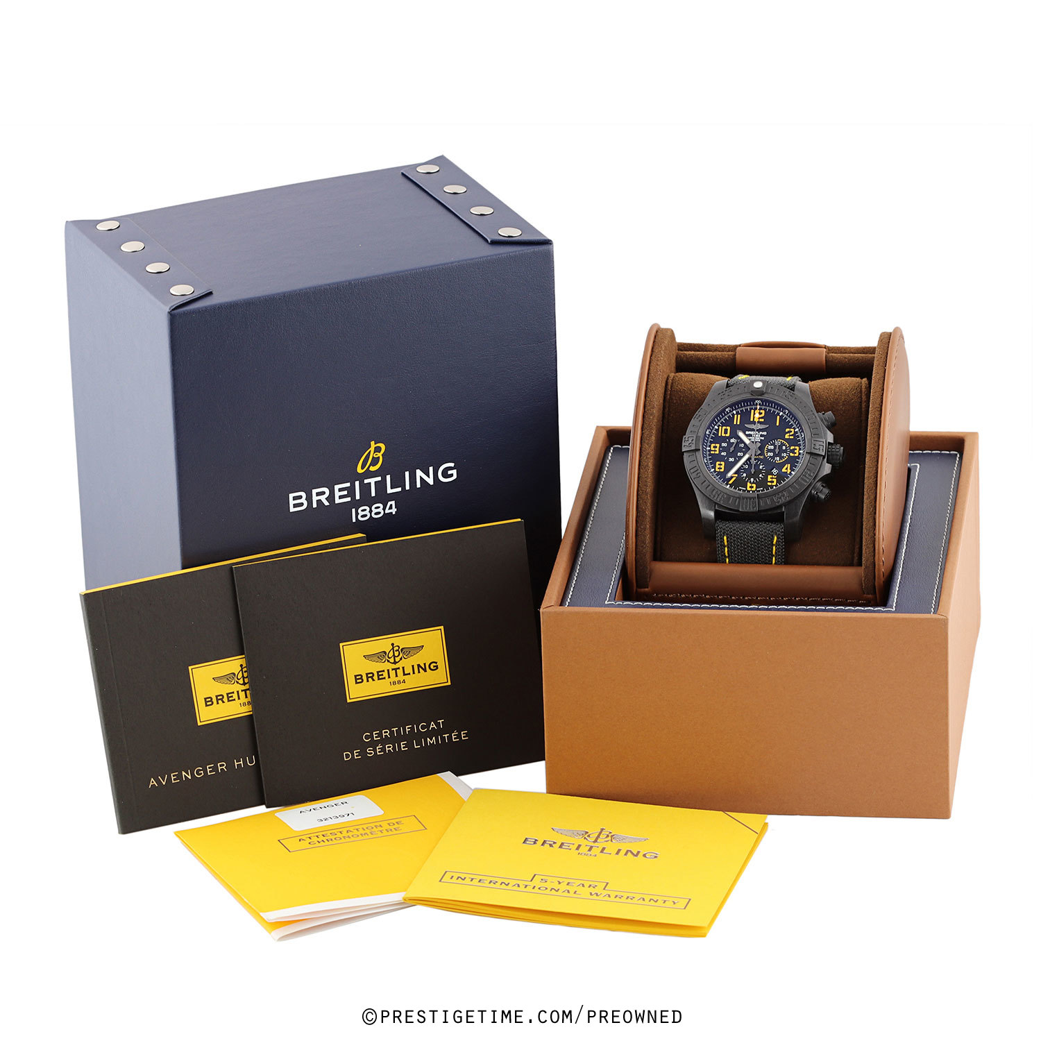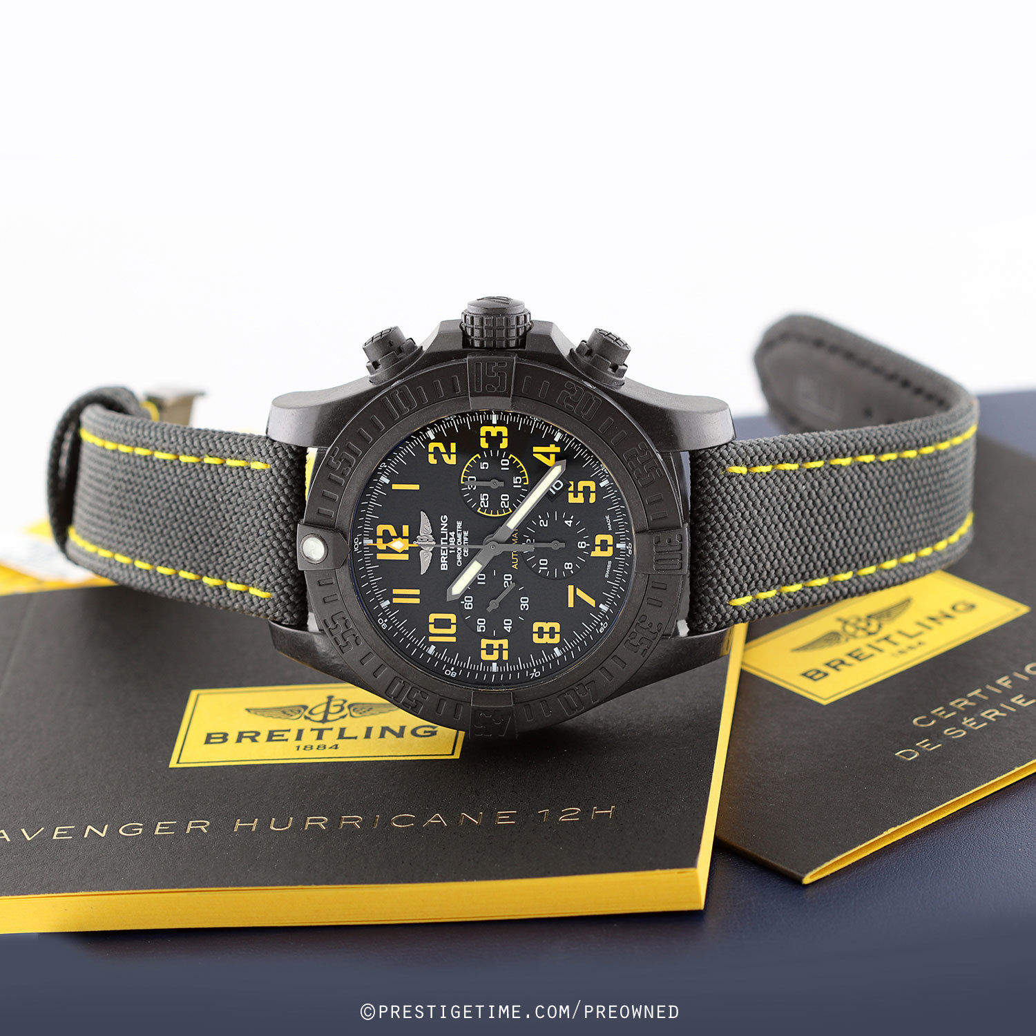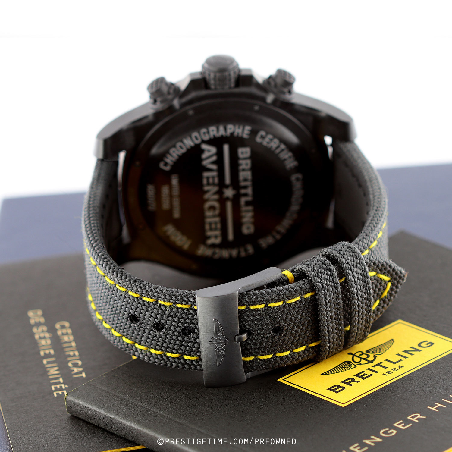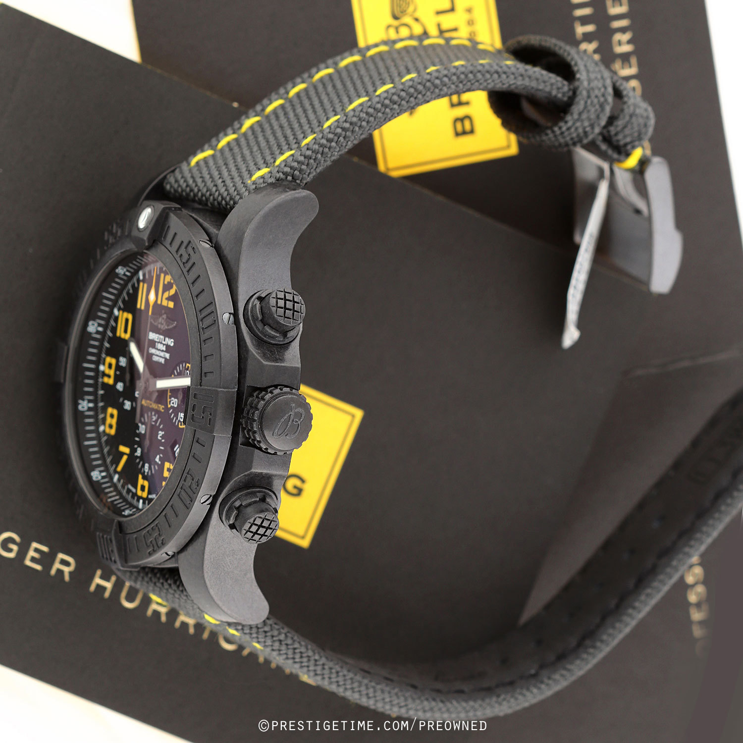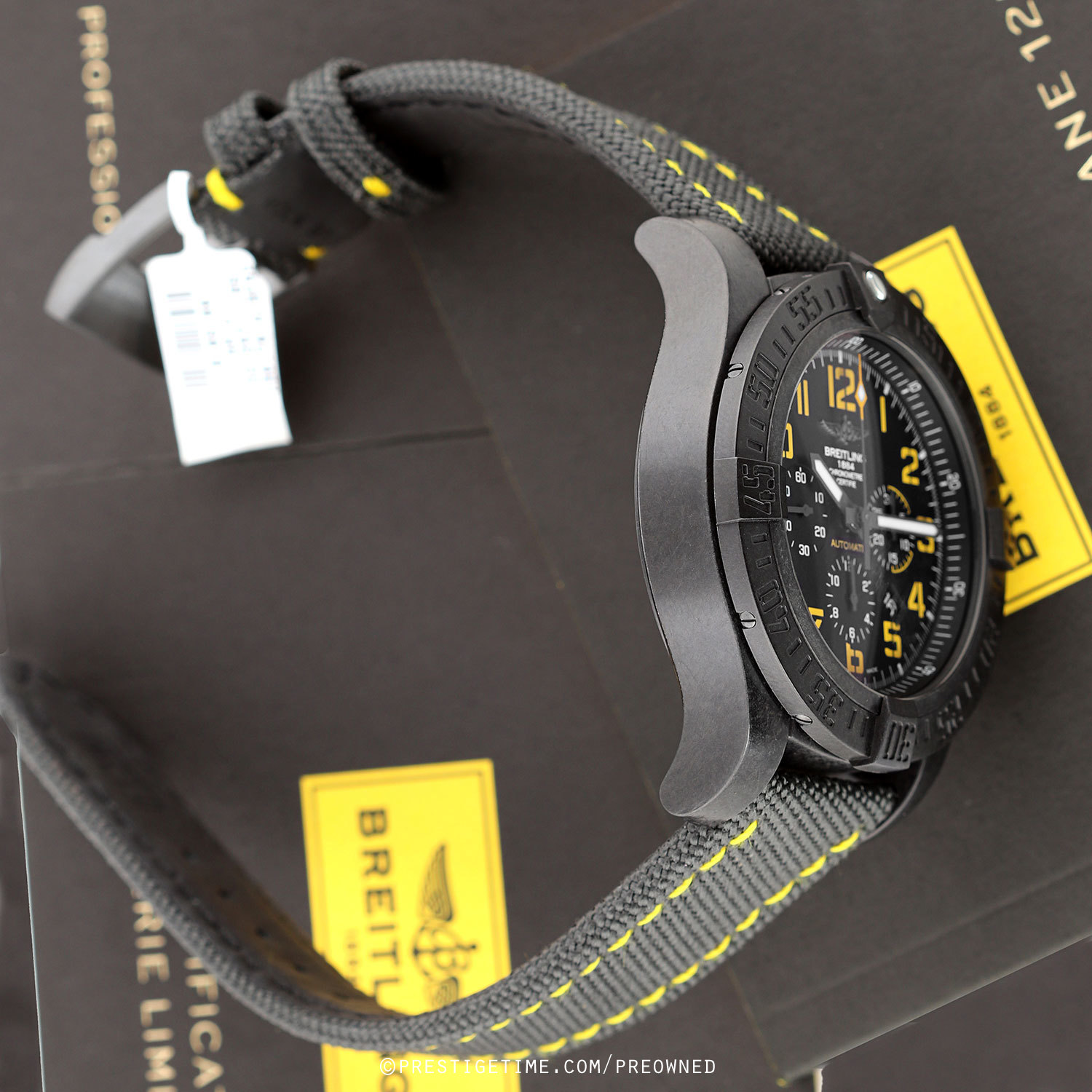 Strap: Fitted on its original Breitling black fabric strap with themed yellow stitching & a black tang buckle. The strap is unworn and in 100% condition.