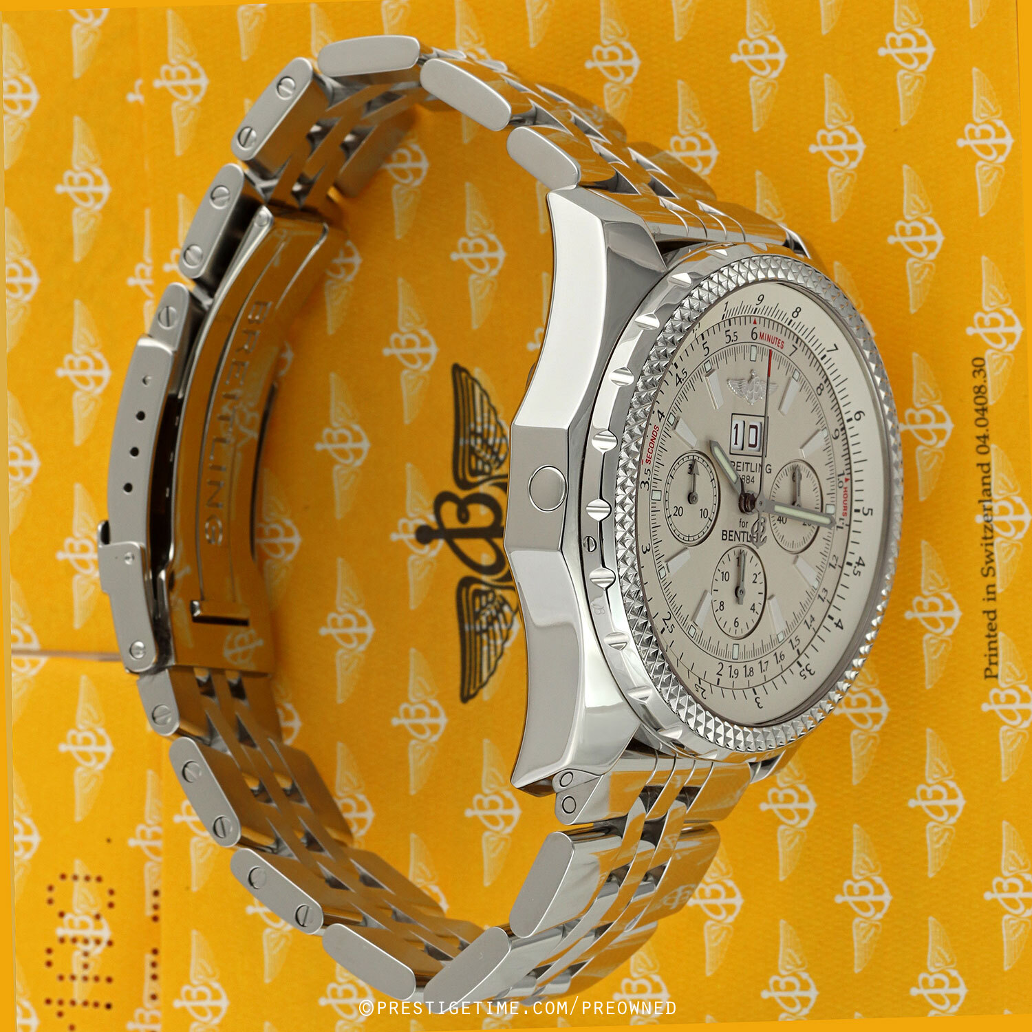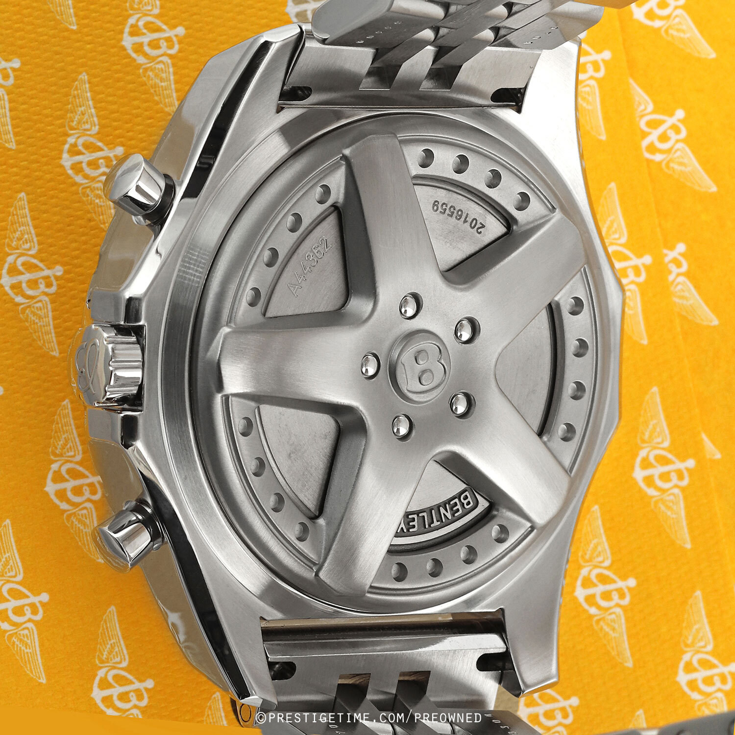 This is the first generation version of the Breitling Bentley 6.75. The watch features a knurled finished bezel ring in the spirit of Bentley’s famous radiator grilles. The case-back is features a five-spoke design similar to those found on Bentley wheel rims.
