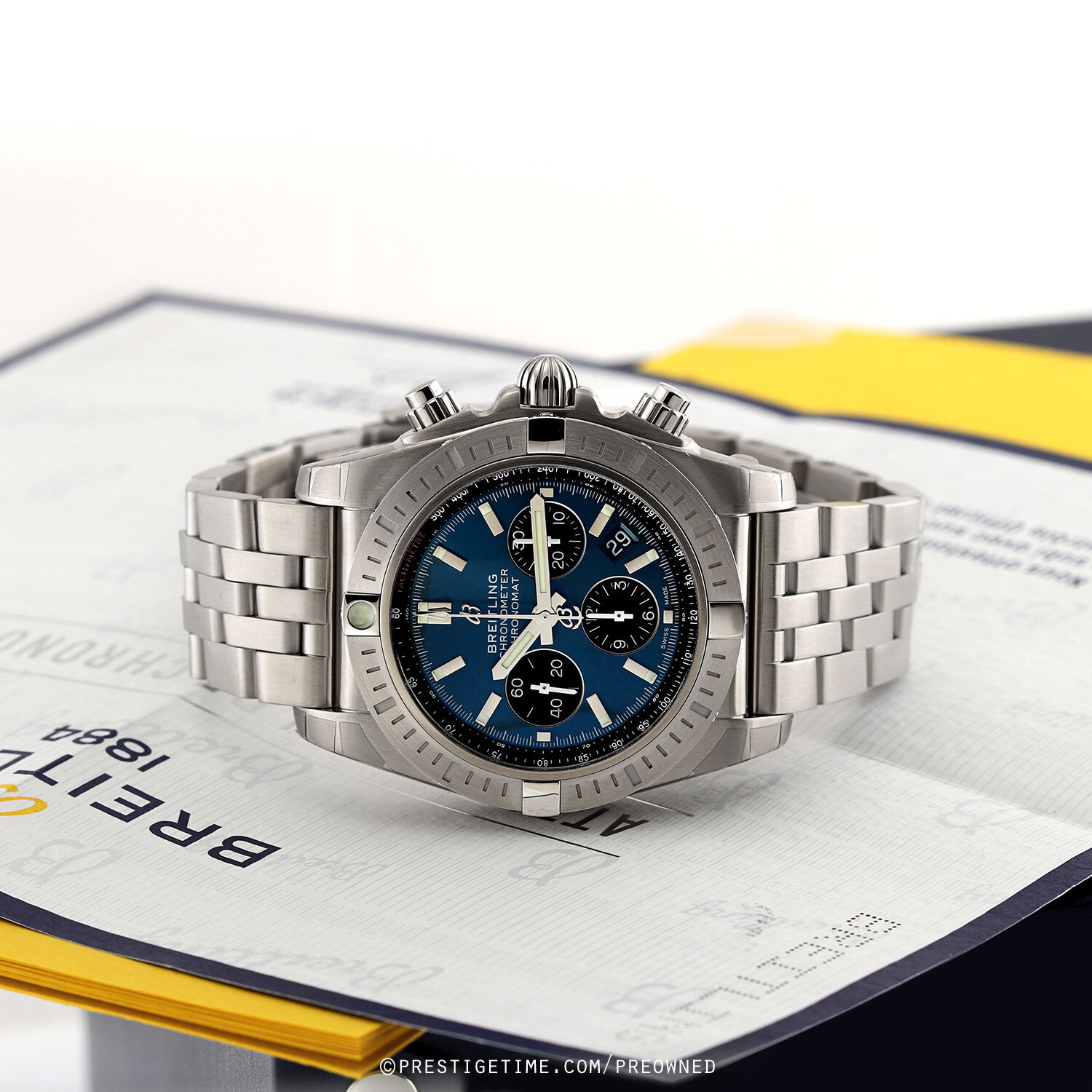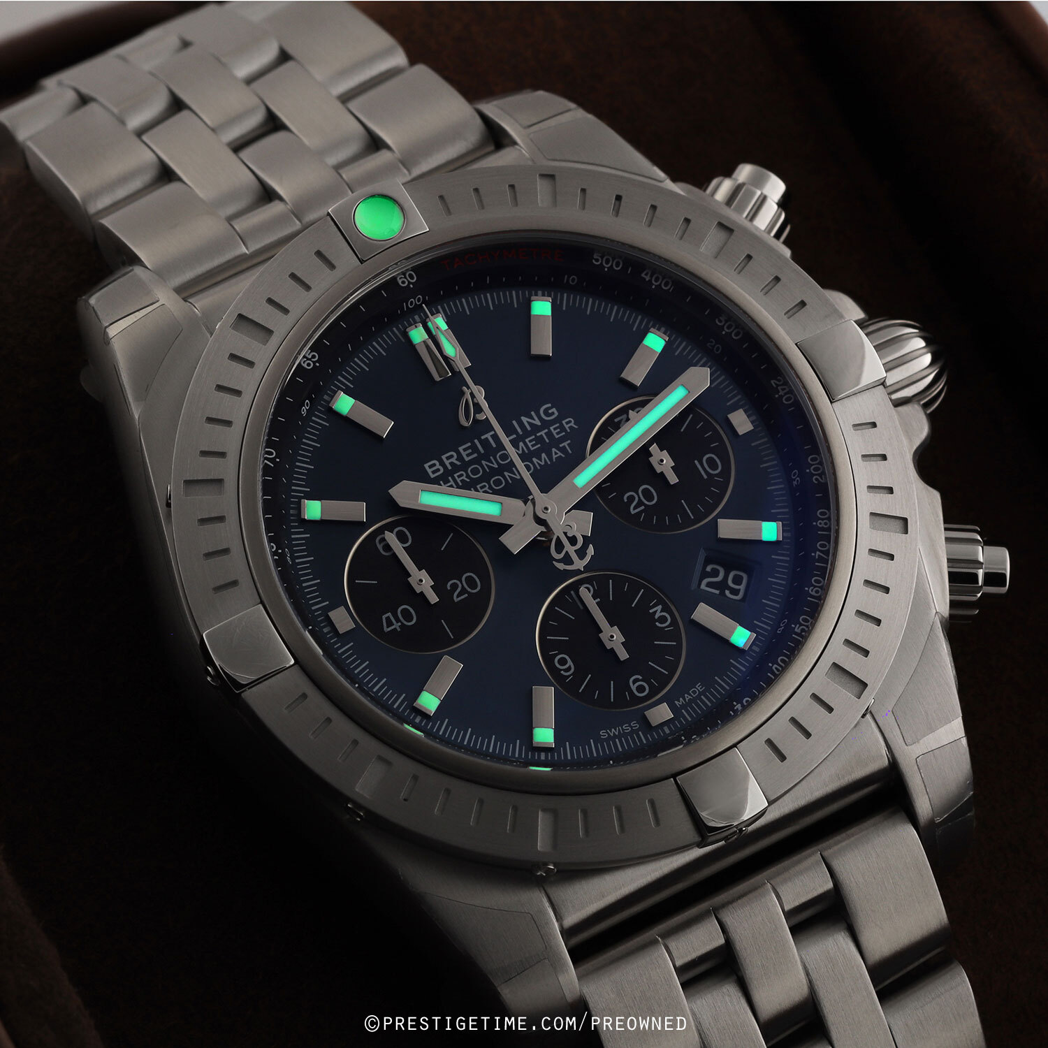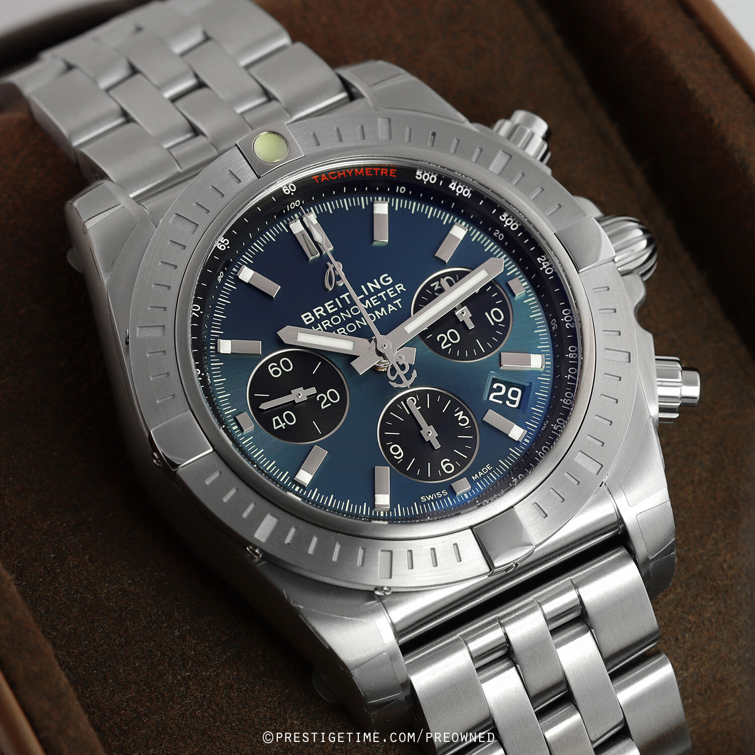 Strap: Fitted on its original Breitling brushed stainless steel bracelet and a deployant clasp with a safety latch. The bracelet is fully linked & will fit up to a 8.25" wrist
