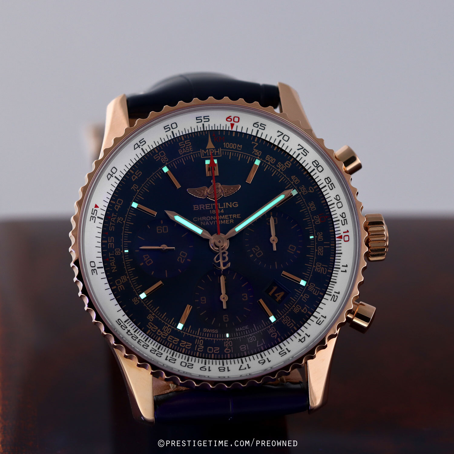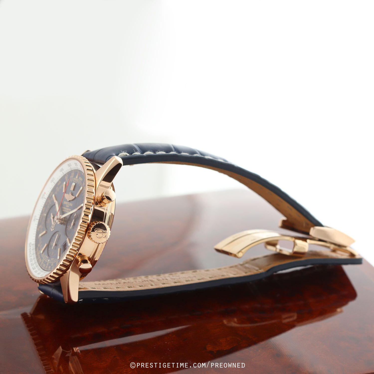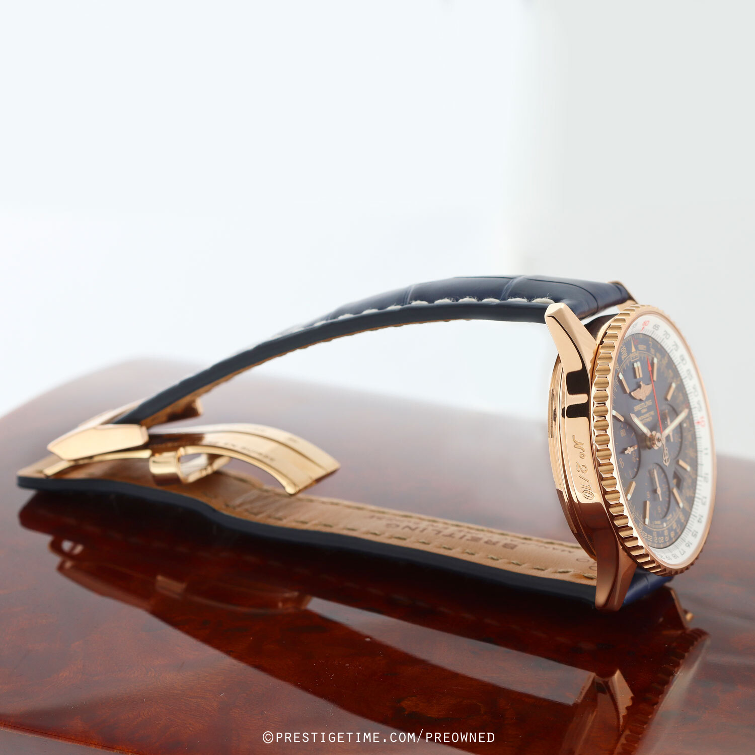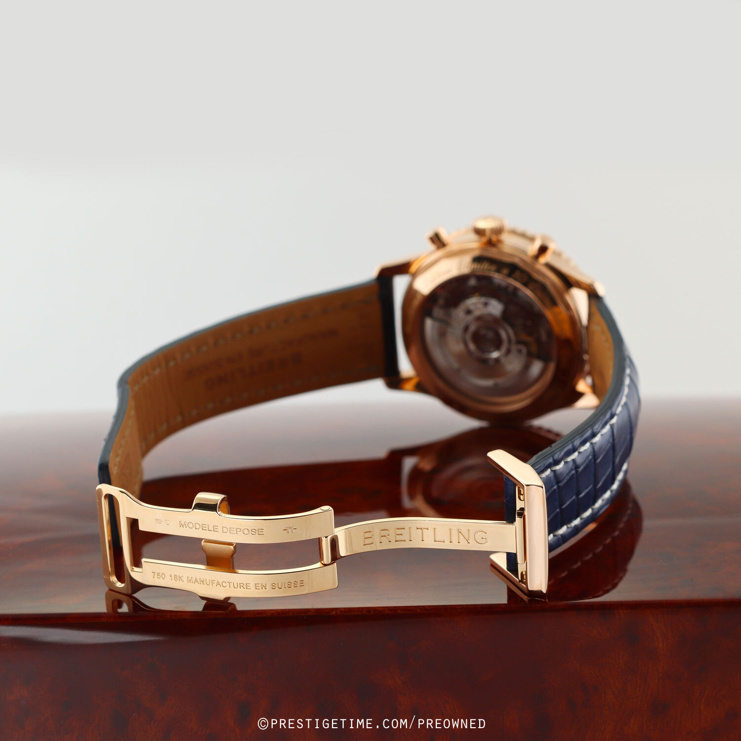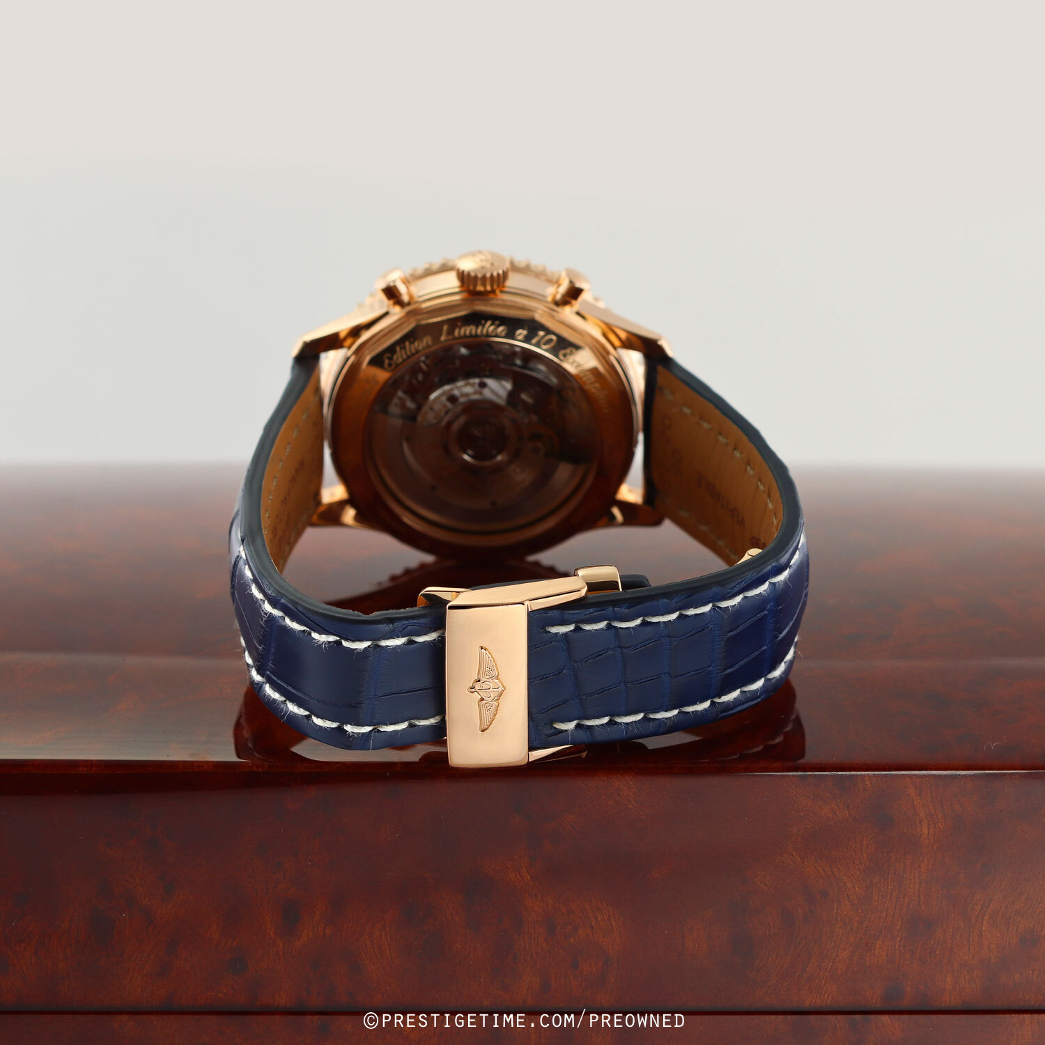 Strap: Fitted on a brand new OEM Breitling blue alligator leather strap with contrasting white stitching & a solid 18kt rose gold tang buckle.