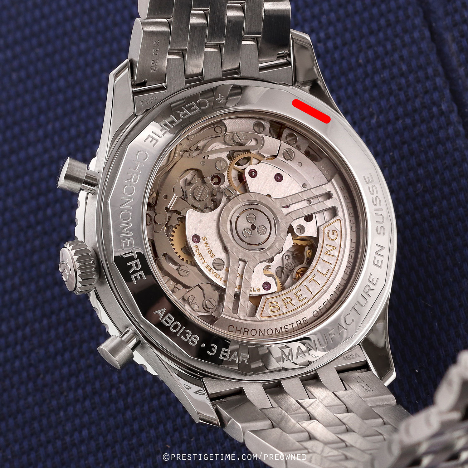Movement: Powered by a Breitling in house caliber B01, which beats at 28,800 vph, contains 47 jewels & has a power reserve of +/- 70 hours.