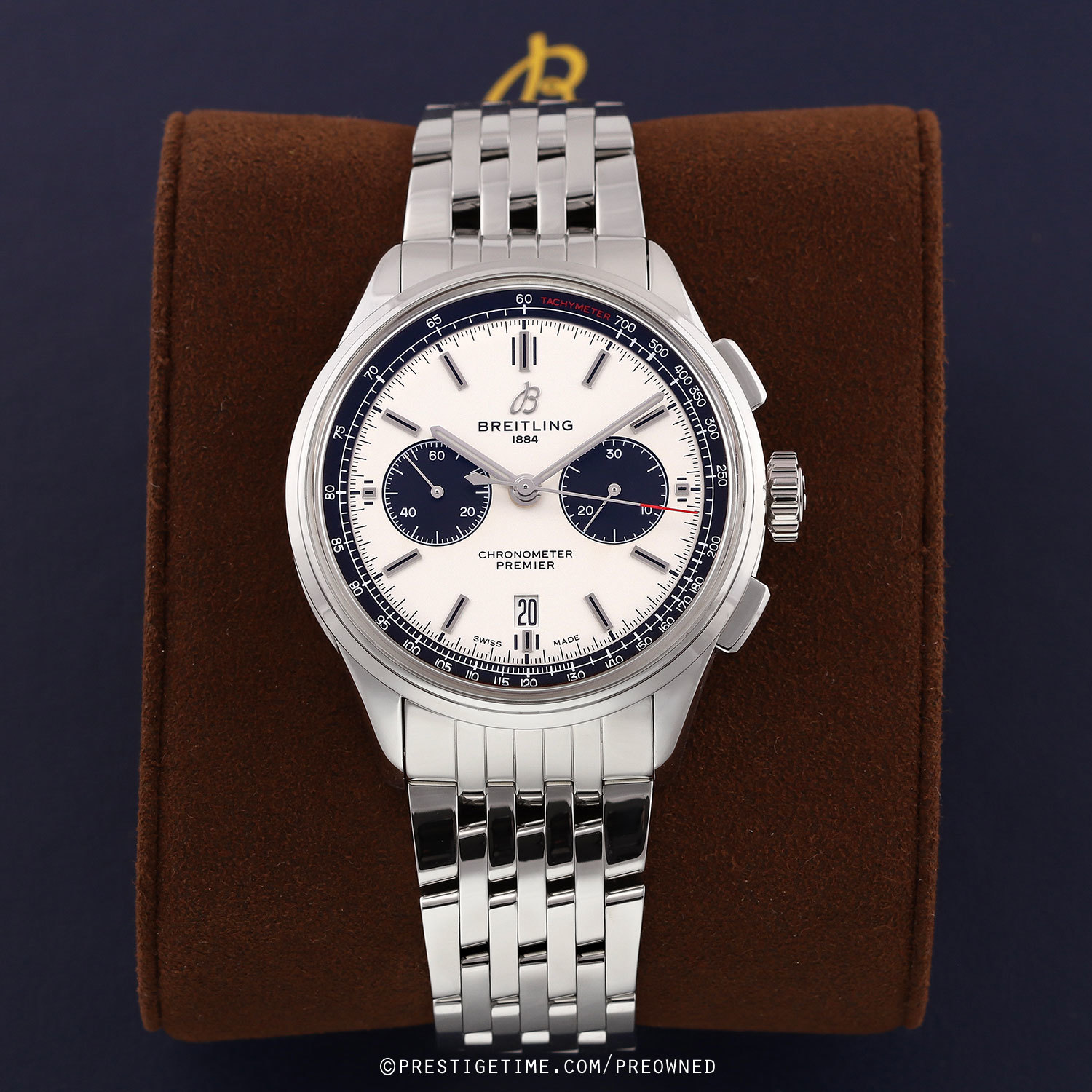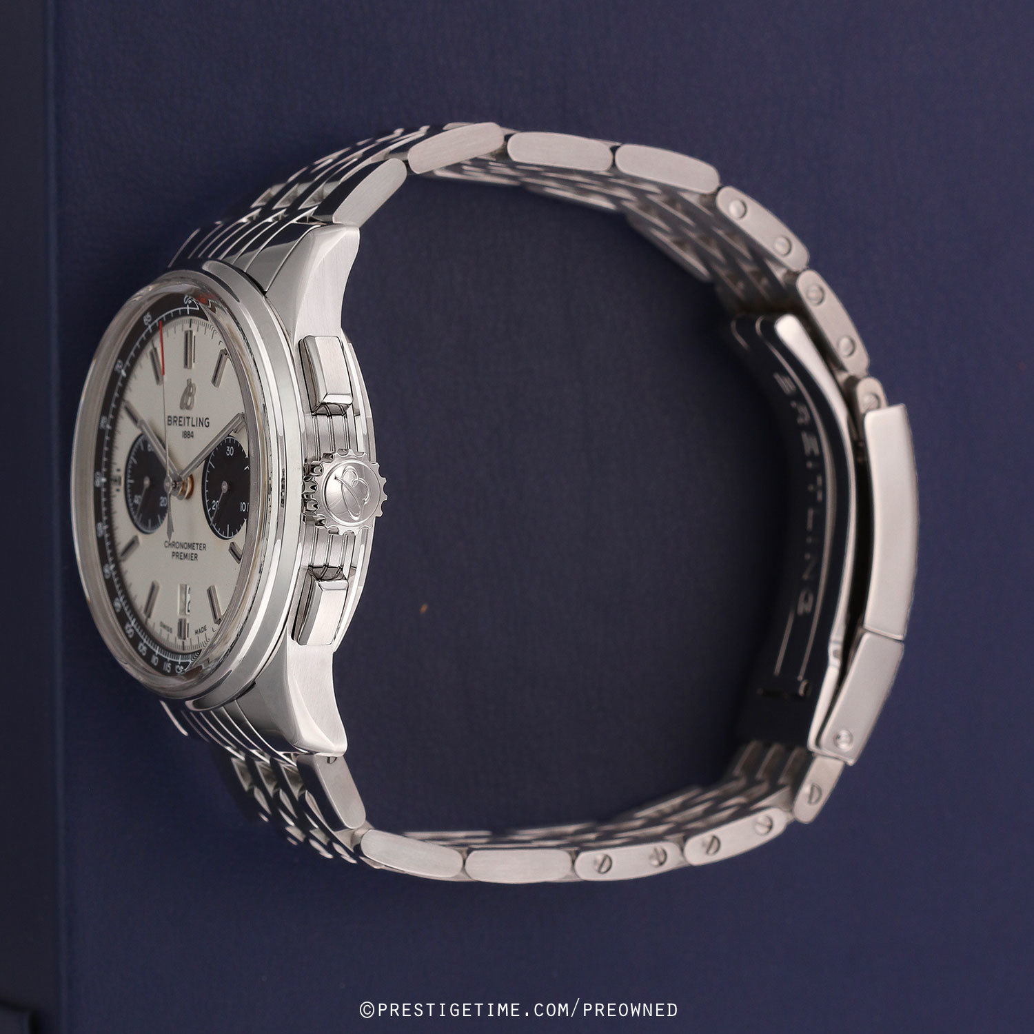 - Fitted on its original Breitling polished stainless steel bracelet with a safety latch folding clasp. The bracelet is fully linked & will fit up to an 8-1/8" wrist