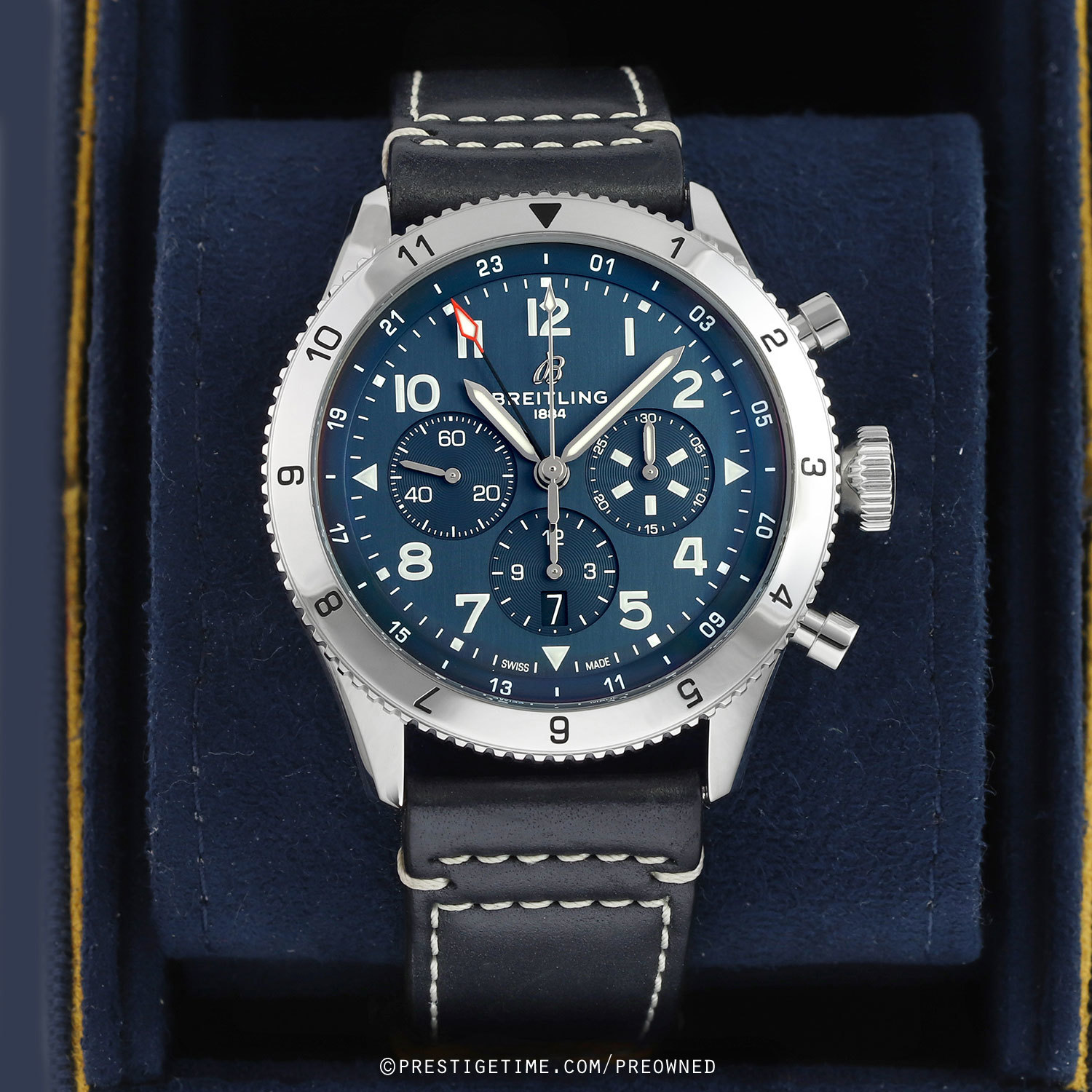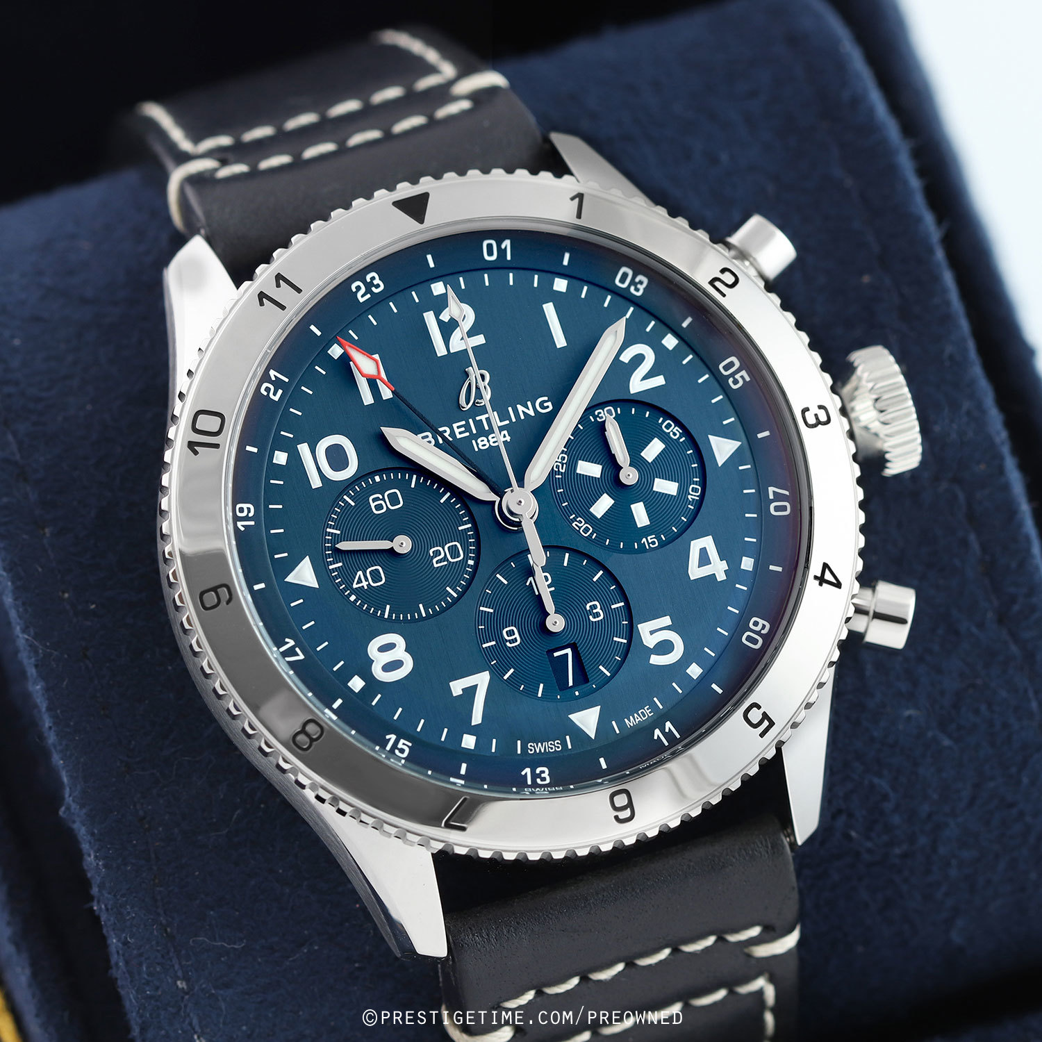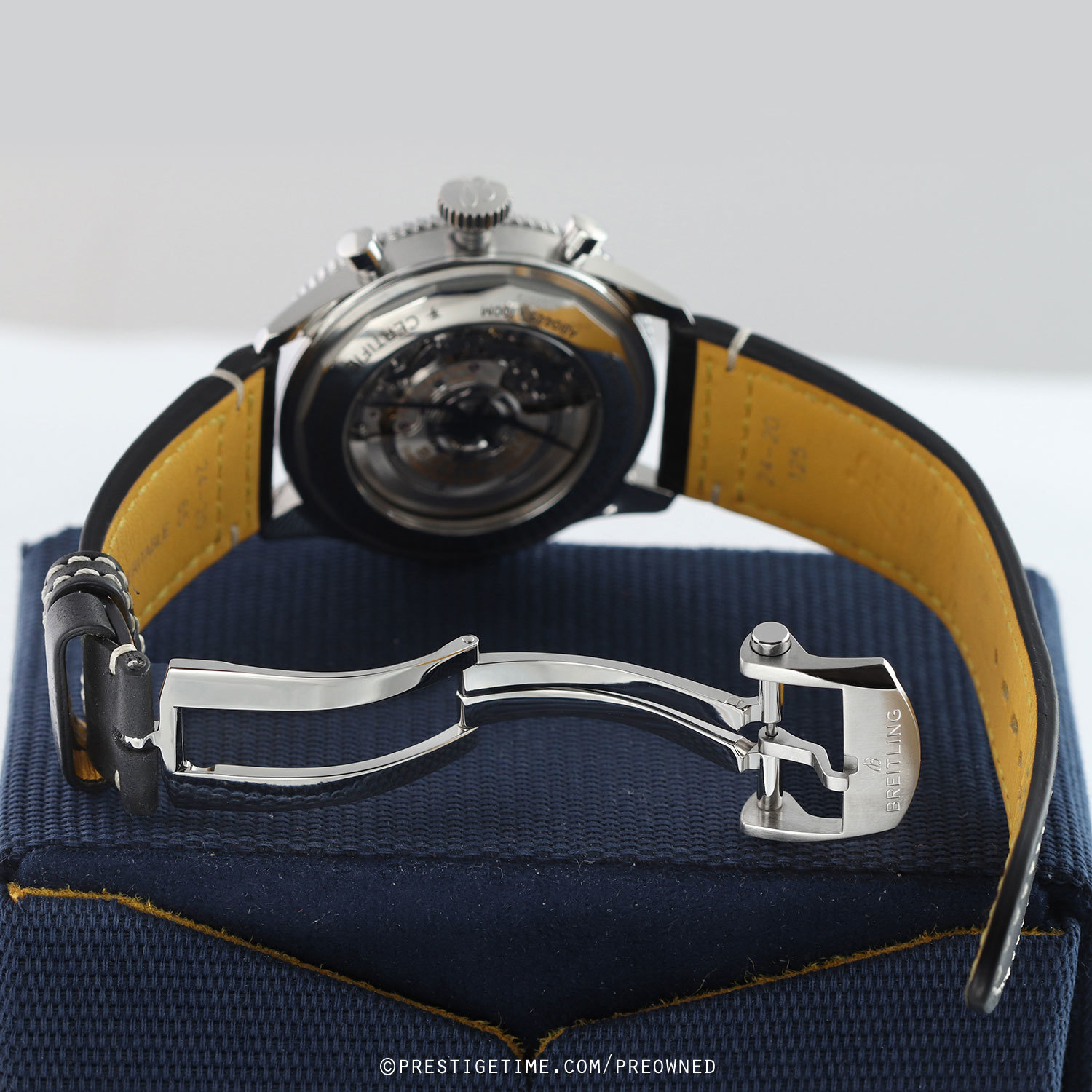 Strap: Fitted on its original Breitling black calfskin leather strap with a push-button stainless steel deployant buckle. The strap is in excellent near new condition with the majority of its wear lifespan remaining. We would grade this trap in 97% condition.