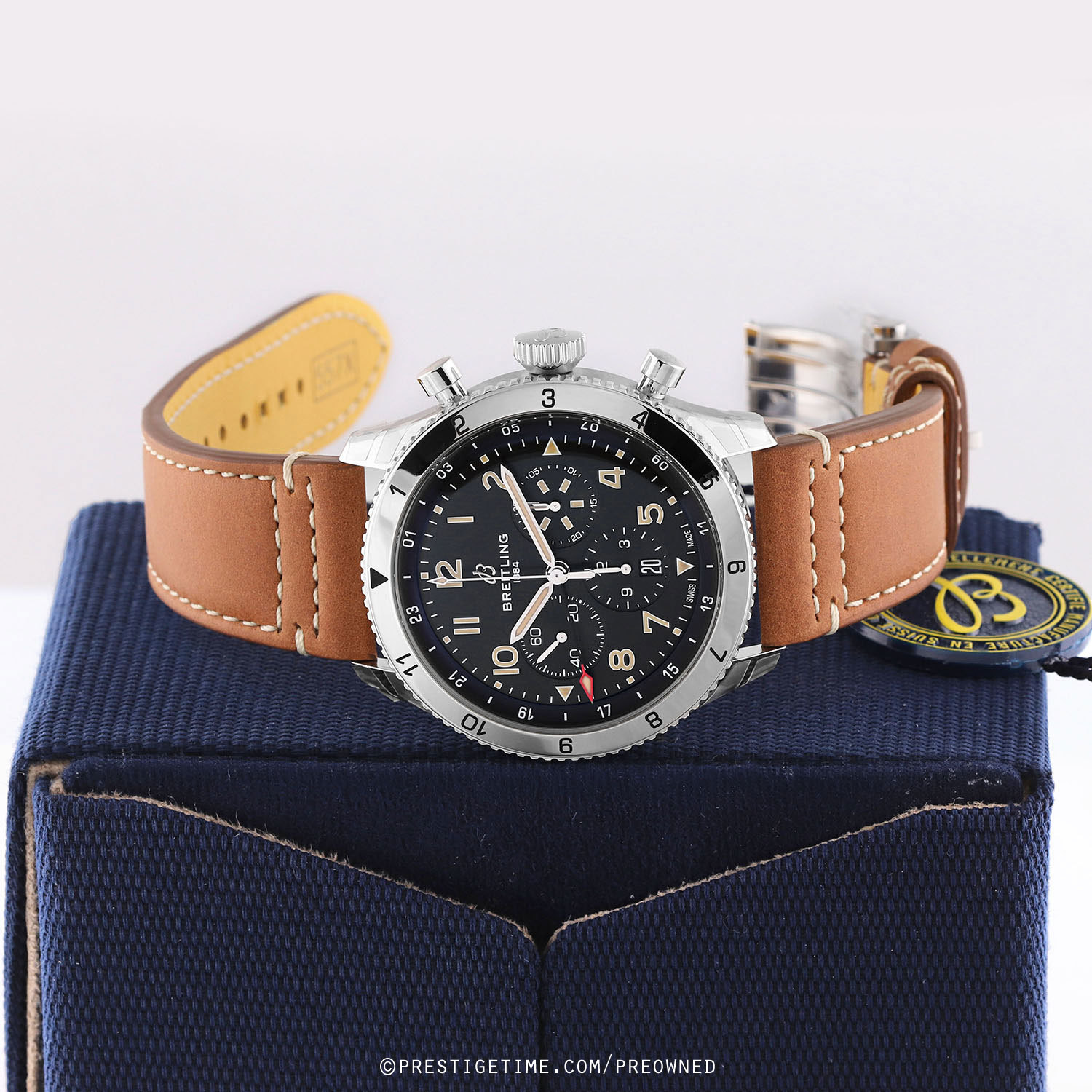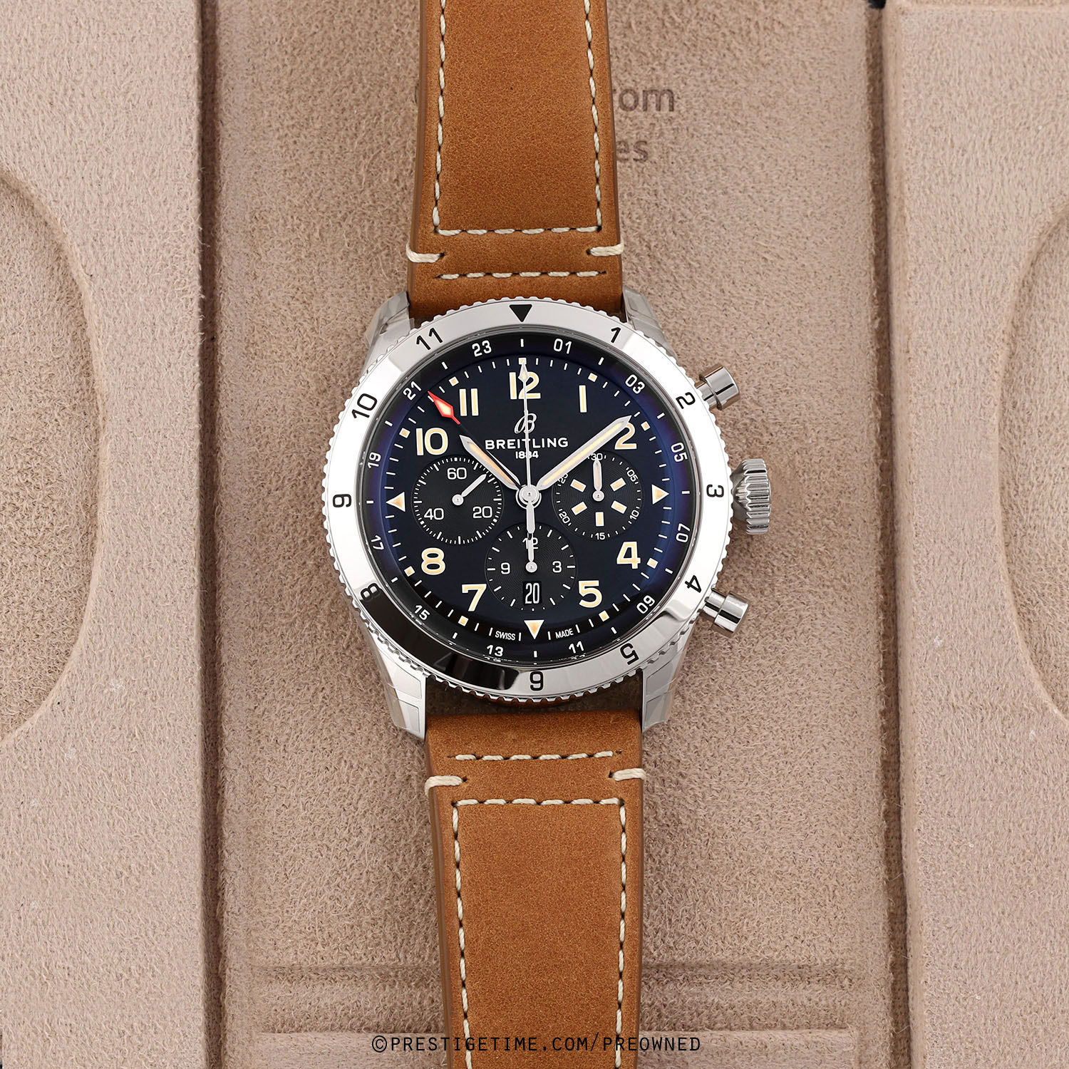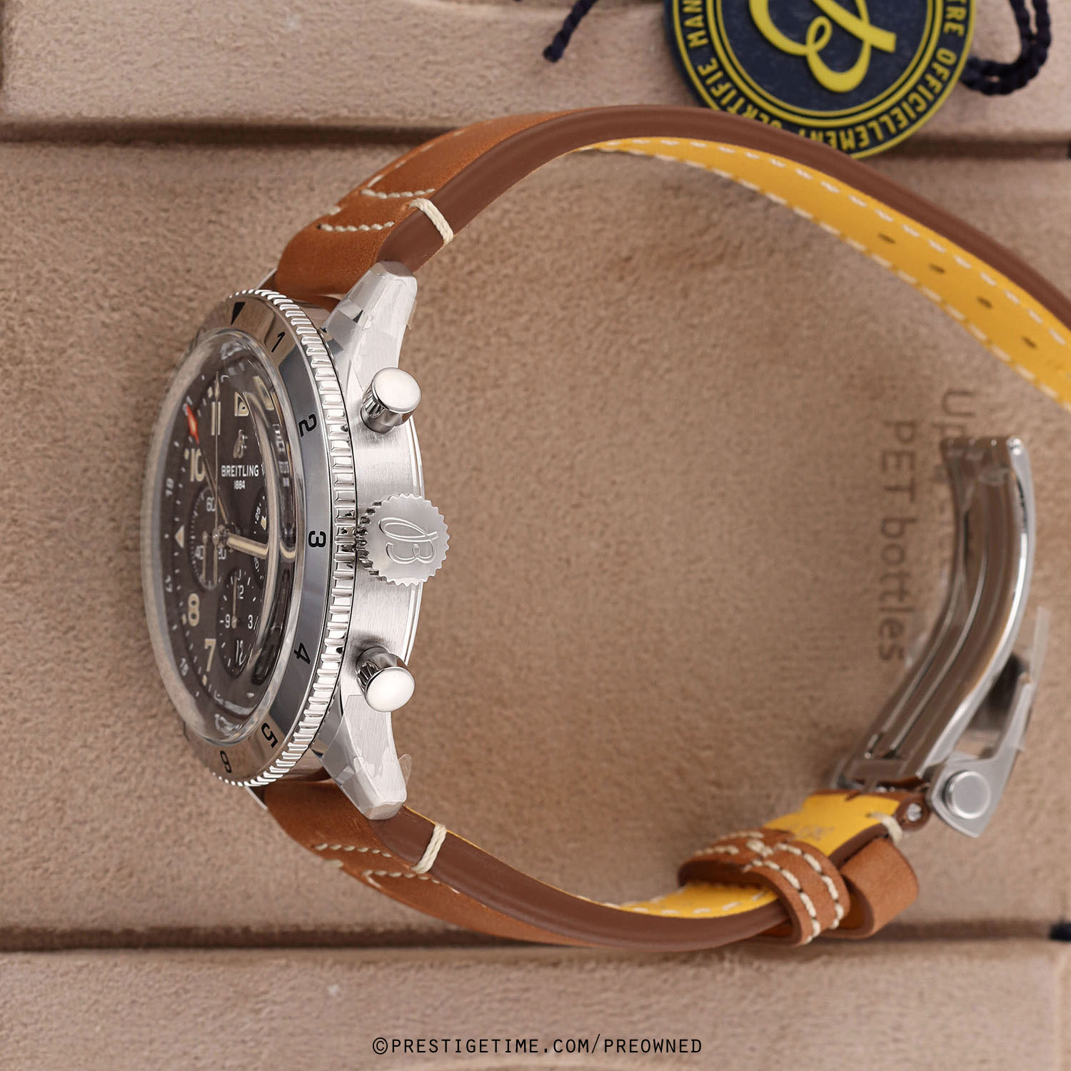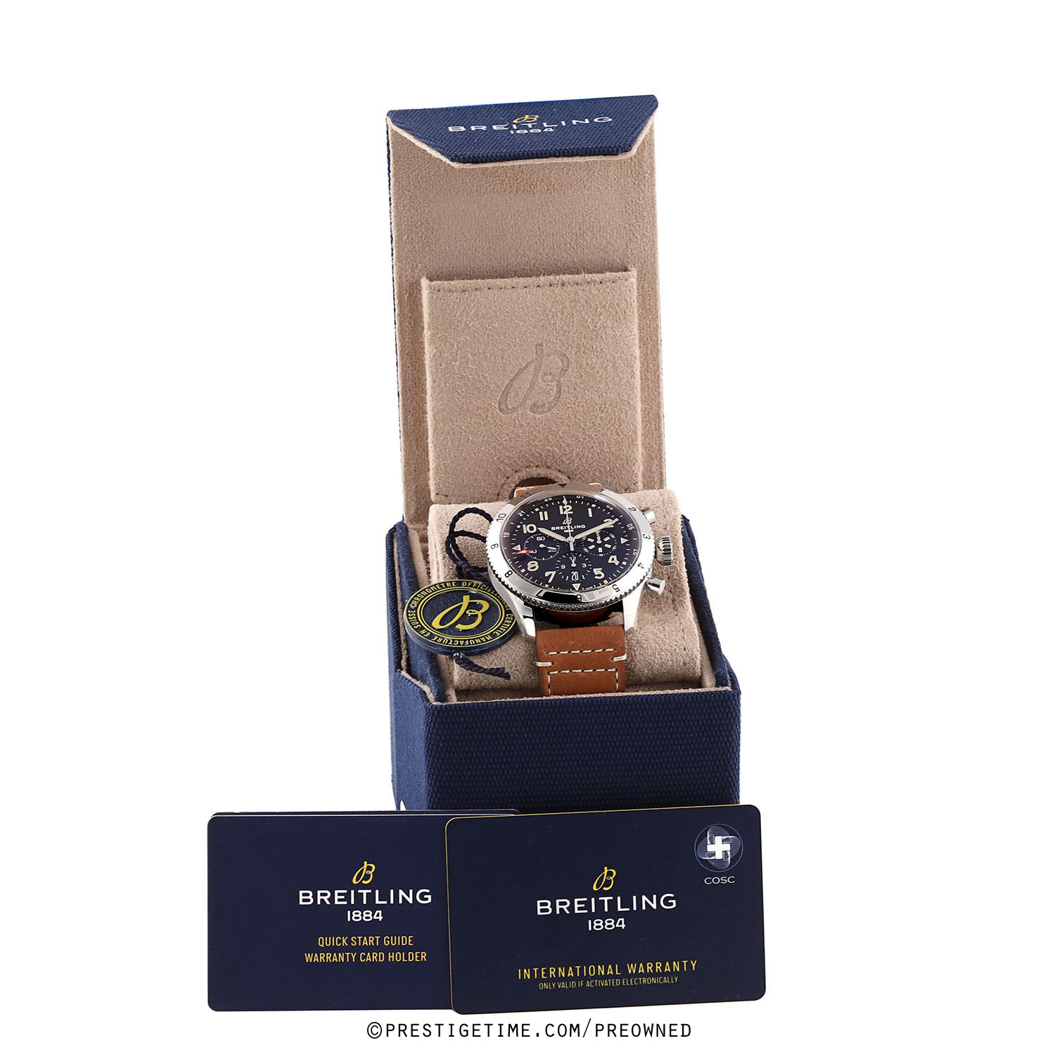 Strap: Fitted on its original Breitling brown calfskin leather strap with a push-button stainless steel deployant buckle. The strap is unworn in new condition with its full wear lifespan remaining.