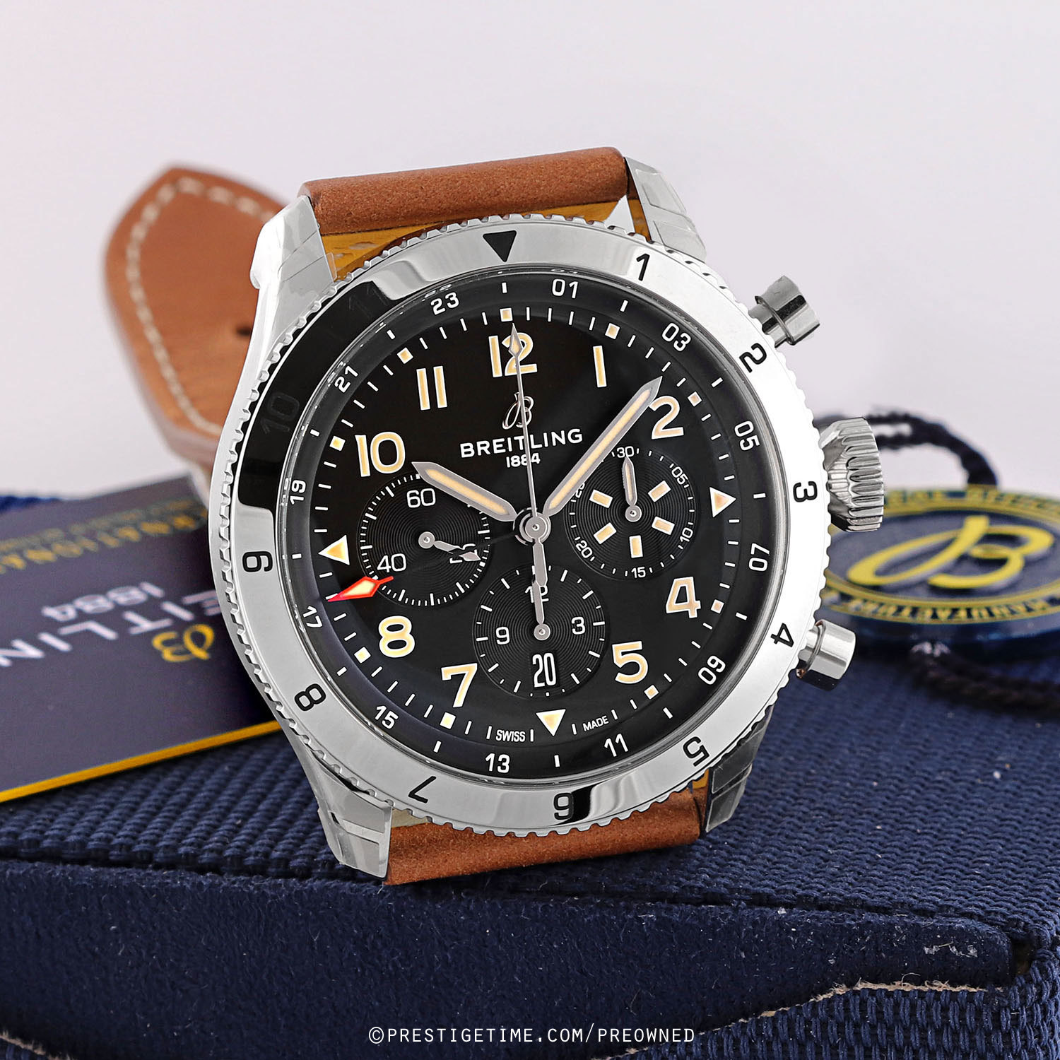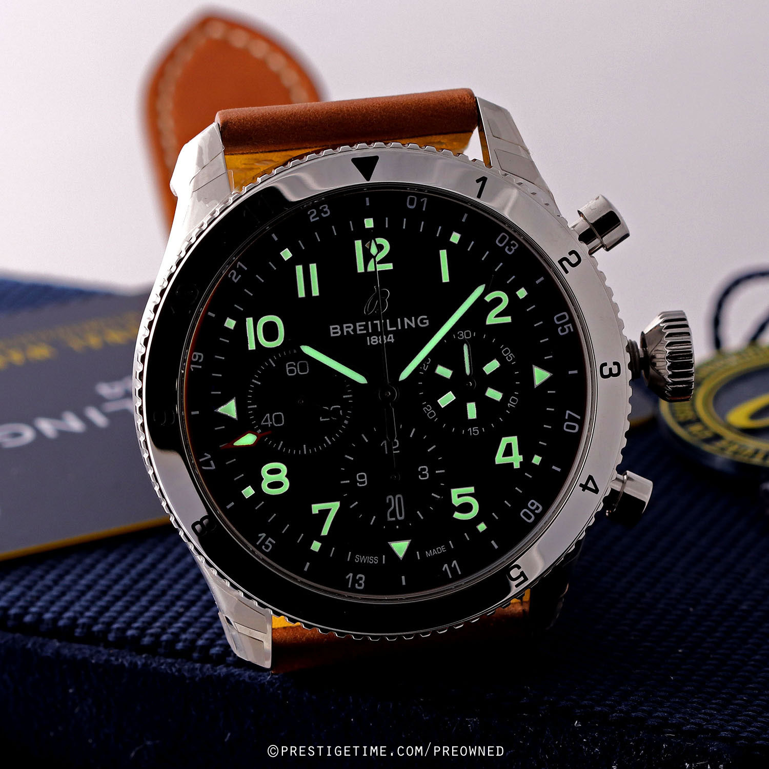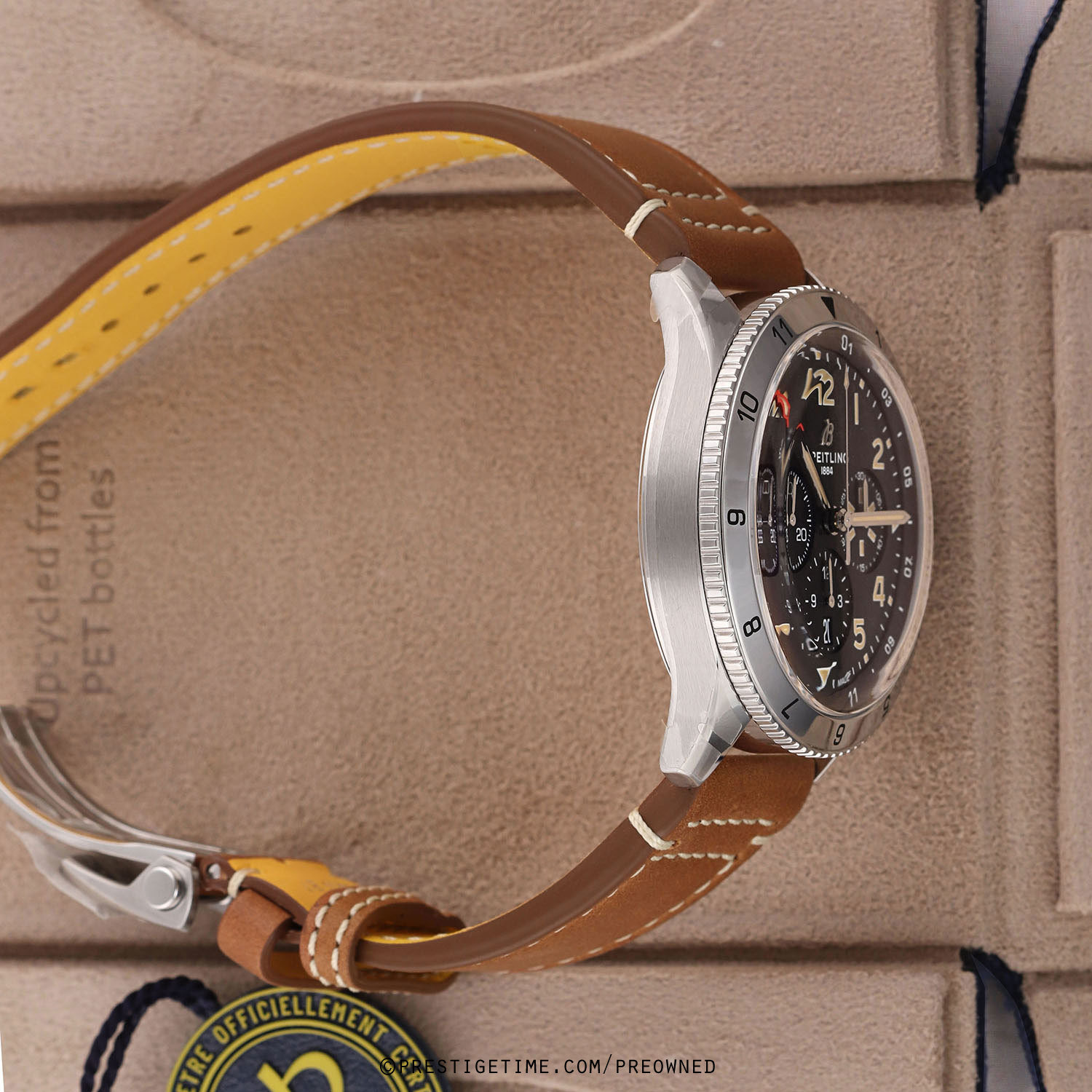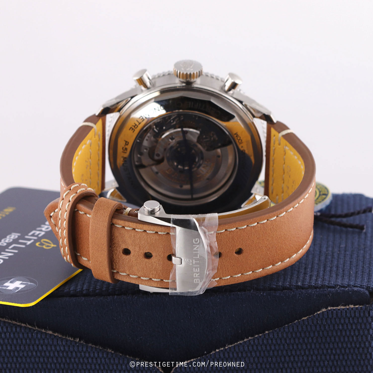 Strap: Fitted on its original Breitling brown calfskin leather strap with a push-button stainless steel deployant buckle. The strap is unworn in new condition with its full wear lifespan remaining.
