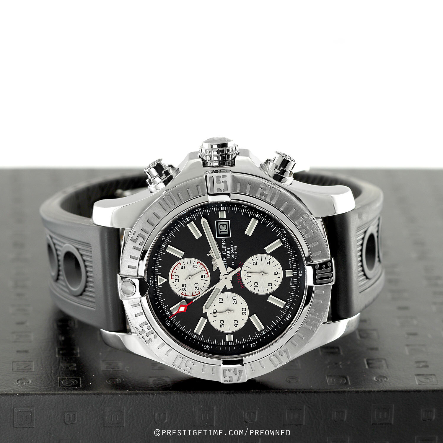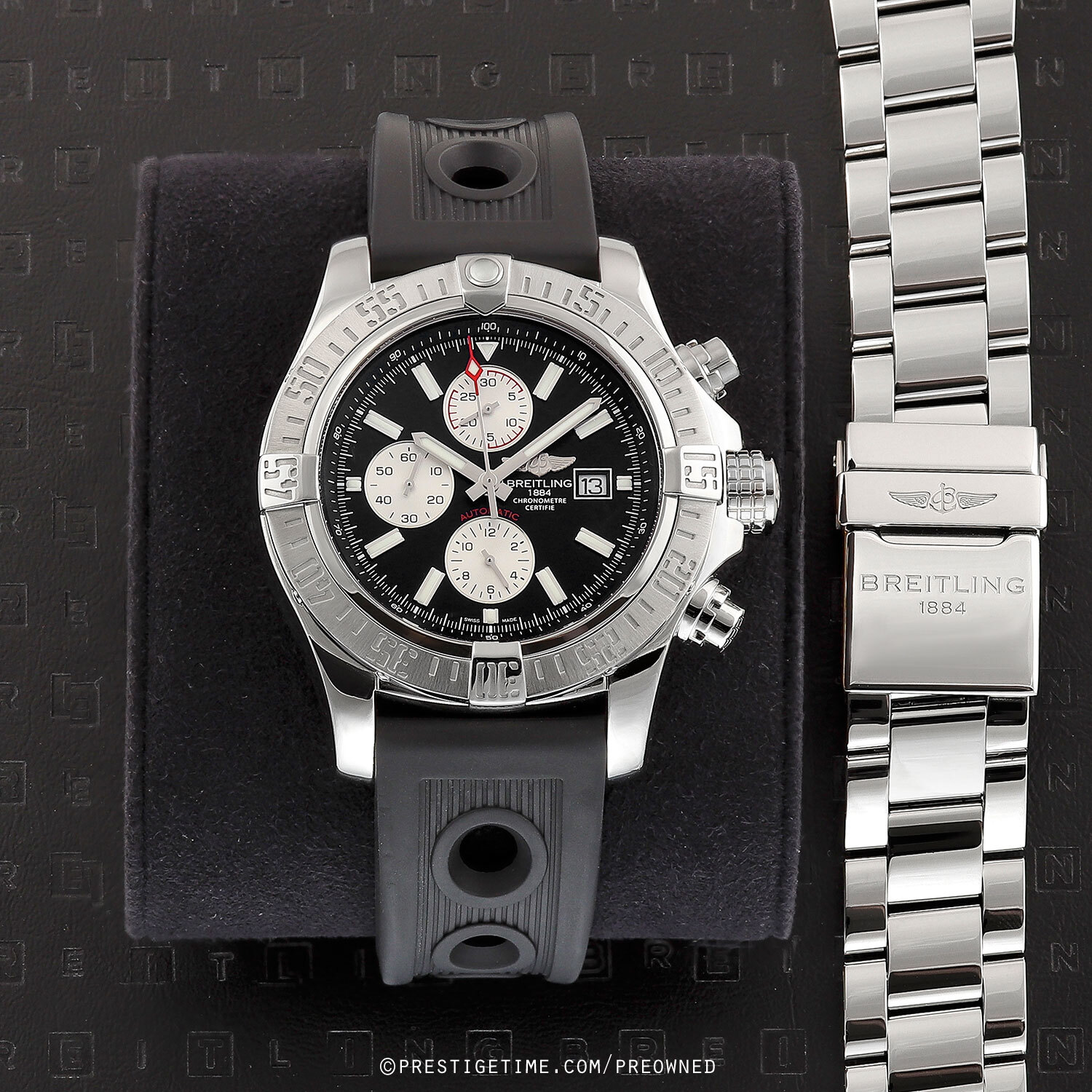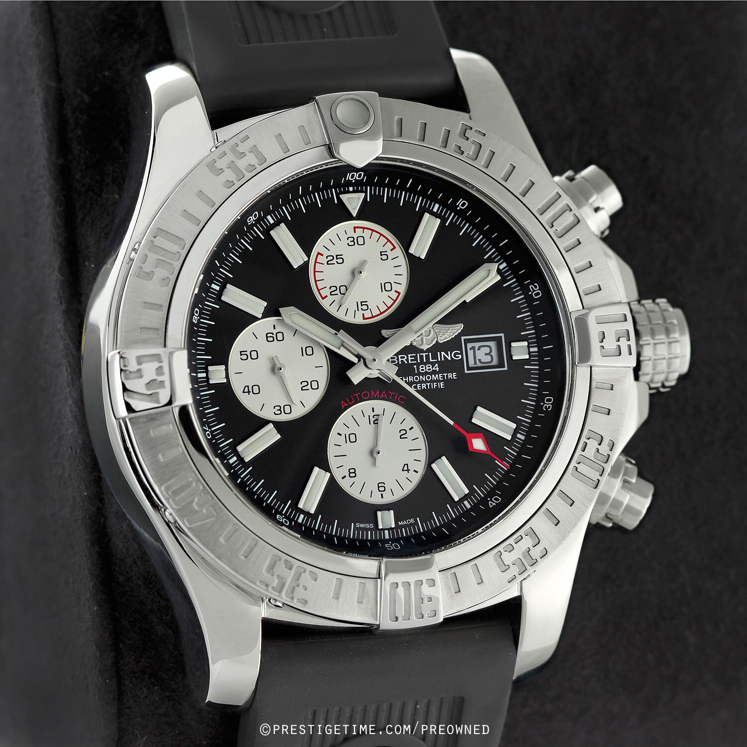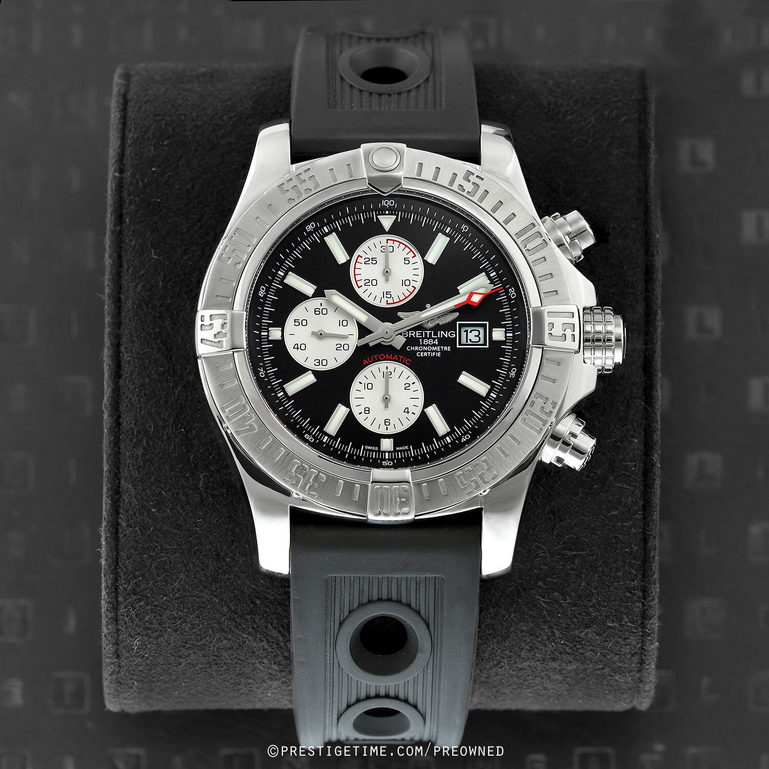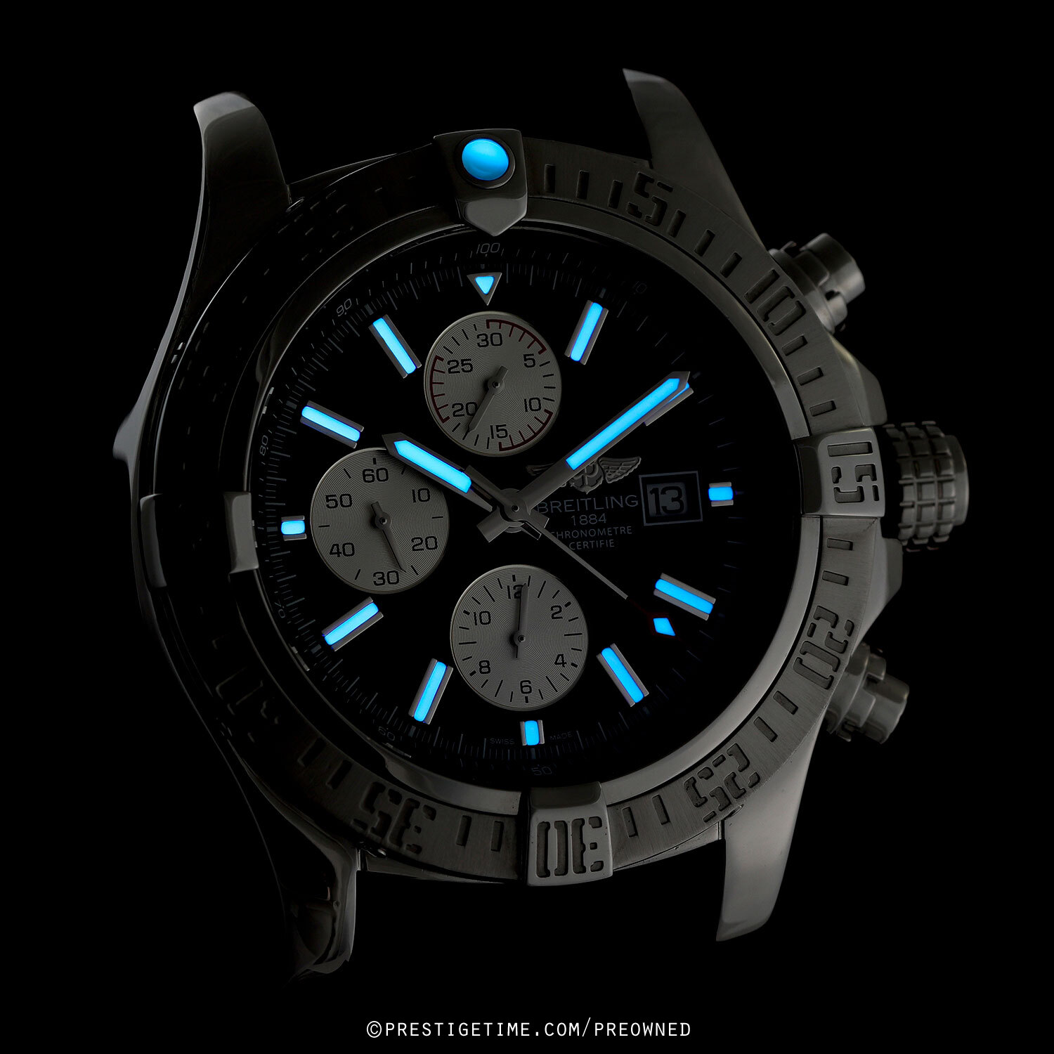Movement: Powered by a Breitling COSC certified calibre 13 (base ETA/Valjoux 7750) which beats at 28,800 vph, contains 25 jewels, and has a power reserve of +/- 42 hours.