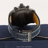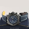 Strap: Fitted on its original Breitling blue calfskin leather strap with a fabric-like texture, contrasting white stitching, Breitlings signature yellow calfskin lining & a black DLC coated push-button deployant buckle. The strap is excellent near-new condition with the vast majority of its wear lifespan remaining. We would rate this strap in 98% overall condition.