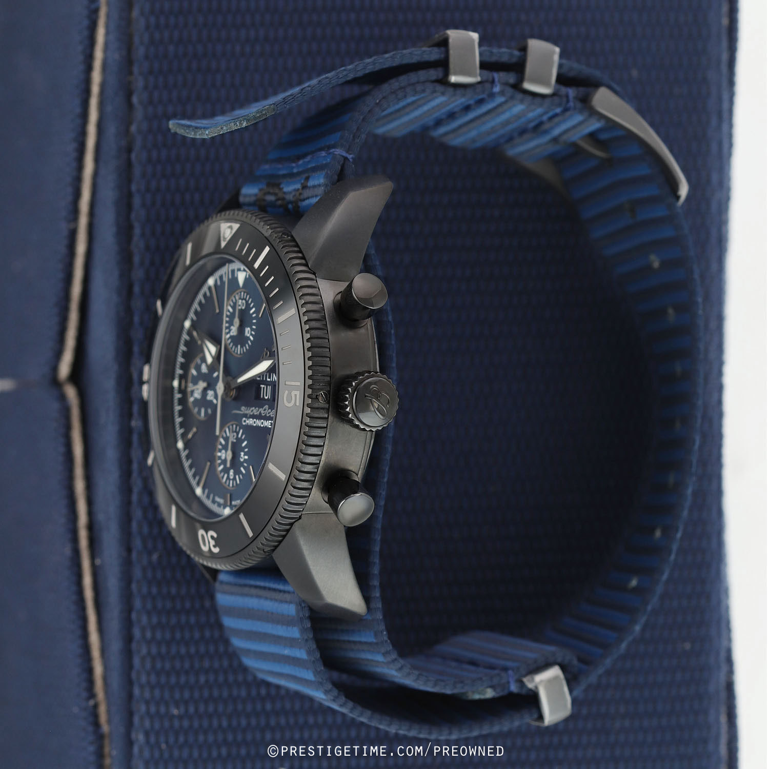 Case: Matte finished BLACKSTEEL (Breitling's DLC coating) stainless steel case. Matte BLACKSTEEL uni-directional bezel featuring a polished black ceramic bezel with a 60 minute diving scale. BLACKSTEEL crown & chrono buttons. Blue dial. Darkened polished hour & minute hands with luminous fill. Applied darkened index hour markers. Luminous dote hour markers. Fine printed minute/seconds & fractions of a second track. Day & date windows at 3 o'clock. Small seconds sub-dial at 9 o'clock.