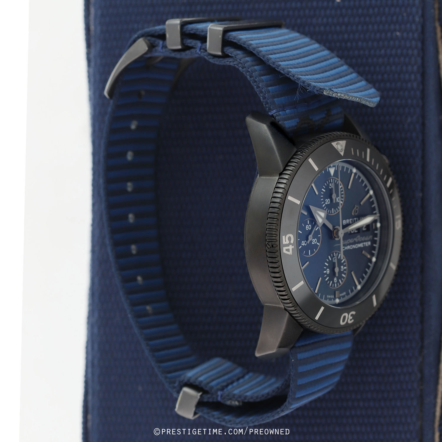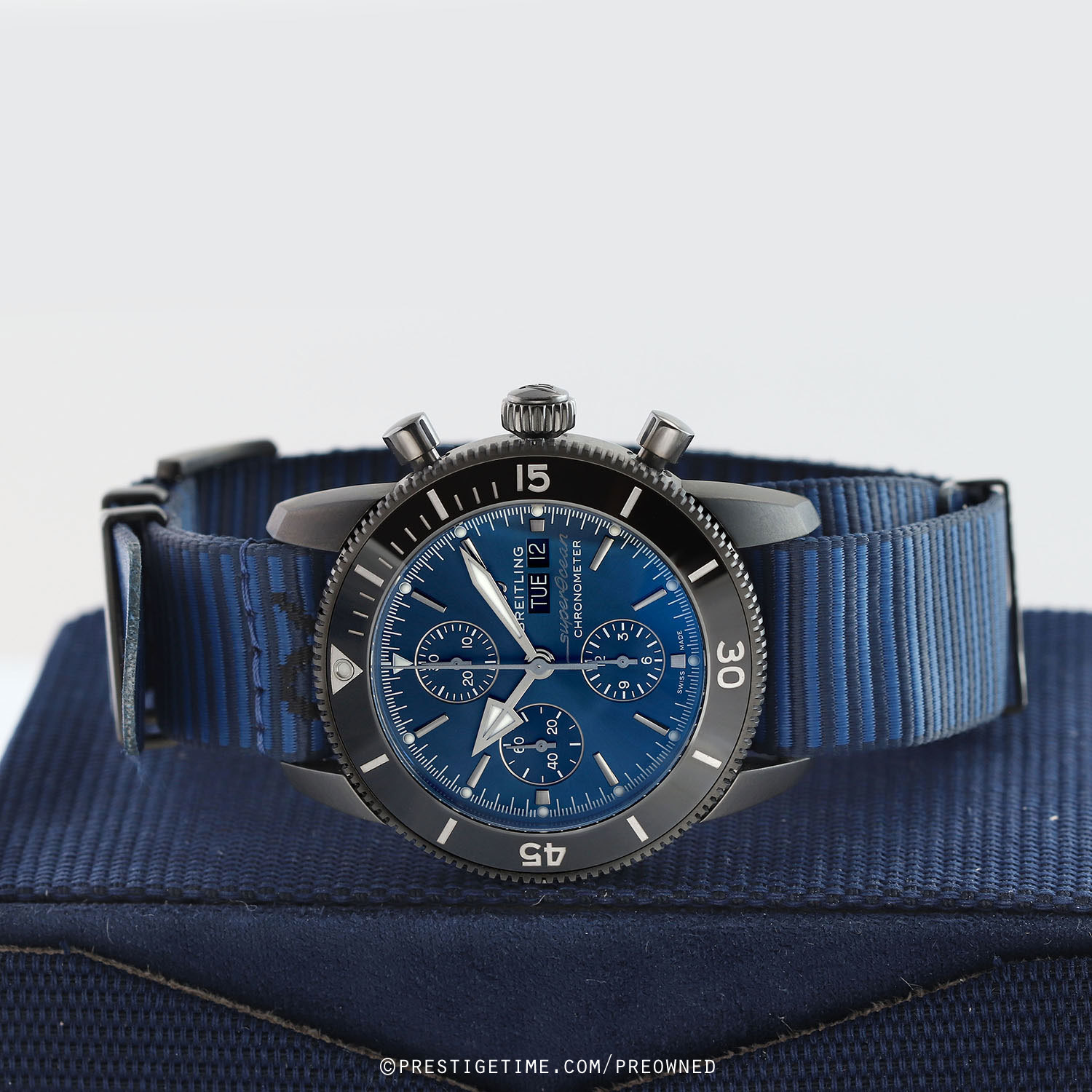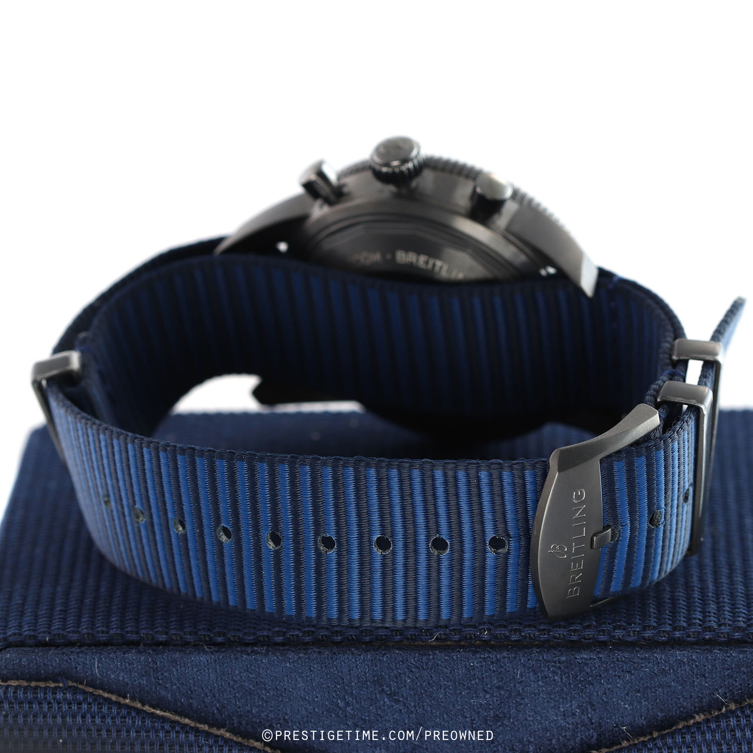 Strap: Fitted on its original Breitling/Outerknown blue NATO style strap made from ECONYL® yarn, created from nylon waste, and is fitted with black DLC coated stainless steel tang buckle & strap keepers. The strap is in unworn in new condition with its full wear lifespan remaining.