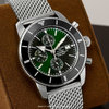 Case: Polished stainless steel case. Uni-directional turning bezel with polished black ceramic bezel insert, featuring a 5 minute scale & a luminous dot at zero. . Polished crown & buttons. Deep metallic dark green dial. Very dark green, almost grey, sub-dials with a fine concentric circle finish. Polished hands, the hour & minute hands with luminous fill. Applied polished index hour markers. Painted luminous hour markers. Fine printed minute/seconds & fractions of a second track. Day window at 3 o'clock. Small seconds sub-dial at 9 o'clock.