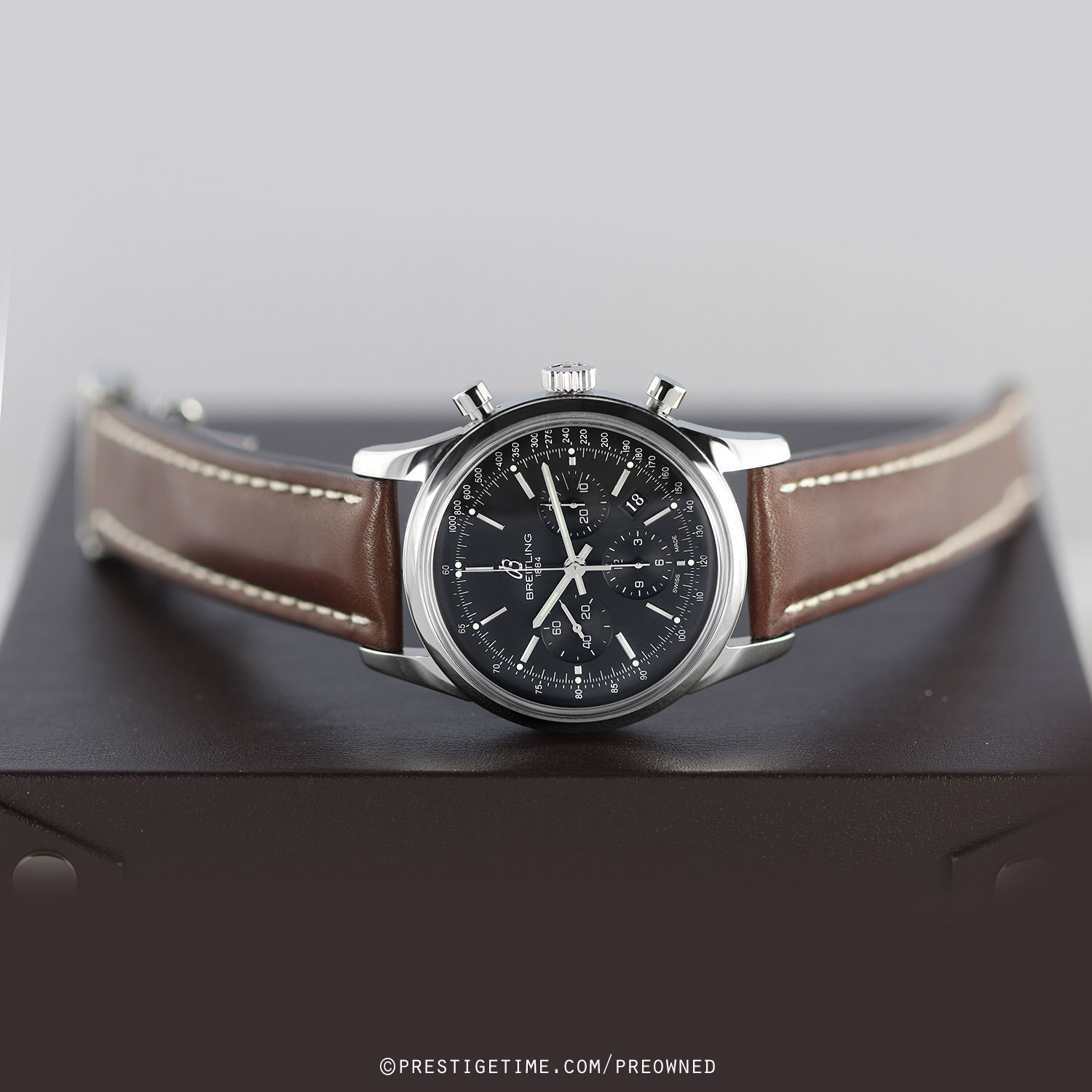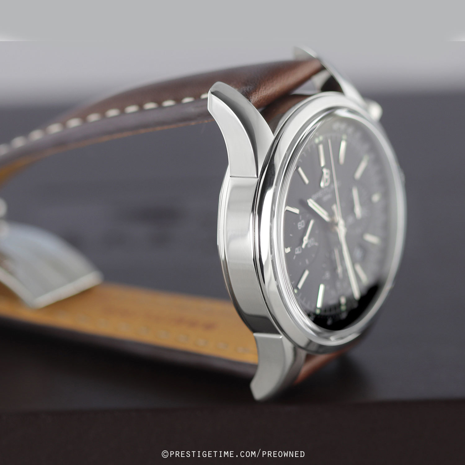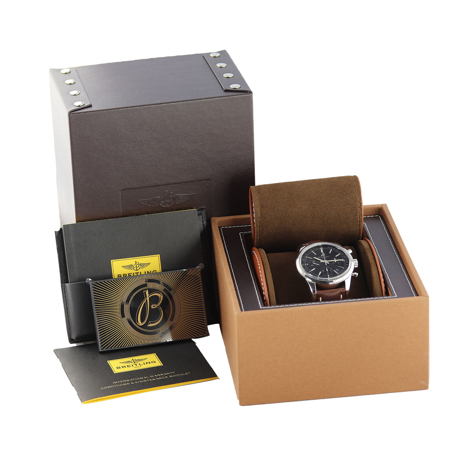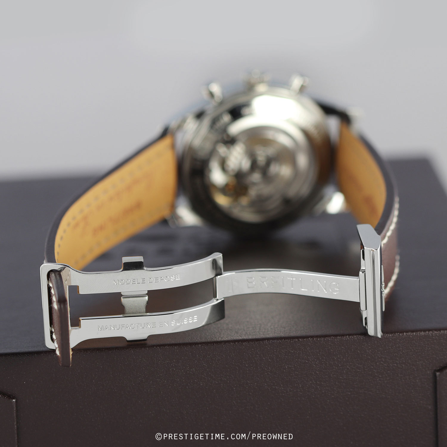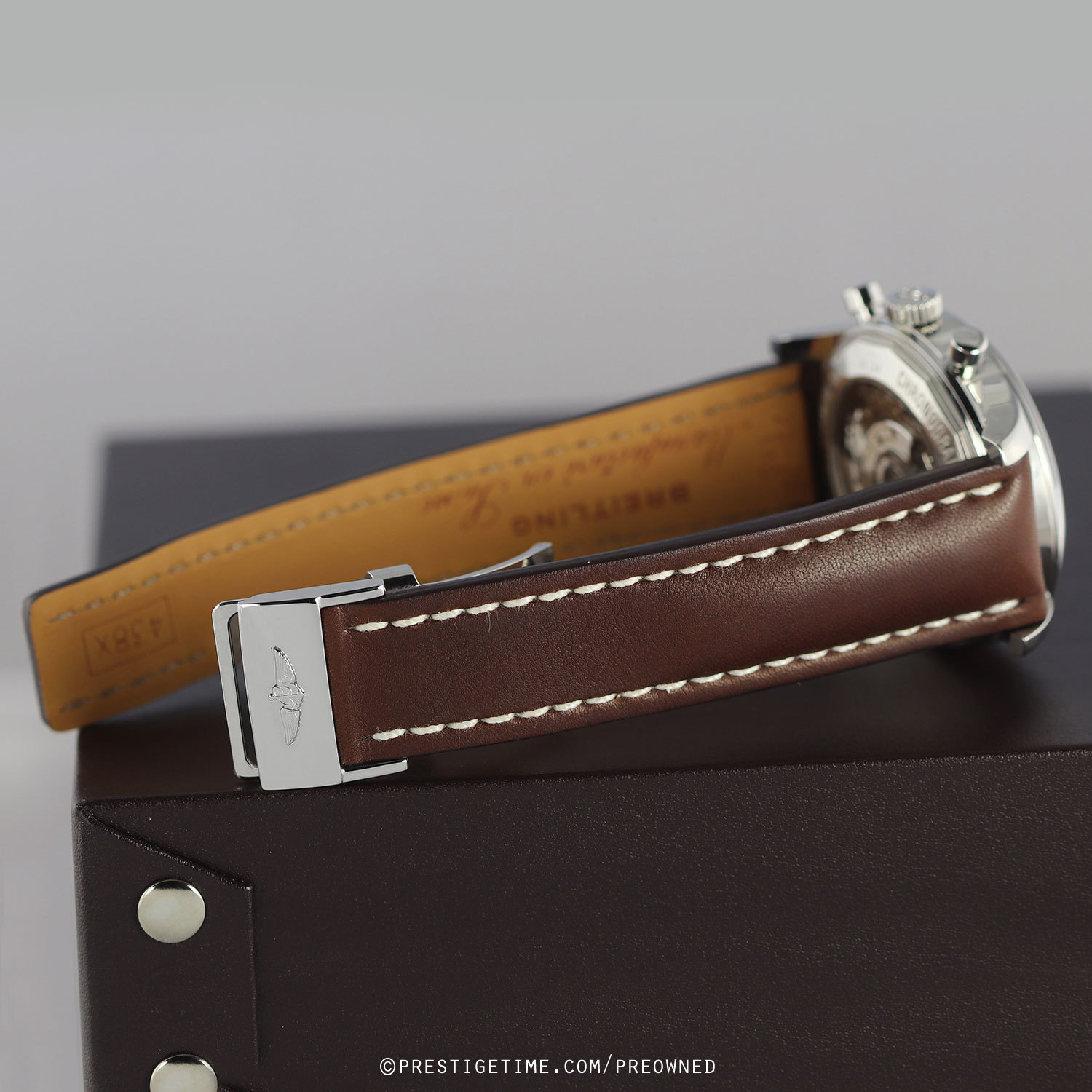 Strap: Fitted on a brand new & unworn Breitling original dark brown calfskin leather strap with polished stainless steel deployant buckle.