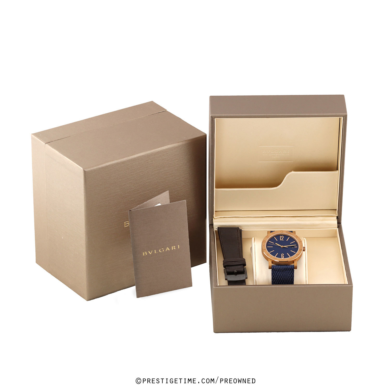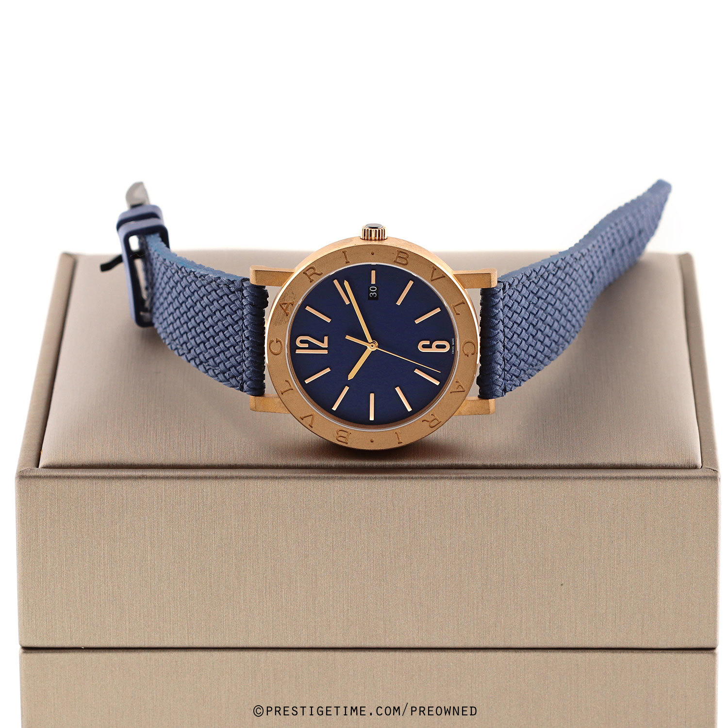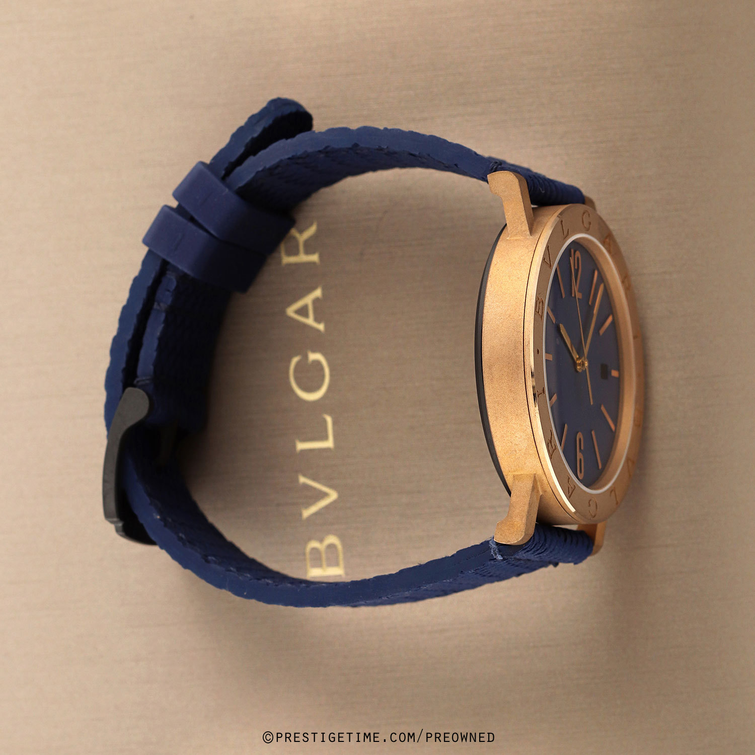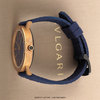 Case: Brushed & polished bronze case. Bronze bezel engraved with the iconic BVLGARI•BVLGARI logo. Crown set with single black onyx cabochon. Black PVD coated titanium case back. Blue dial. Polished hands. Applied polished hour markers. Date window at 3 o'clock.
