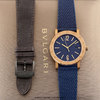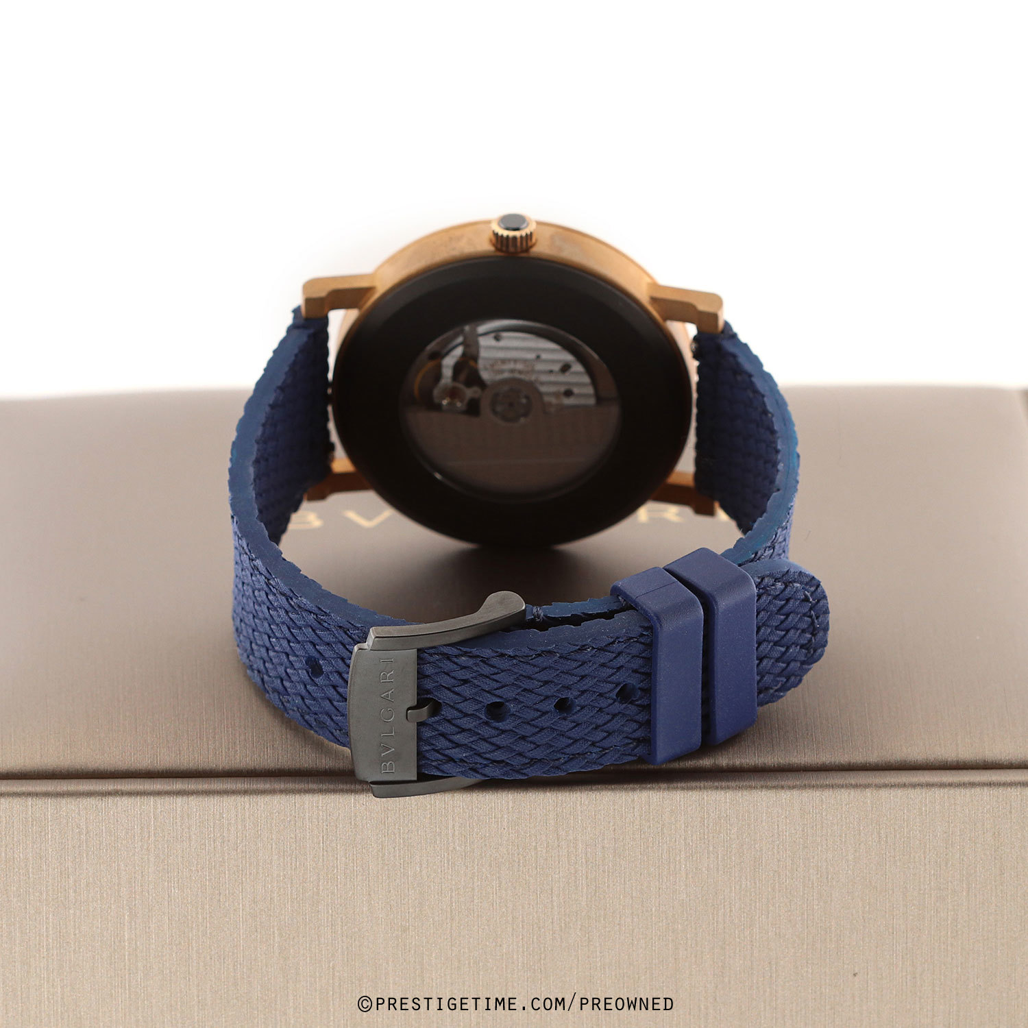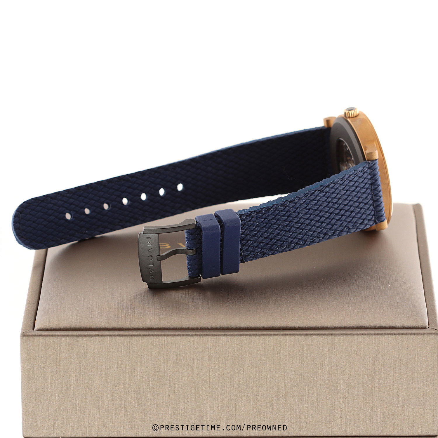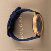 - Fitted on it original Bulgari blue weave design rubber strap with a black PVD coated tang buckle. This strap is unworn with its full wearl lifespan remaining.