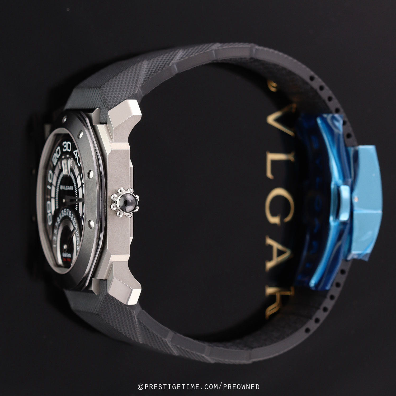 Strap: Fitted on its BVLGARI original black rubber strap with a stainless steel push-button deployant buckle. The strap is brand new & unworn. The strap is uncut at its full length, fitting up to an 8.25" wrist, it would most likely need to be cut down to size.