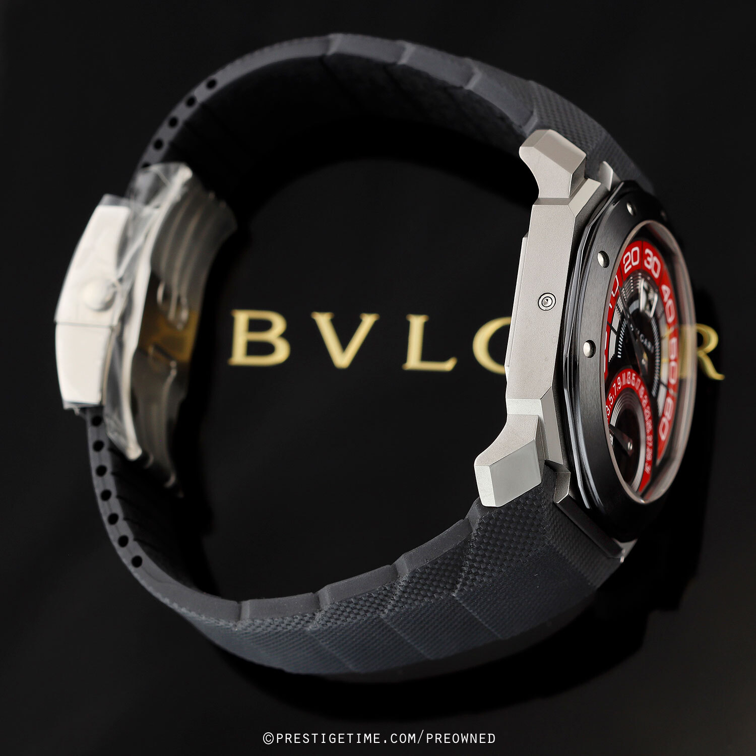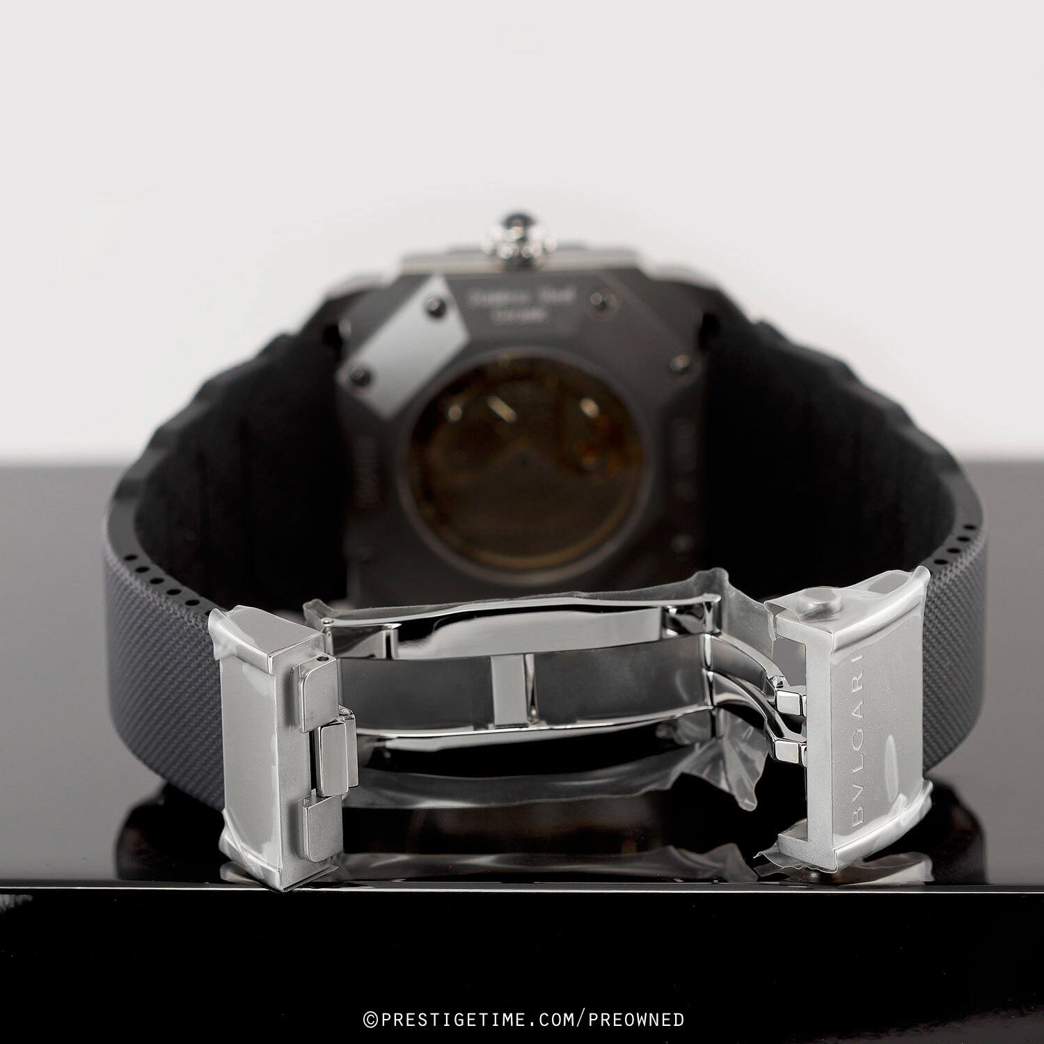 Strap: Fitted on its BVLGARI original black rubber strap with a stainless steel push-button deployant buckle. The strap is unworn & full length, will need to be cut down to size.