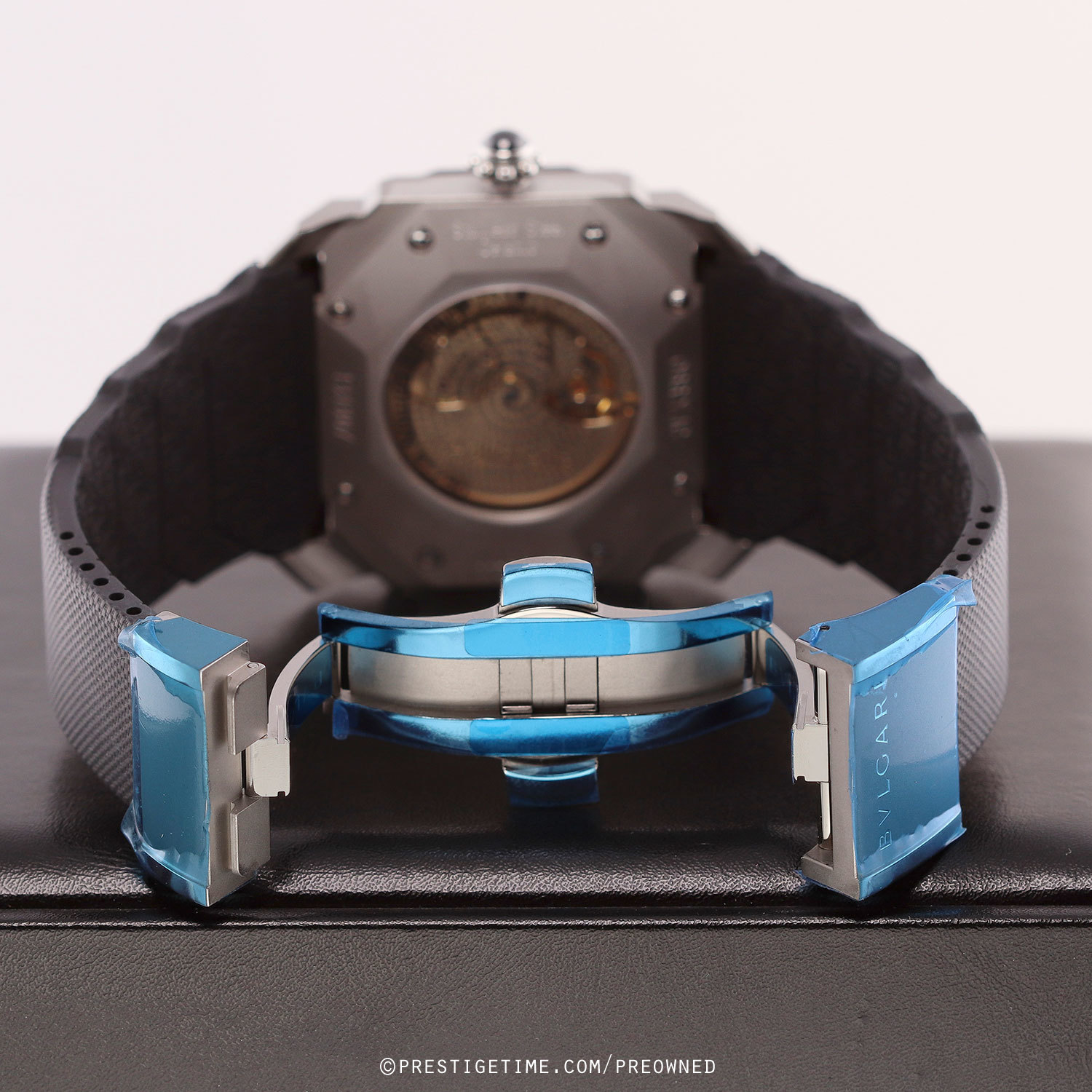 Strap: Fitted on its BVLGARI original black rubber strap with a stainless steel push-button deployant buckle. The strap is unworn & full length, will need to be cut down to size.