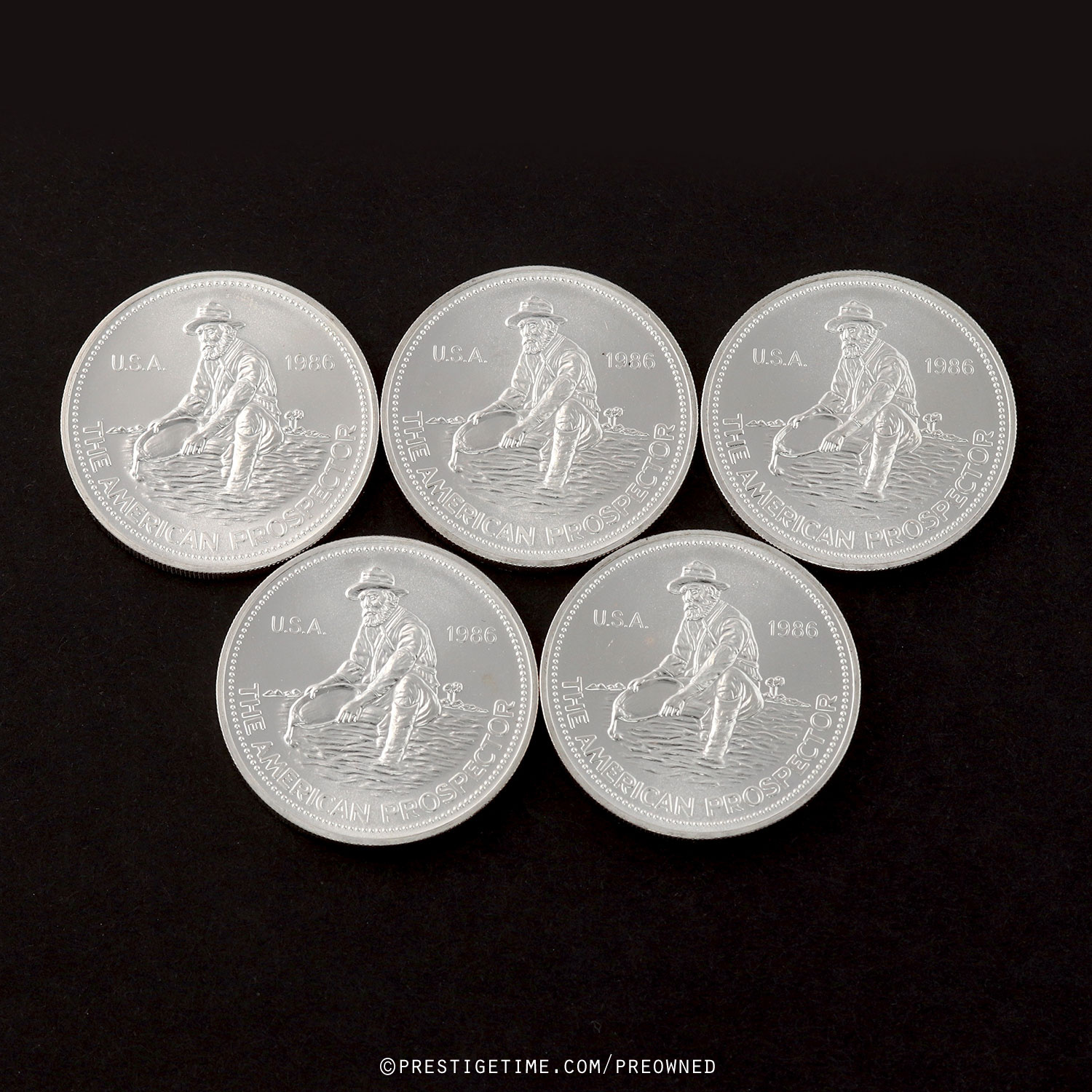 • 5 x 1 troy ounce 1986 Engelhard Prospector silver rounds of .999+ fine silver.