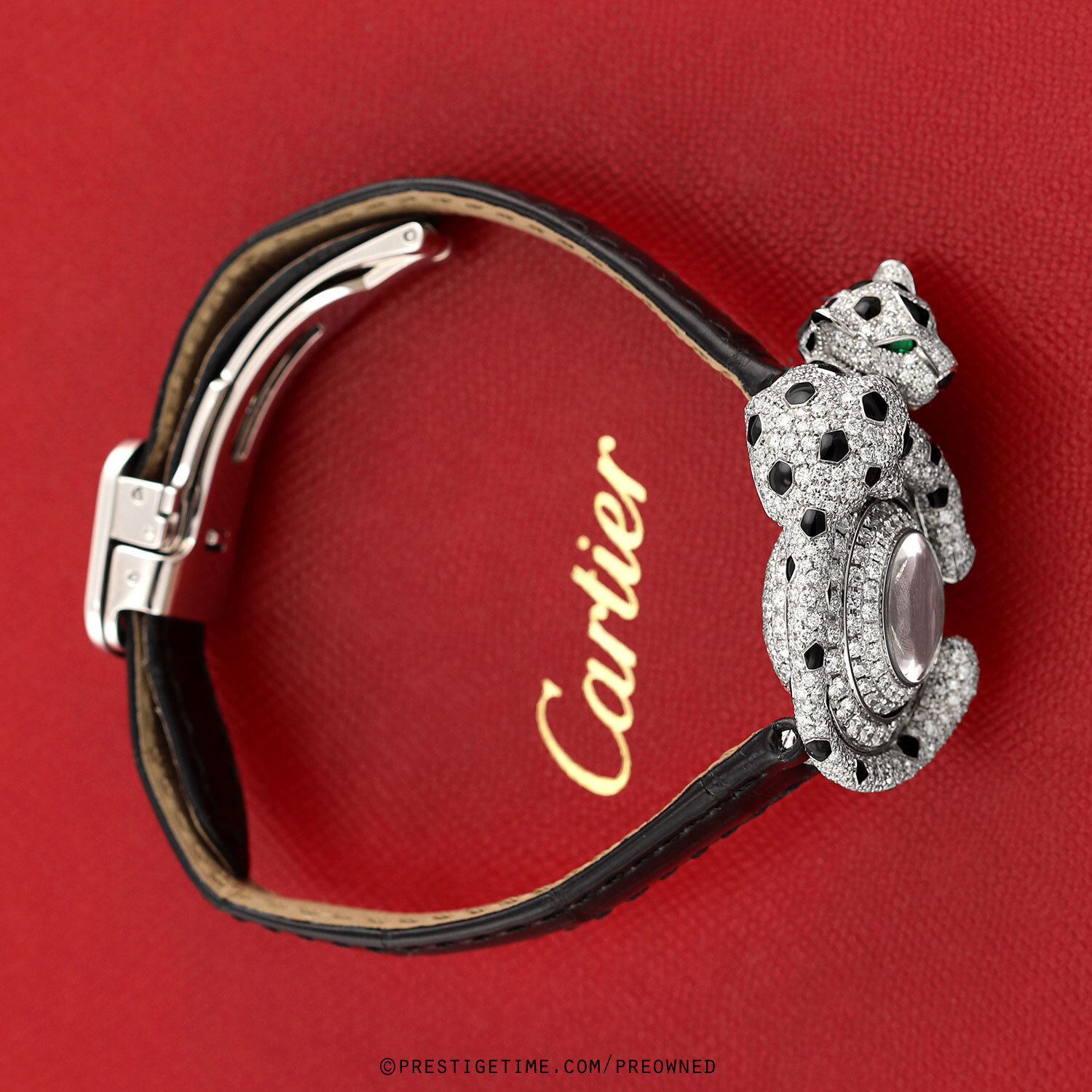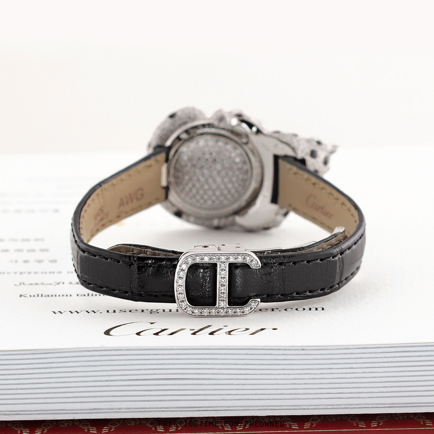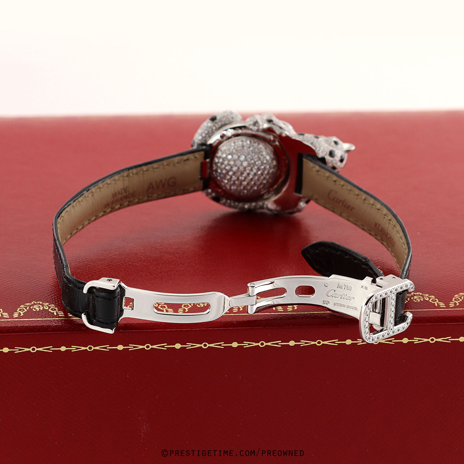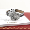 - Fitted on its original Cartier black alligator leather strap with a solid 18kt white gold deployant buckle. The buckle top is factory set with 30 diamonds. The strap is in excellent, near new condition with its full wear lifespan remaining. We would be comfortable rating the strap in 98% overall condition.