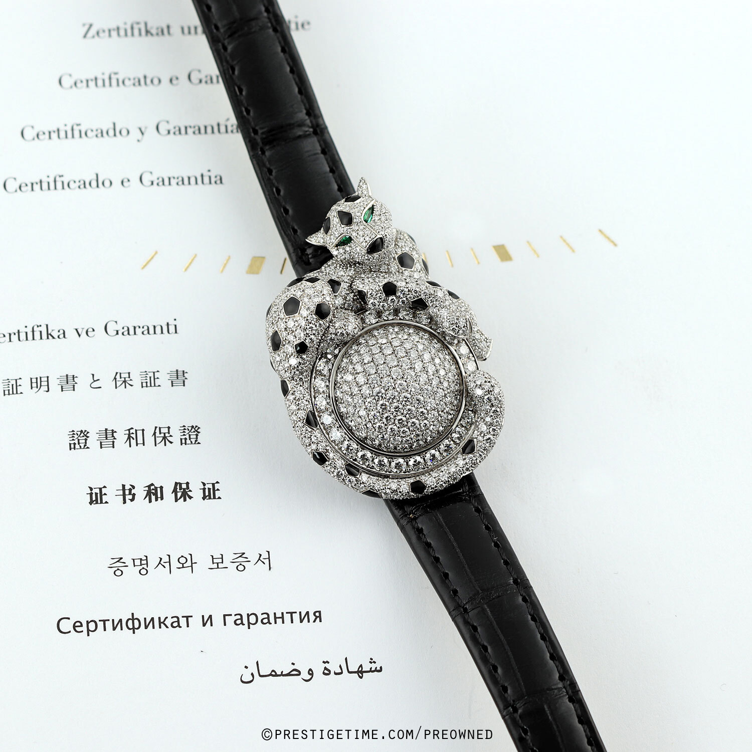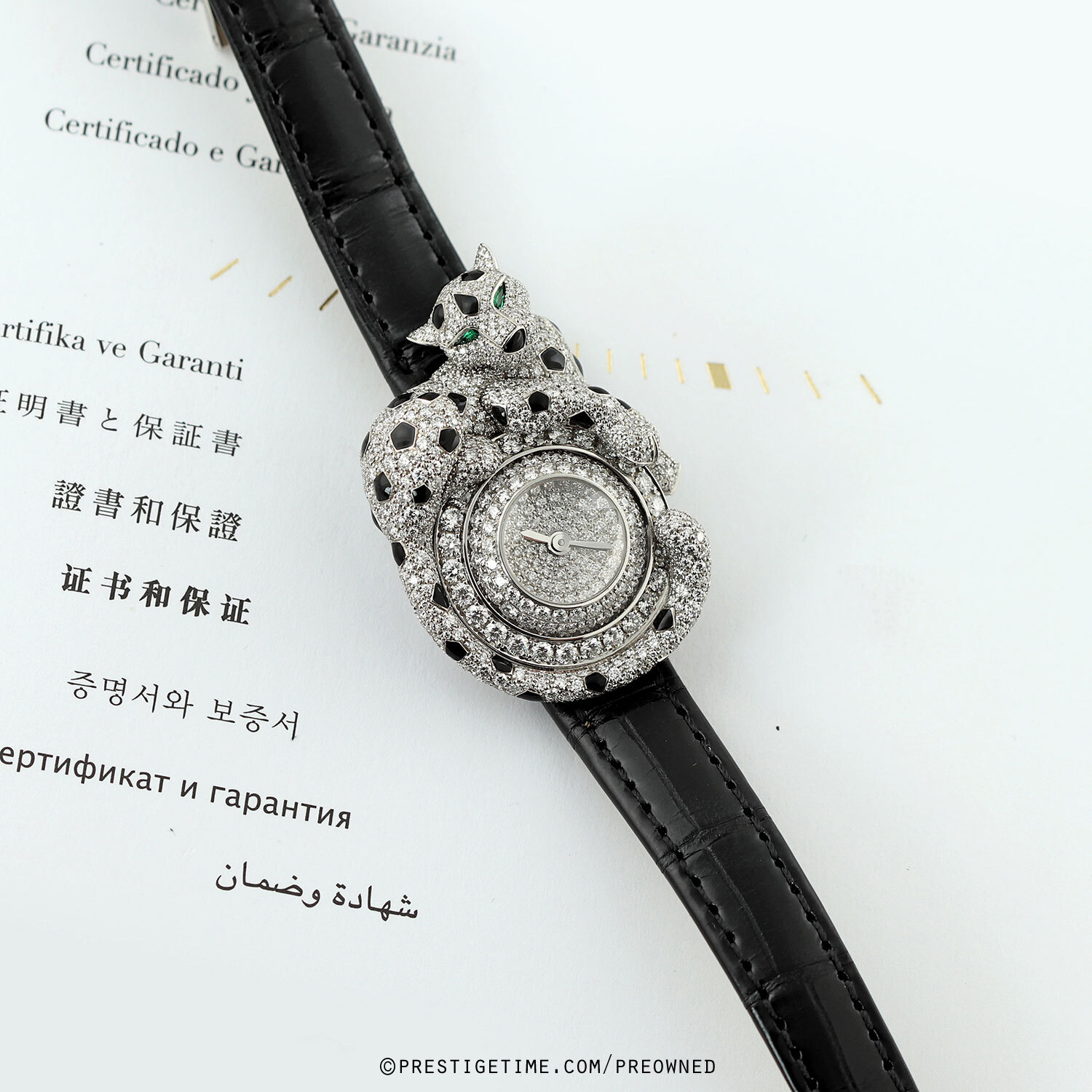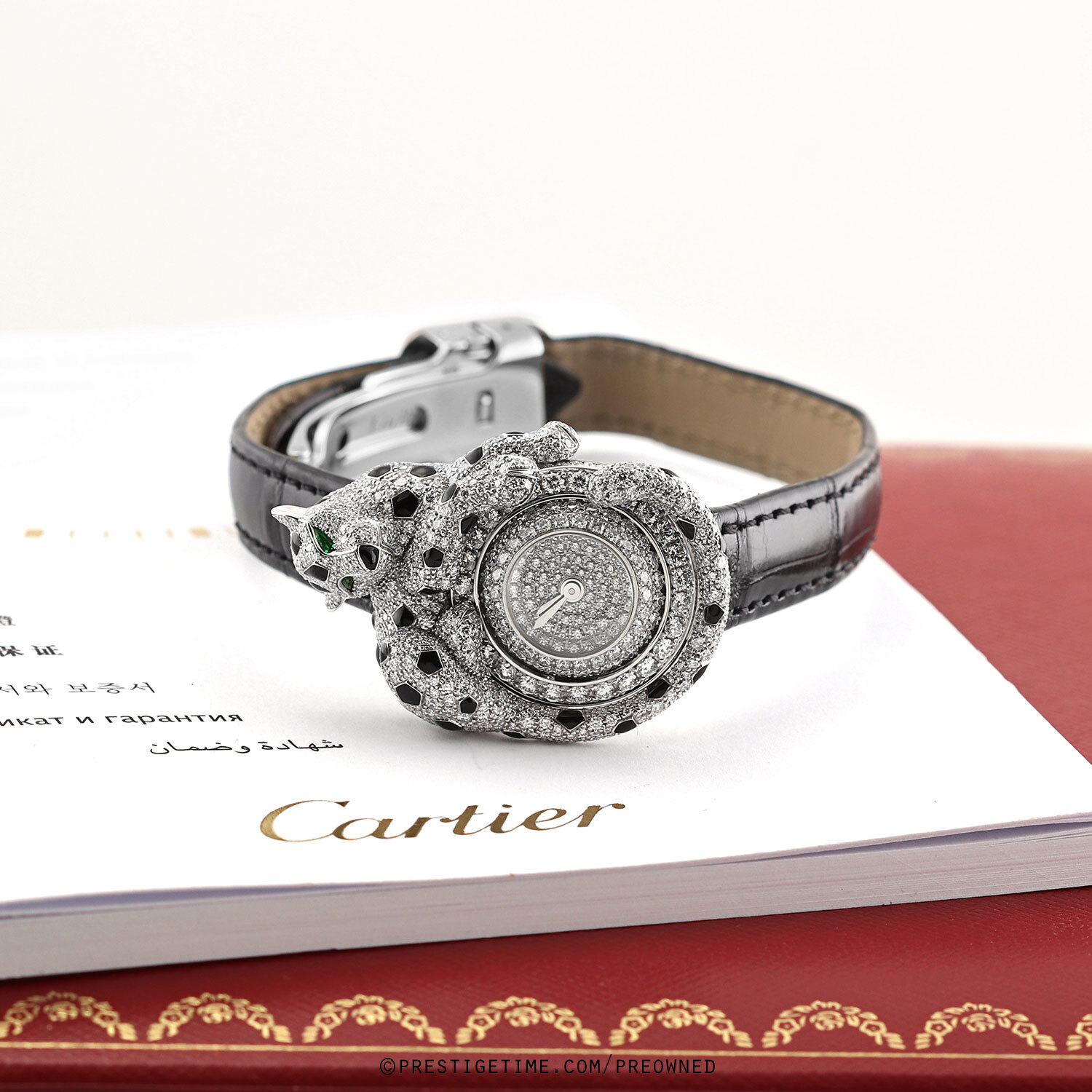 - Fitted on its original Cartier black alligator leather strap with a solid 18kt white gold deployant buckle. The buckle top is factory set with 30 diamonds. The strap is in excellent, near new condition with its full wear lifespan remaining. We would be comfortable rating the strap in 98% overall condition.