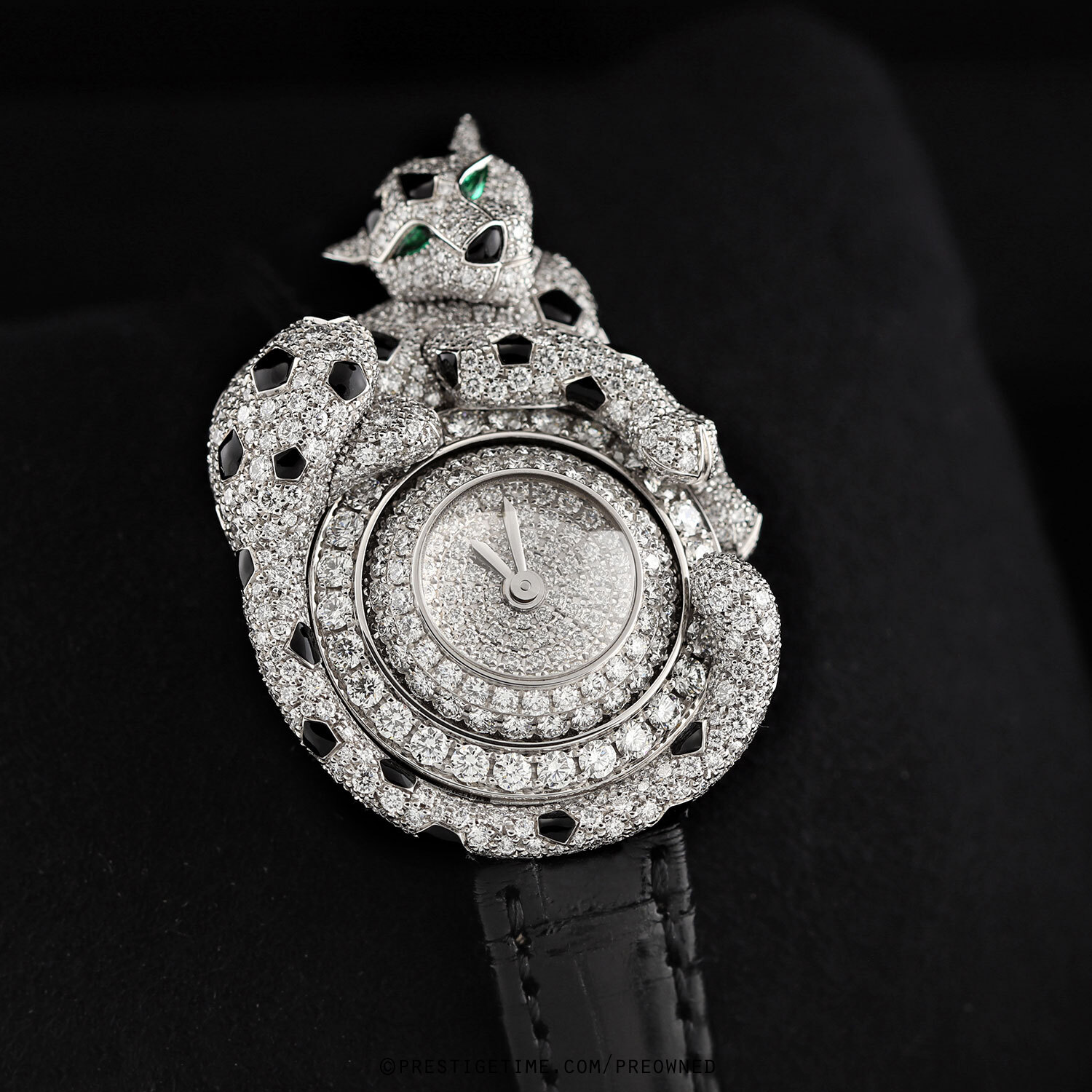 Case: 18kt white gold case pave set with diamonds, emeralds, onyx & black lacquer spots: