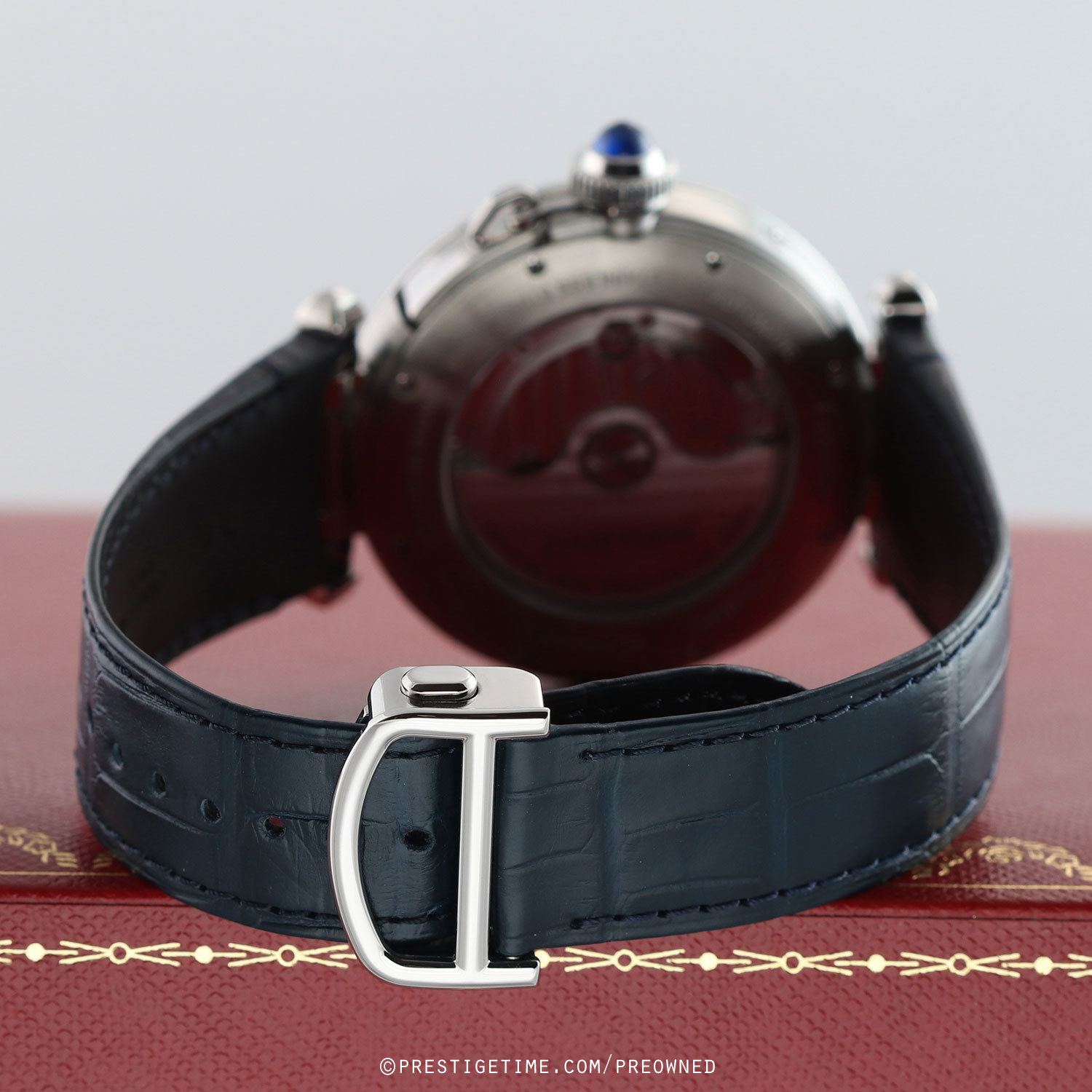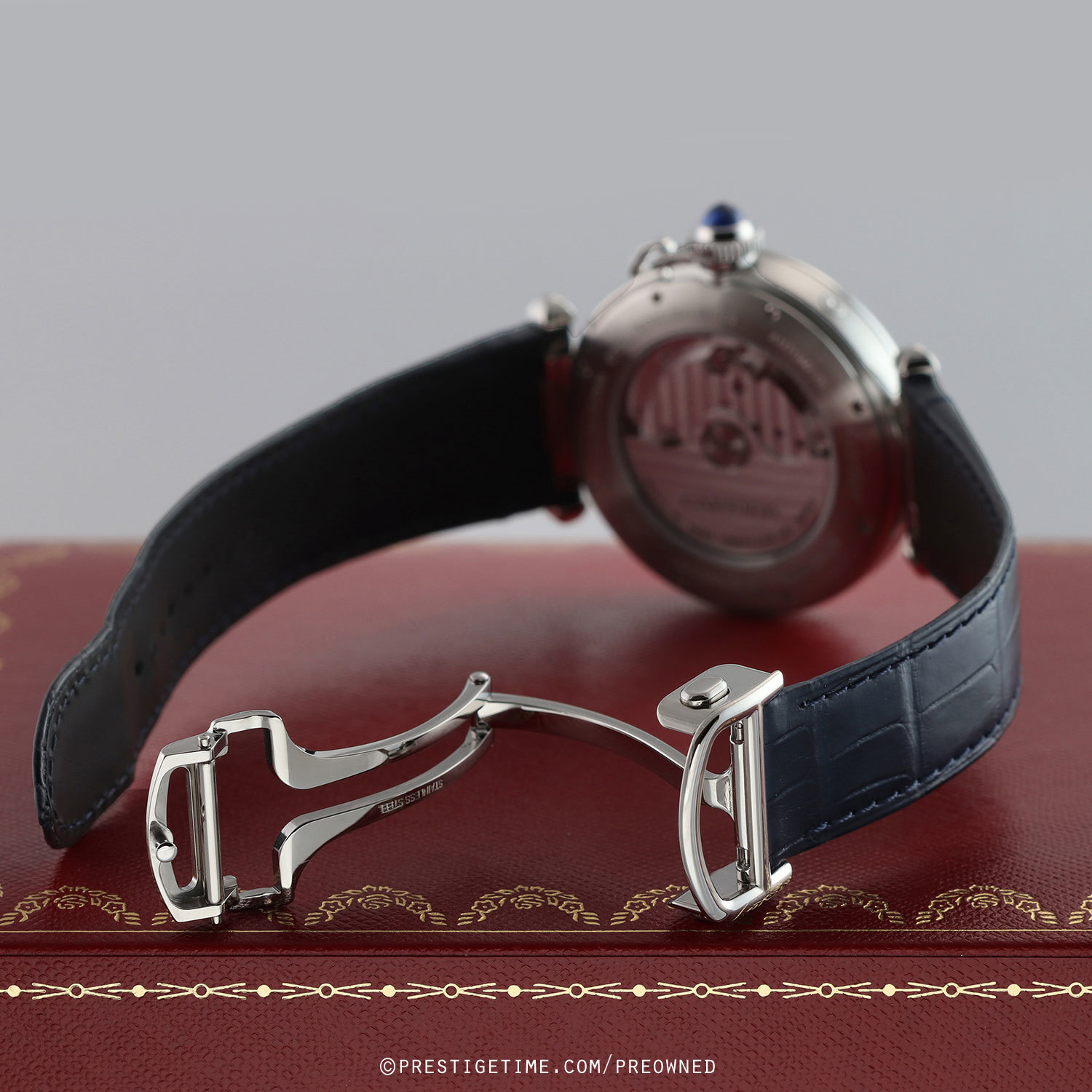 - Fitted on its original Cartier blue alligator leather strap with a stainless steel deployant clasp. The strap is in excellent near-new condition with the majority of its wear lifespan remaining. We would rate the strap in 95% condition.
