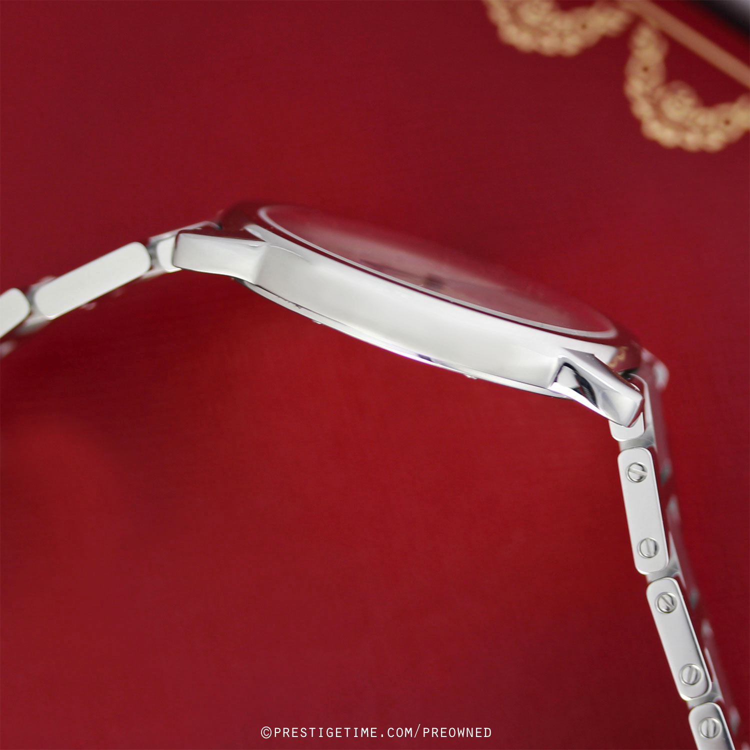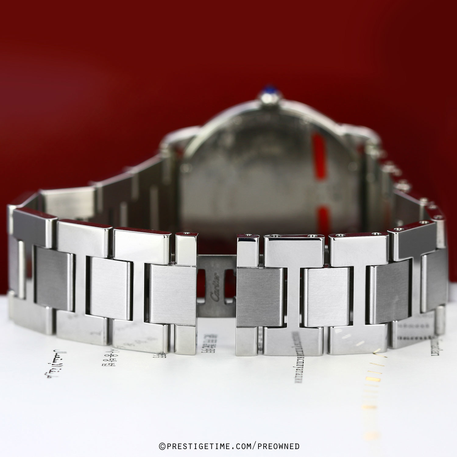 Classic Cartier! This watch has rarely been worn. Polished steel case. Silver dial with black Roman numeral hour markings, black printed minute track & 5 minute indications in Arabic numerals. Blues steel hands. The bracelet is polished finished with brushed finished center links.