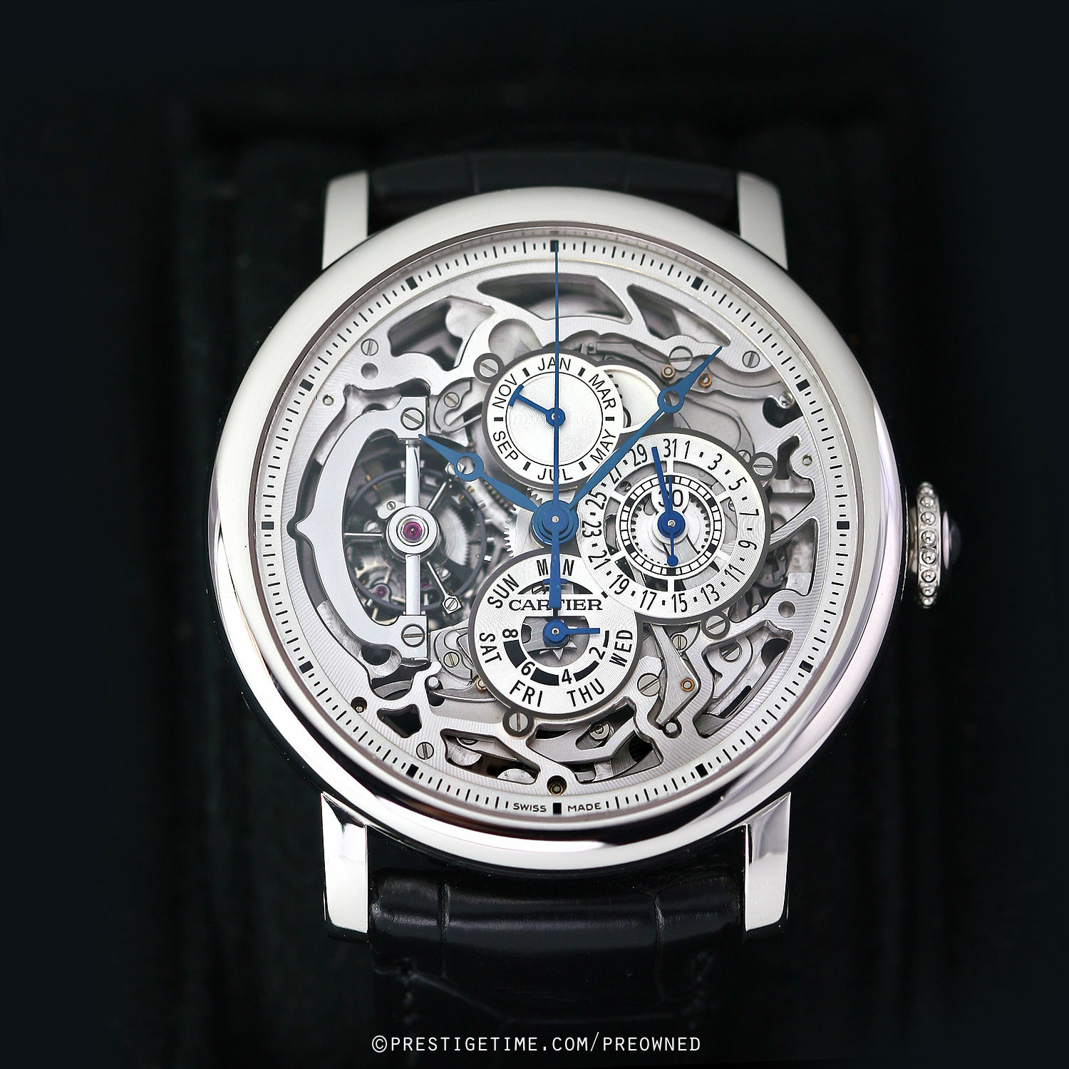 - Perpetual Calendar: Date on perimeter of the sub-dial at 3 o'clock. Day of the week on perimeter of the sub-dial at 6 o'clock. Month sub-dial at 12 o'clock.
