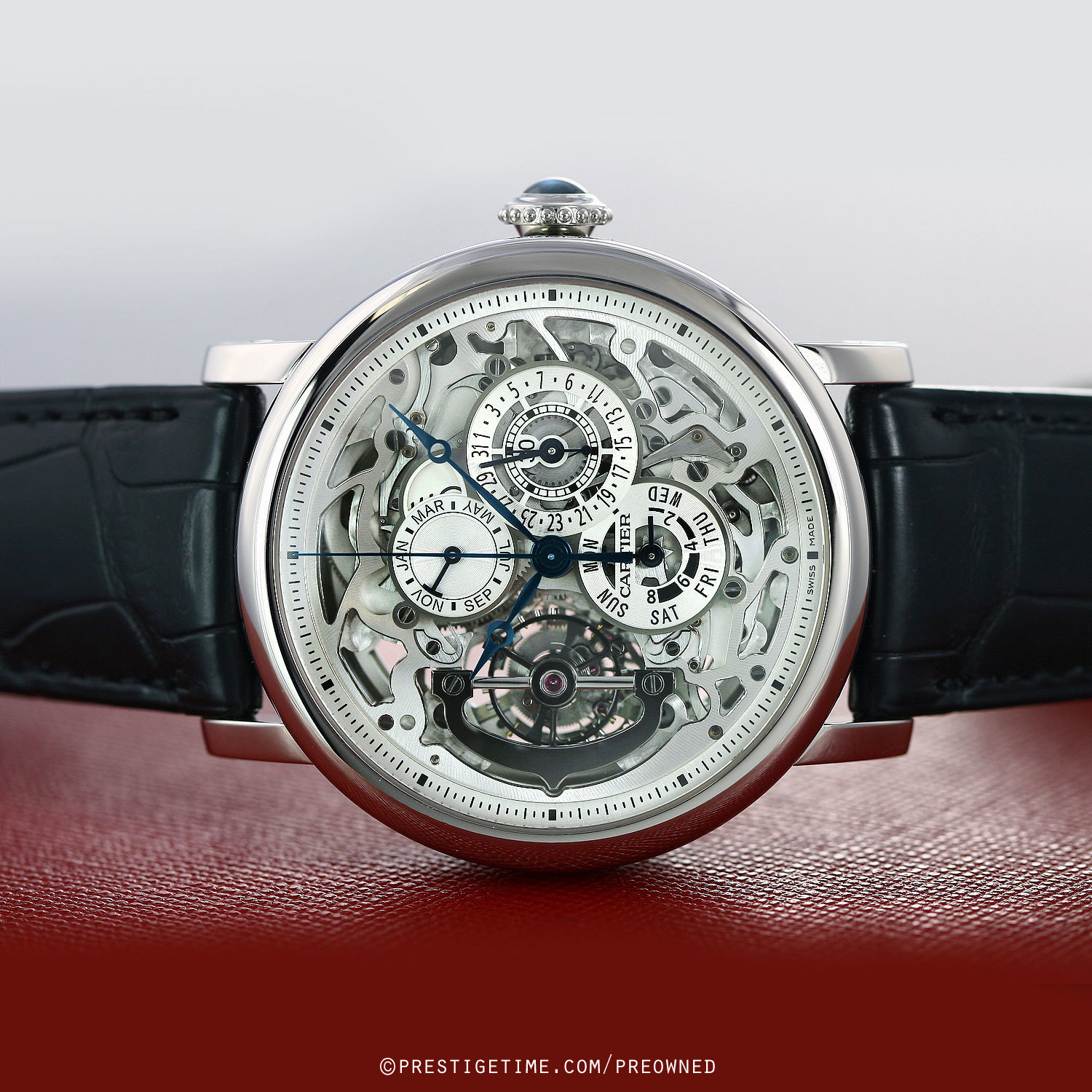 Polished platinum case. Platinum crown with beaded grip & set with a blue sapphire cabochon. Blued steel hands. Skeleton dial. Silver dial flange with hour, minute & seconds track. Silvered sub-dials.