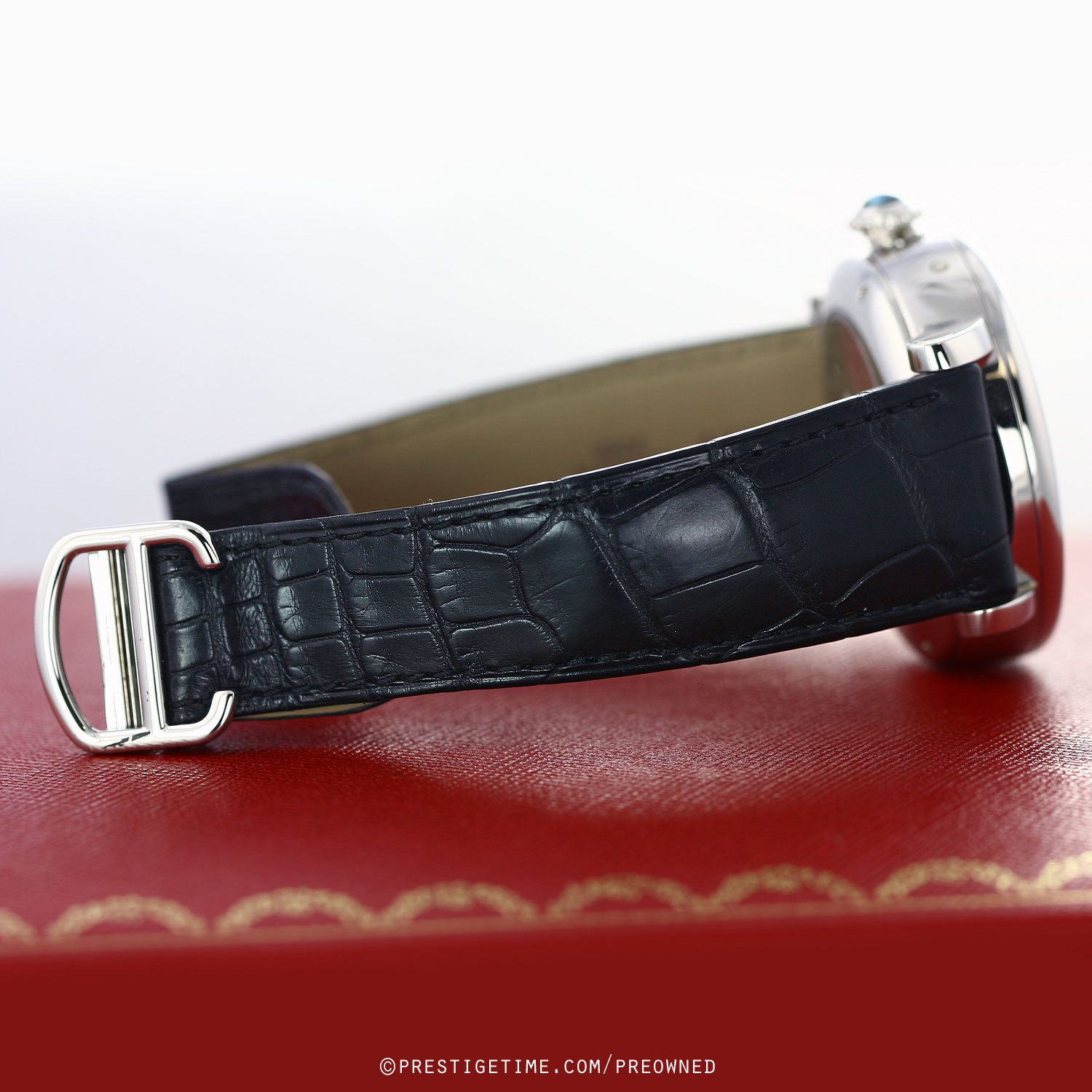 Fitted on an black alligator strap which has only been worn a handful of times, almost new with a polished platinum deployant buckle.