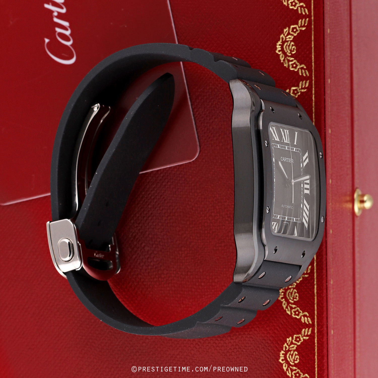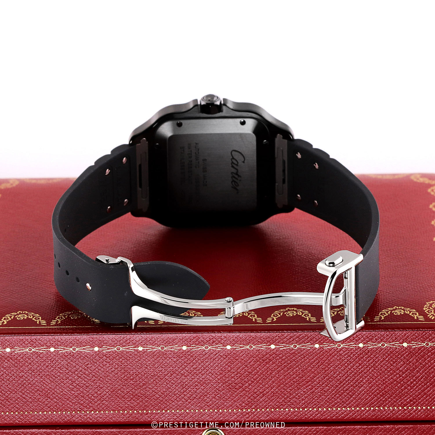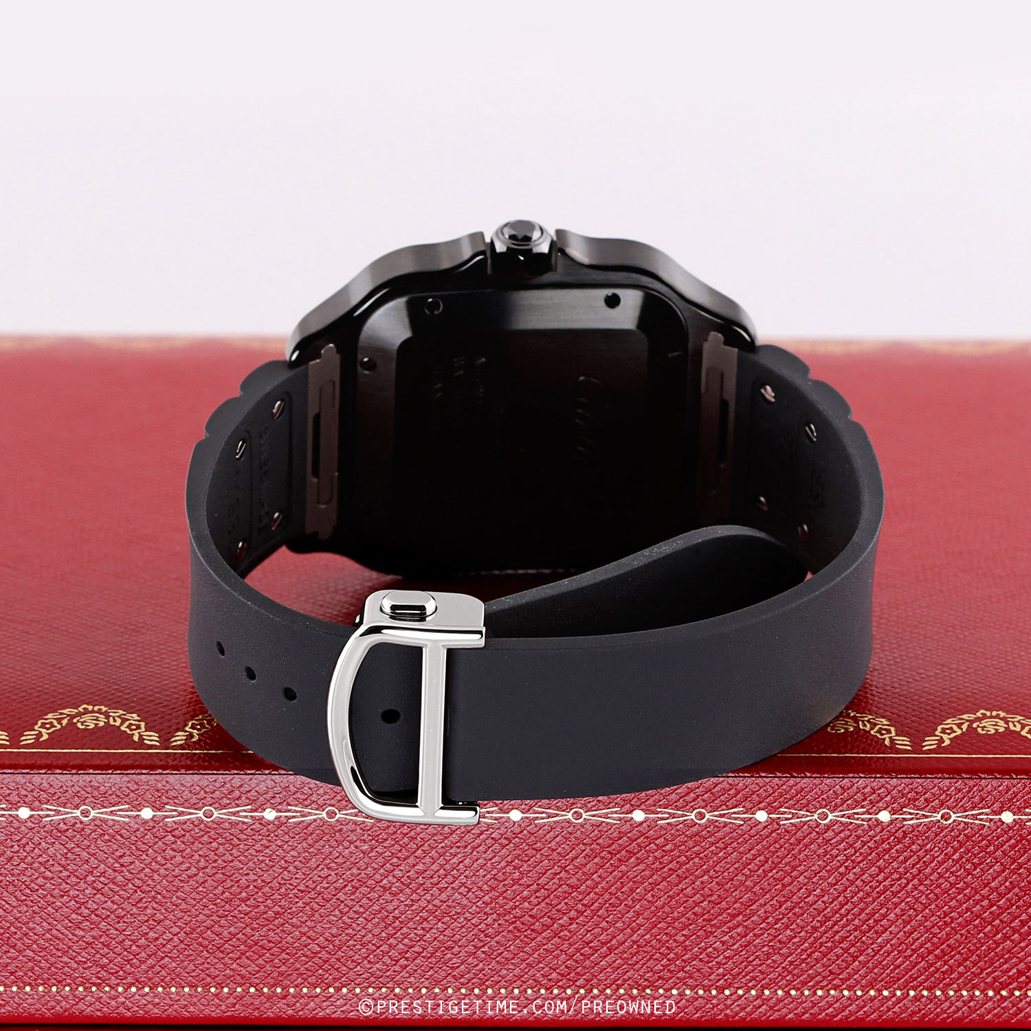 - Fitted on a Cartier original black rubber strap, featuring polished screw accents and with an interchangeable stainless deployant buckle. The strap is excellent near-new condition with only very light signs of wear & with its full wear lifespan remaining. We would be comfortable rating this strap as in 99% condition.